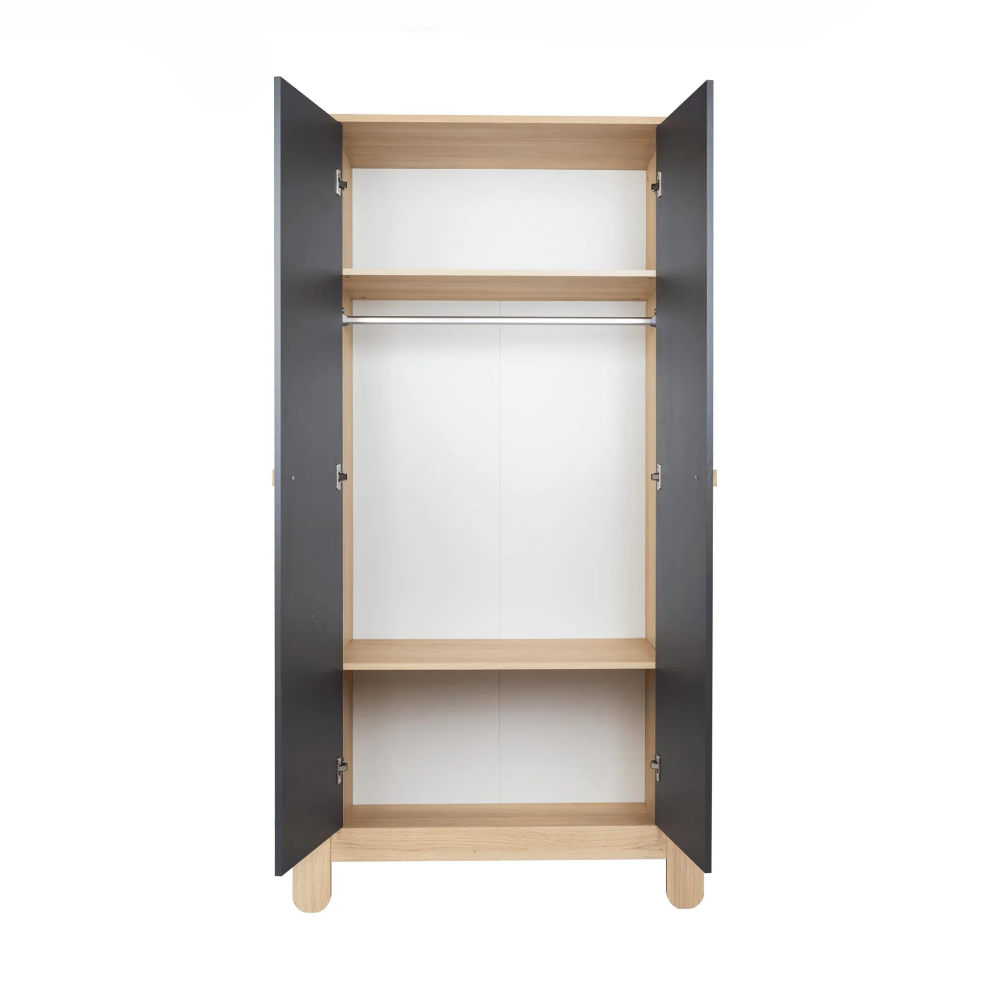 Hinter den beiden Türen verbirgt sich ein durchdachtes Innenleben: Die praktische Kleiderstange kann für Kleidchen, Hemden und Jacken genutzt werden. Der feste Boden sowie die zwei Einlegeböden eignen sich hervorragend für Hosen, Strampler und vieles mehr.