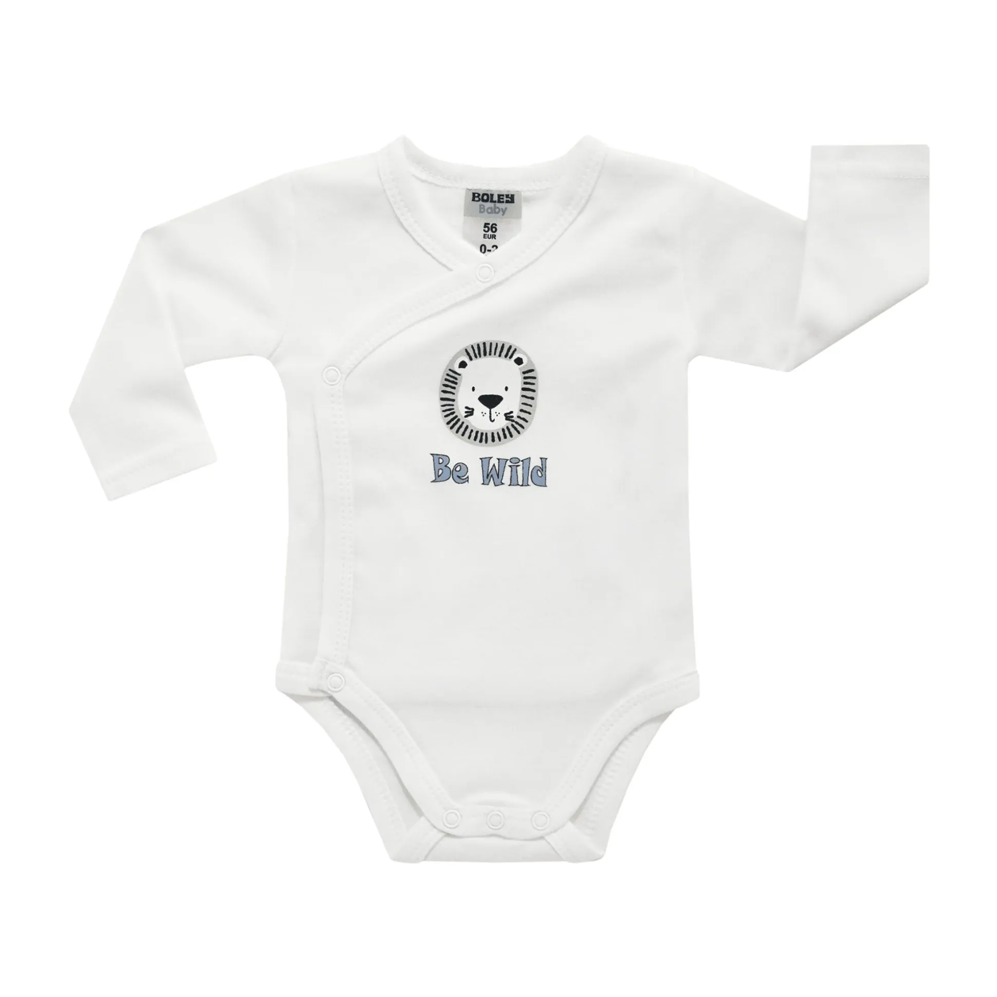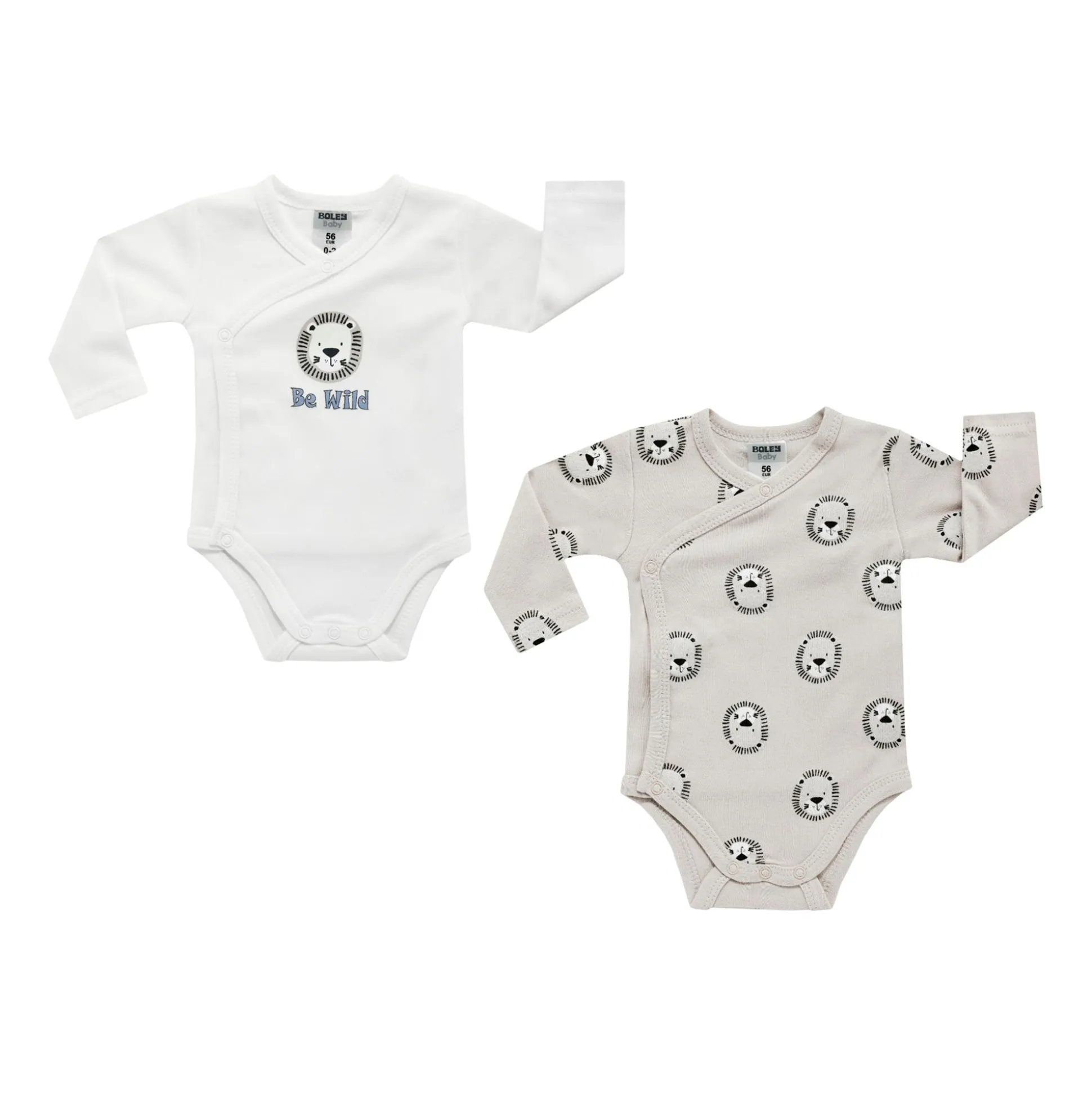 Der 2er Pack Wickelbodys Löwe von Boley überzeugt mit liebevollen Designs und hohem Tragekomfort – perfekt für jeden Tag. Mit dabei sind ein Body mit süßem Löwen-Print und „Be Wild“-Schriftzug und ein Body mit Allover-Löwenmotiv. Dank der Wickelöffnung mit Druckknöpfen gelingt das Umziehen deines kleinen Lieblings ganz unkompliziert.