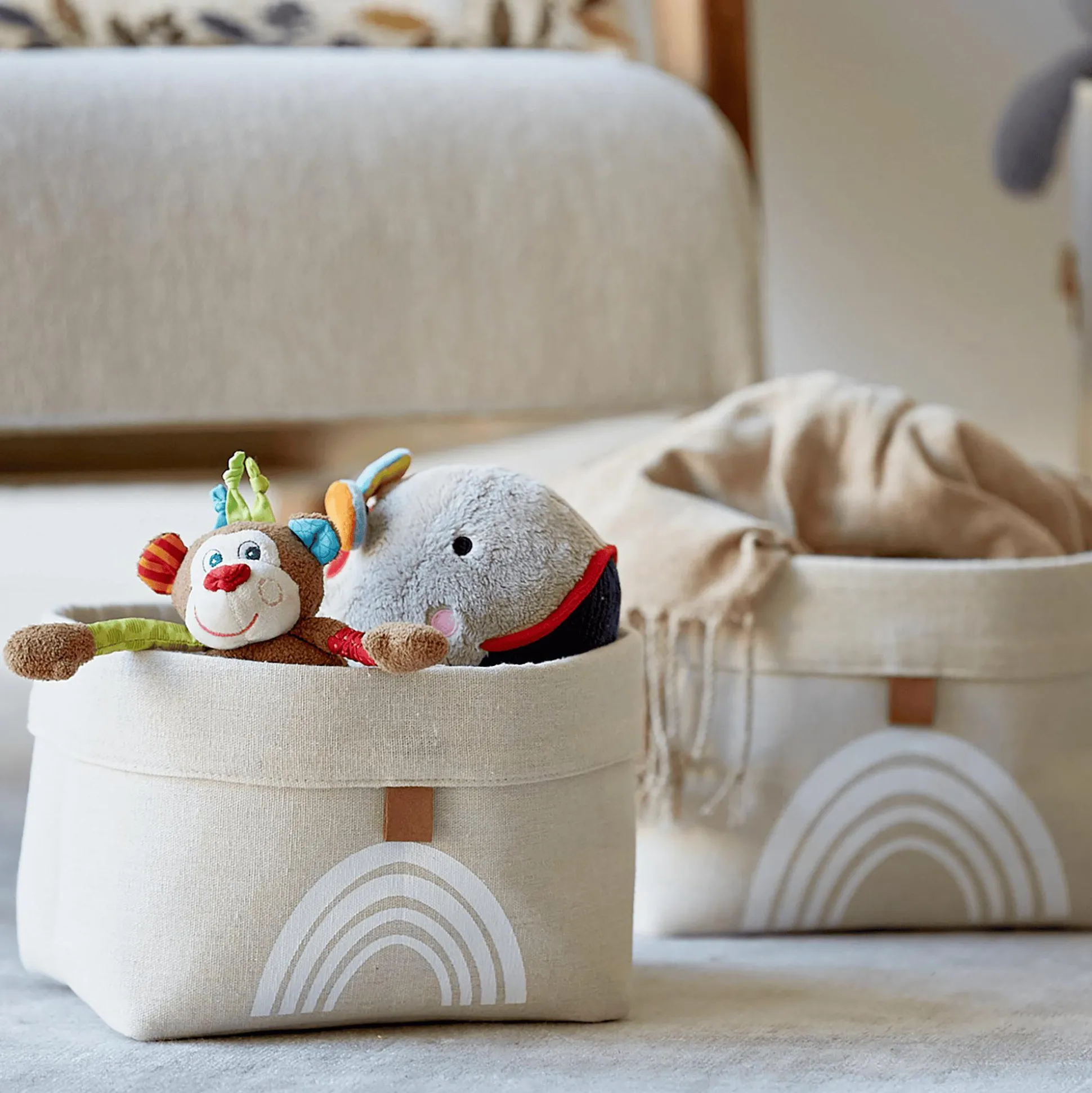 Durch das schlichte beigefarbene Design passen die Organizer in jedes Kinderzimmer. Sie werden durch niedliche Regenbögen auf der Vorderseite zu absoluten Hinguckern. Das hochwertige Material sorgt für eine lange Haltbarkeit.