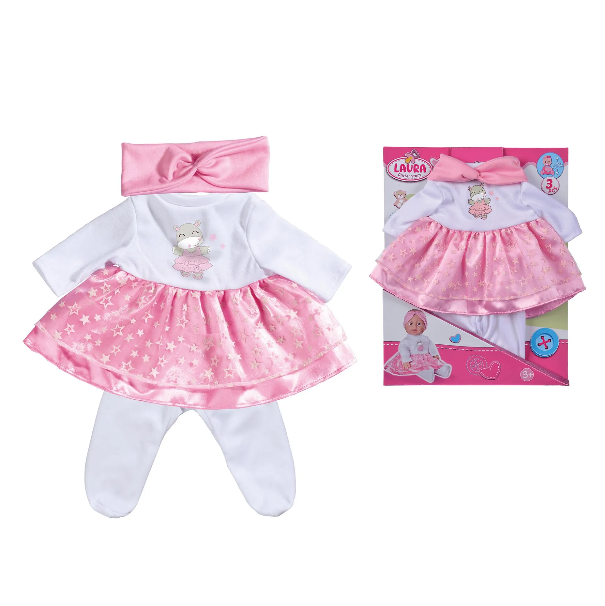 Mit dem 3-teiligen Glitzersternchenset Laura von Simba wird jede Puppe zum strahlenden Star! Dieses bezaubernde Outfit-Set besteht aus einem süßen Kleid mit weißem Oberteil und Nilpferd-Aufdruck, einem verspielten rosa Rock, einem rosa Stirnband mit Schleife sowie einer weißen Strumpfhose. So ist deine Puppe immer perfekt gestylt – ob für einen besonderen Anlass oder für einen Tag voller Spaß.