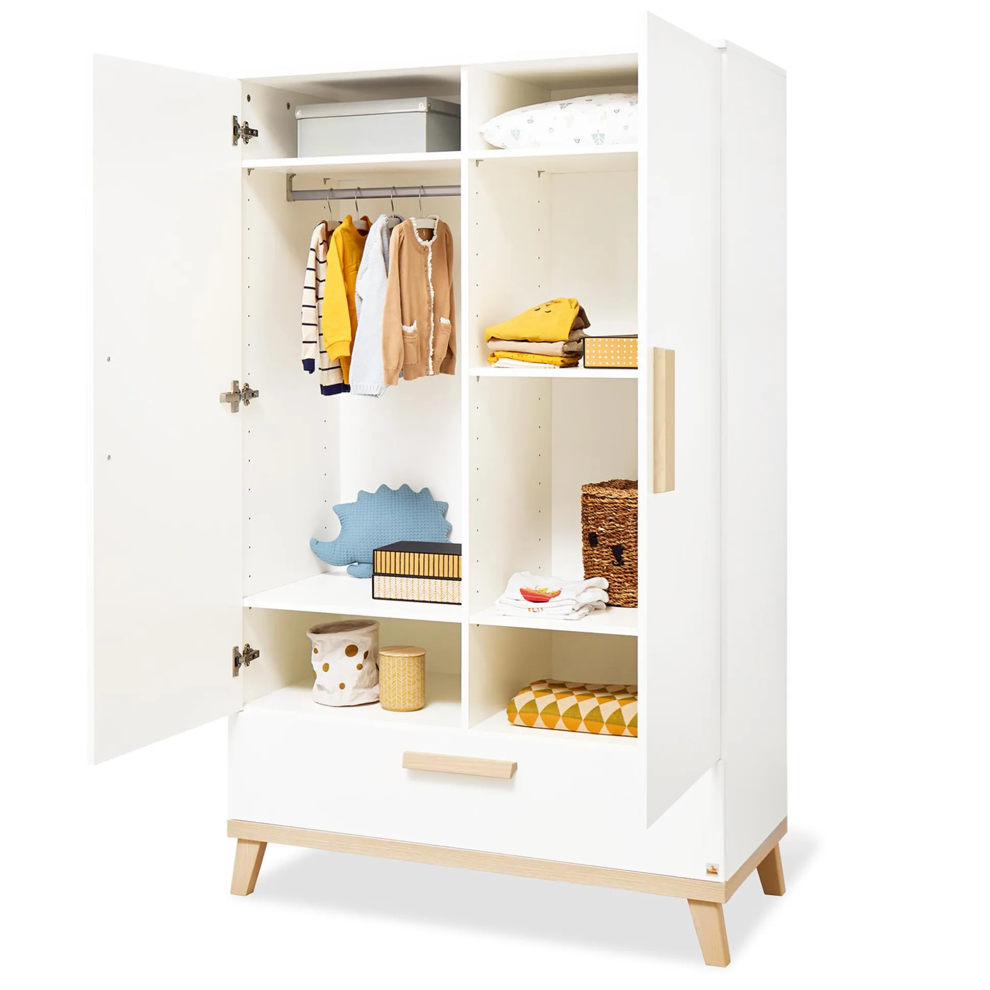 Der Kleiderschrank bietet besonders viel Stauraum und sorgt für eine ideale Ordnung im Kinderzimmer. Dank den zwei Türen mit Soft-Close und der Schublade mit Self-Soft-Close kannst du alles besonders leise und sicher schließen. Hinter den zwei Türen befinden sich fünf höhenverstellbare Einlegeböden und eine praktische Kleiderstange. Das zeitlose und wunderschöne Design passt optimal in jedes Kinderzimmer. Weitere Möbel aus dem Kinderzimmer Larsson sind separat erhältlich.