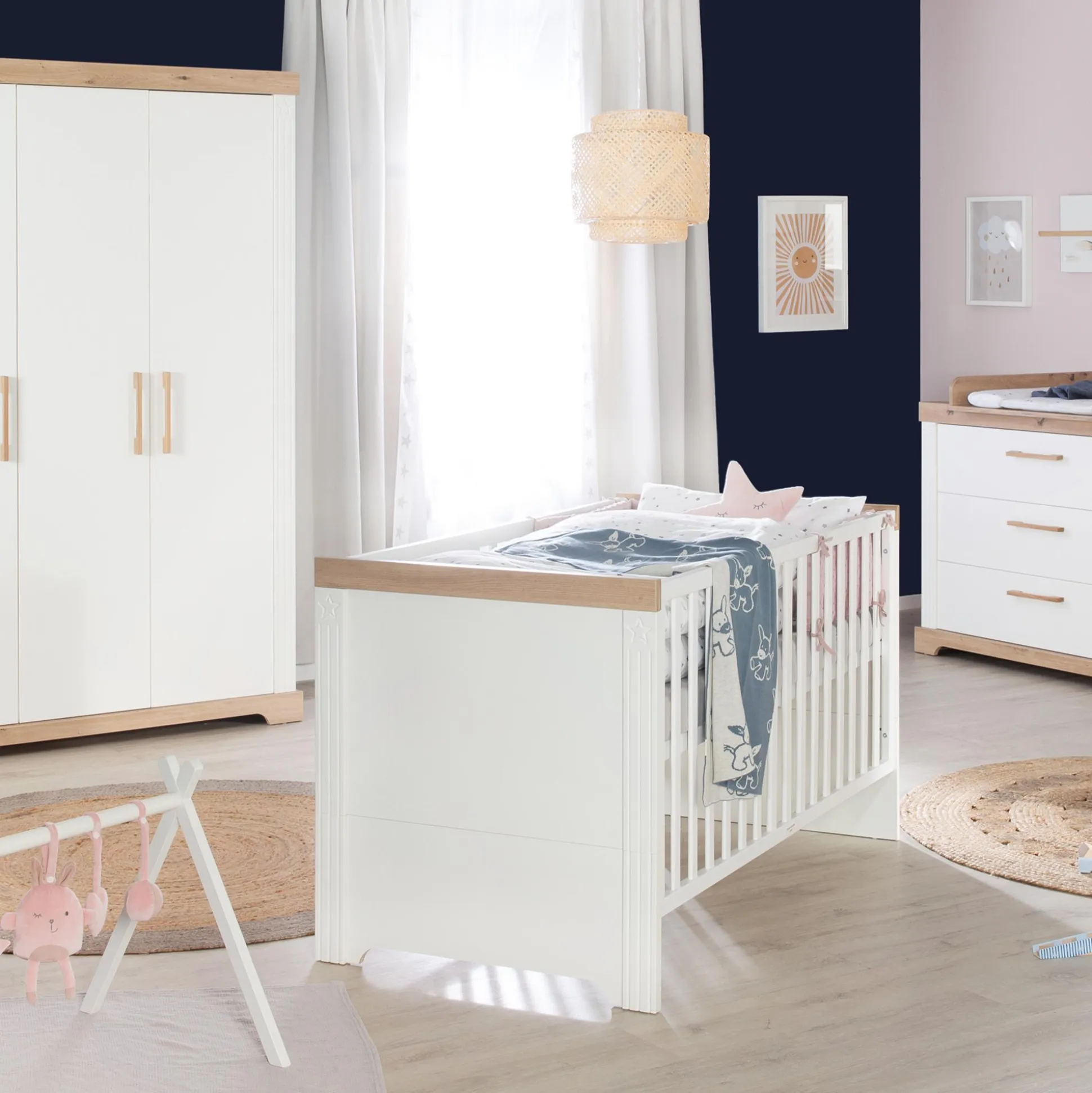 Das 3-teilige Spar-Set Babyzimmer Milan von roba besteht aus einem Kinderbett, einem 3-türigem Kleiderschrank und einer Wickelkommode. Einen abnehmbaren Wickelansatz erhältst du inklusive. Weitere Möbel aus dem Kinderzimmer Milan sind separat erhältlich.