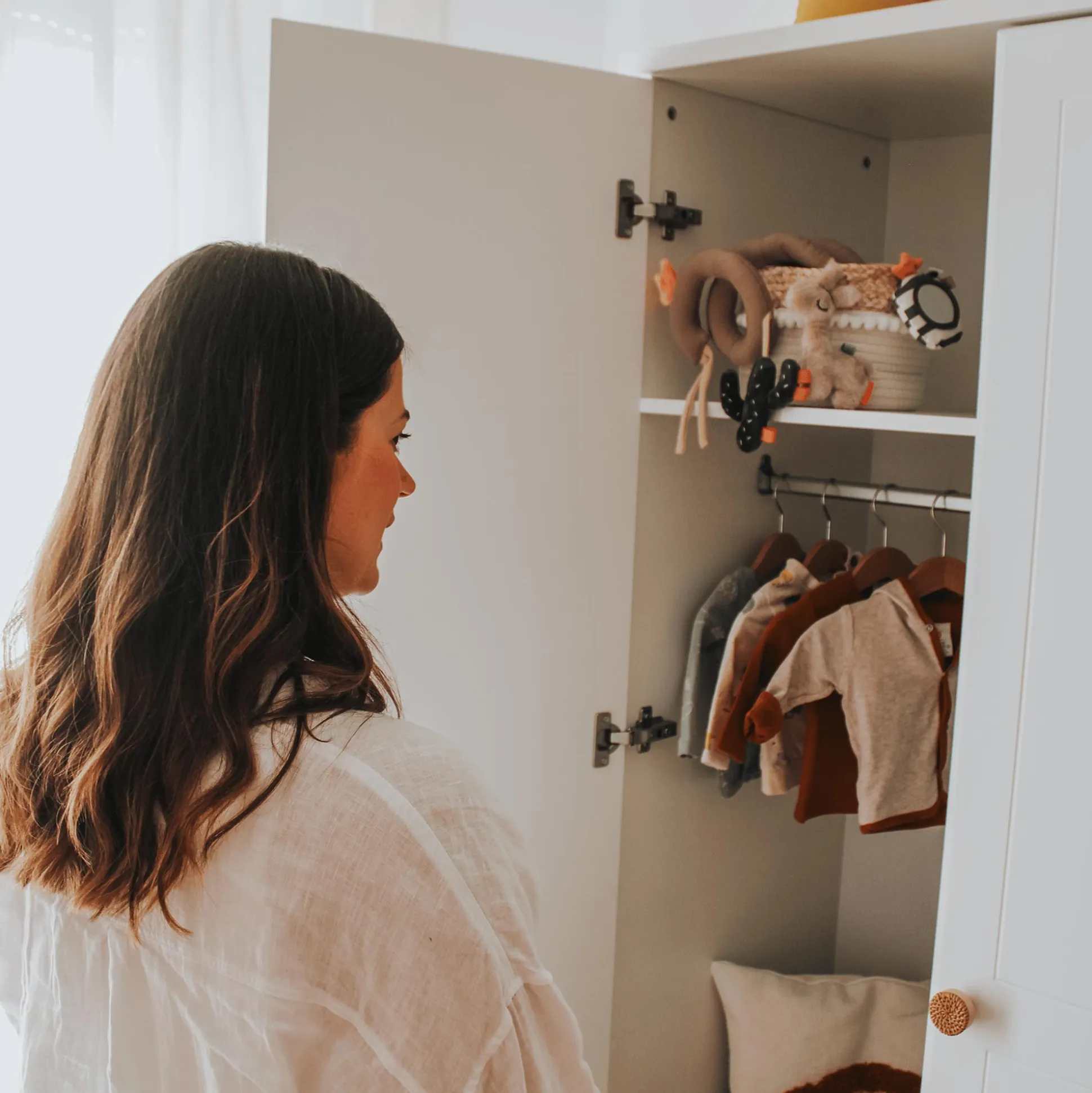Hinweis: Mit verschiedenen Griffen kannst du deinen Kleiderschrank individuell gestalten und deinem Stil anpassen. Der Kleiderschrank wird mit den schwarzen Griffen aus dem 1. Bild geliefert.