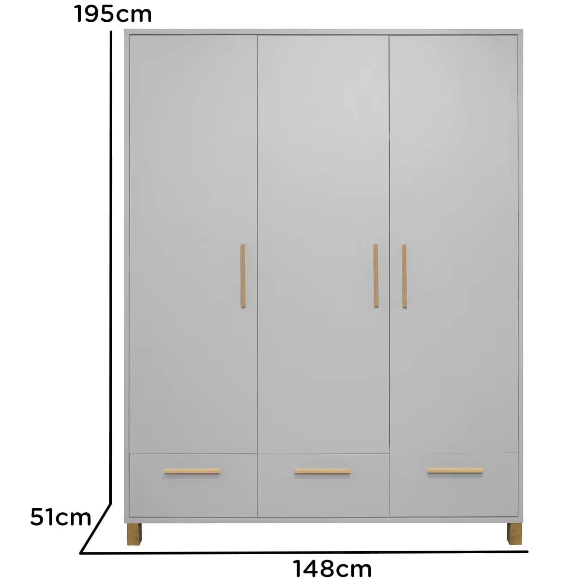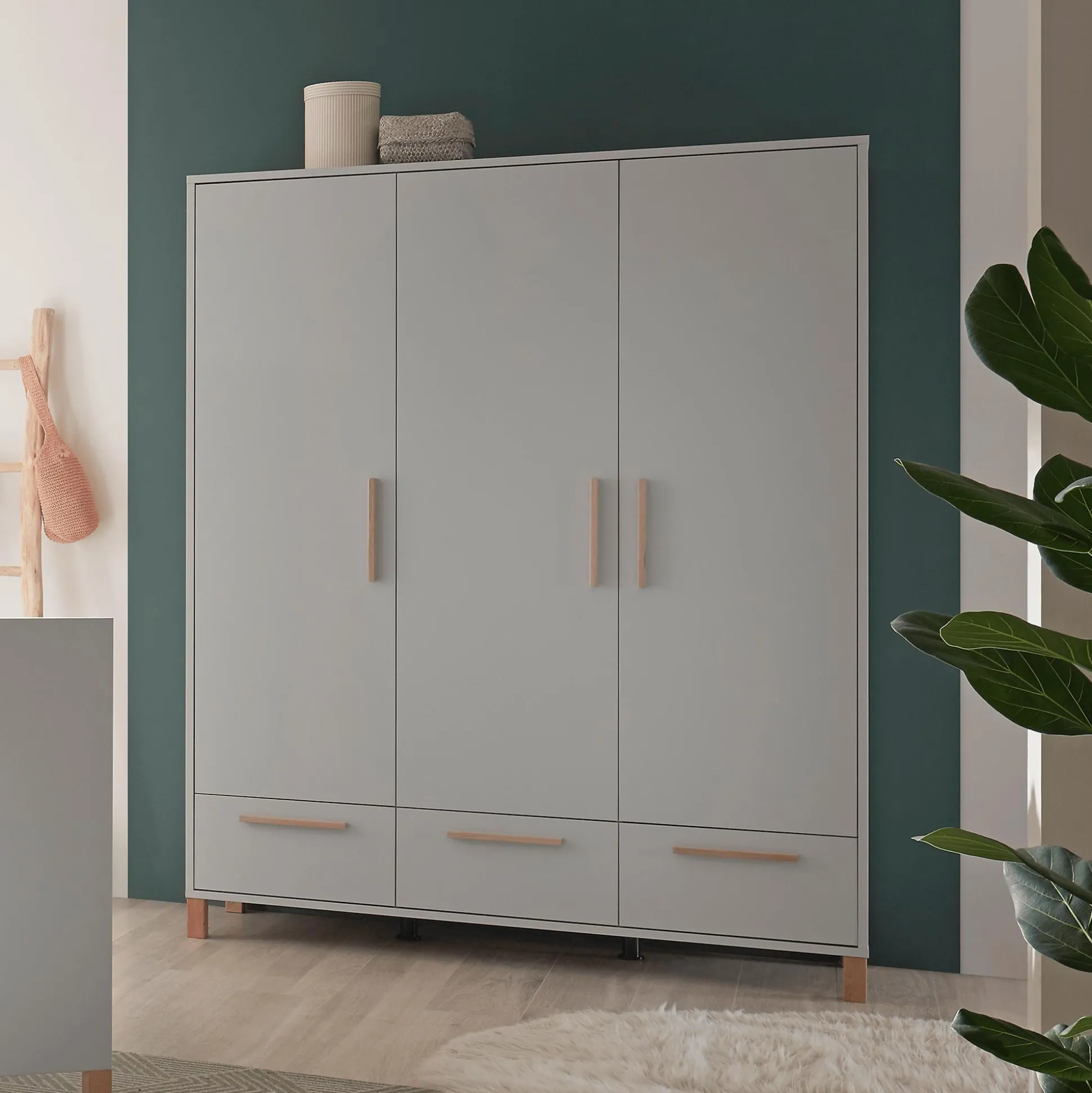 Dabei verbindet dieses Möbelstück Ordnung hervorragend mit Stil. Die matten, kreidegrauen Oberflächen des Schrankes verleihen dem Kinderzimmer eine stylische und lebendige Atmosphäre, während die Holzgriffe und -füße einen naturbelassenen Akzent setzen.