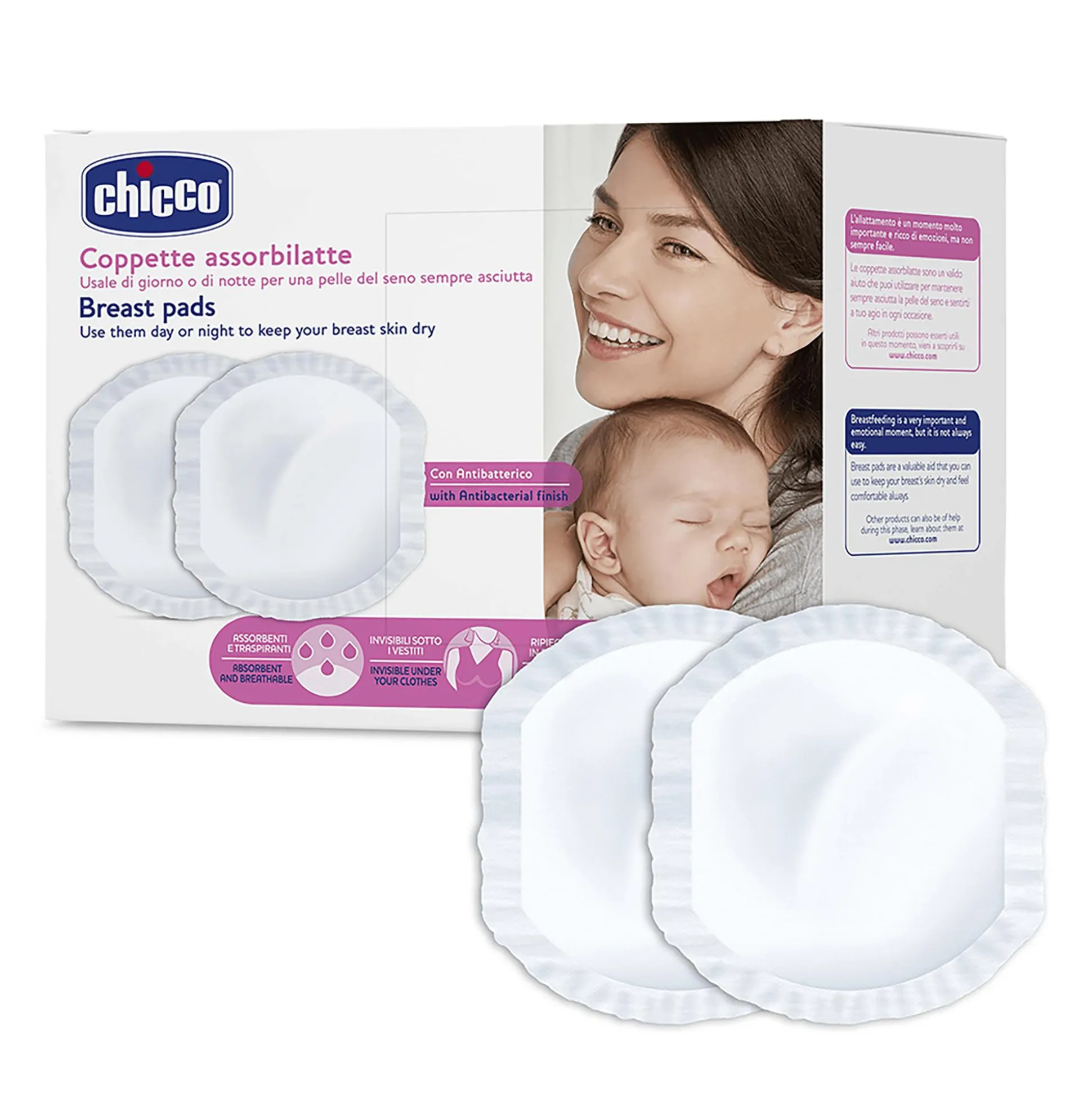 Die antibakteriellen Einweg-Stilleinlagen von chicco im 30er Pack sind atmungsaktiv, sehr dünn, super saugfähig und besonders hautsympathisch. Eine Außenschicht aus atmungsaktivem Polyethylen garantiert dir eine ausreichende Belüftung von Brustwarze und Haut und beugt Entzündungen vor. Die Innenschicht gewährt dank eines besonders saugfähigen Spezialmaterials höchste Sicherheit und verhindert, dass die Flüssigkeit an die Oberfläche und somit wieder an die Haut gelangt.