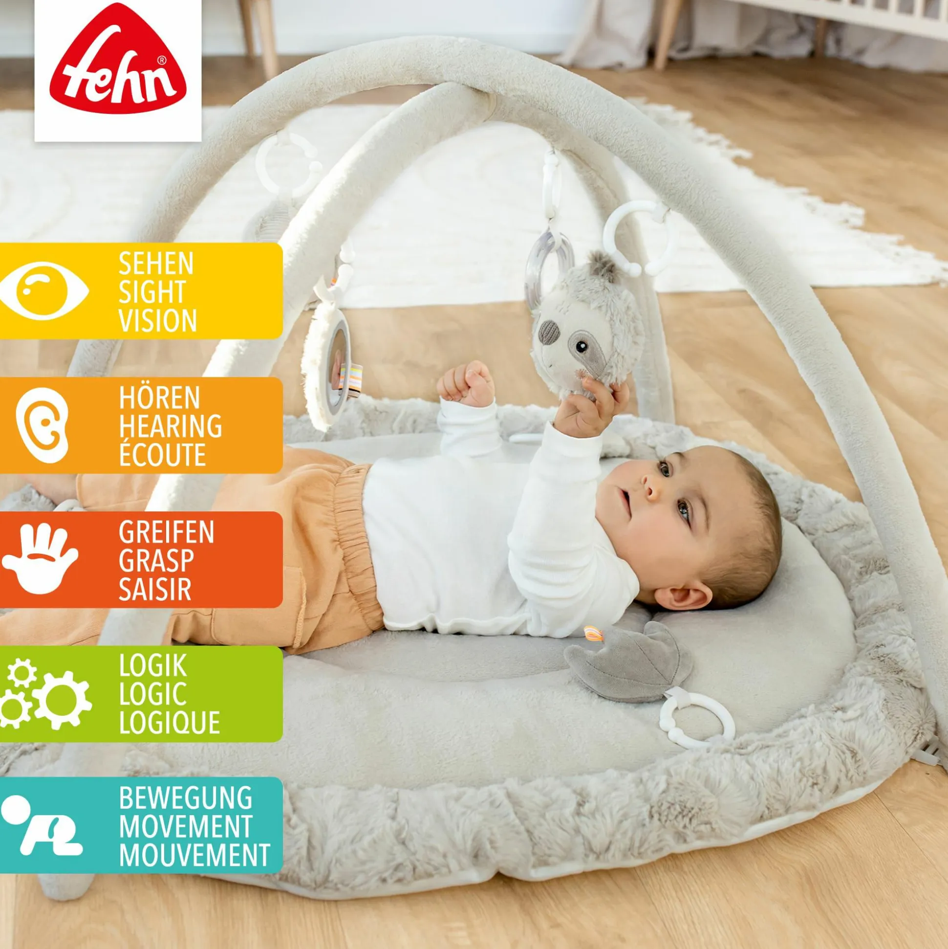 So werden Motorik, Neugier und alle Sinne deines Lieblings spielerisch gefördert, während gleichzeitig die Hand-Augen-Koordination trainiert wird. Ideal zum Spielen im Liegen, Sitzen und Krabbeln!