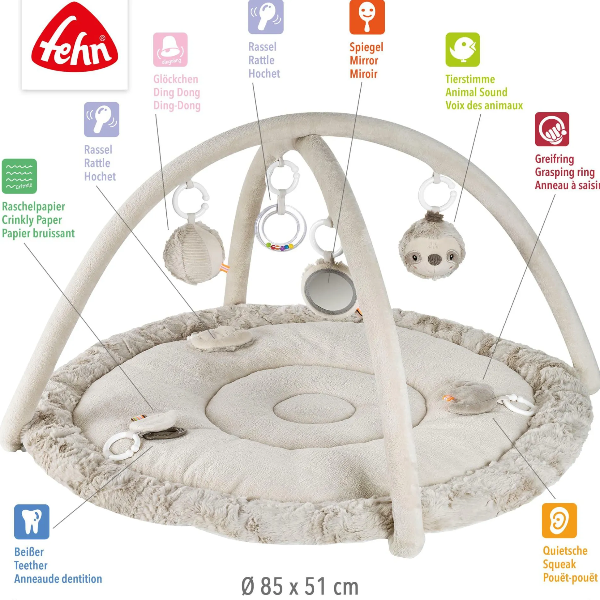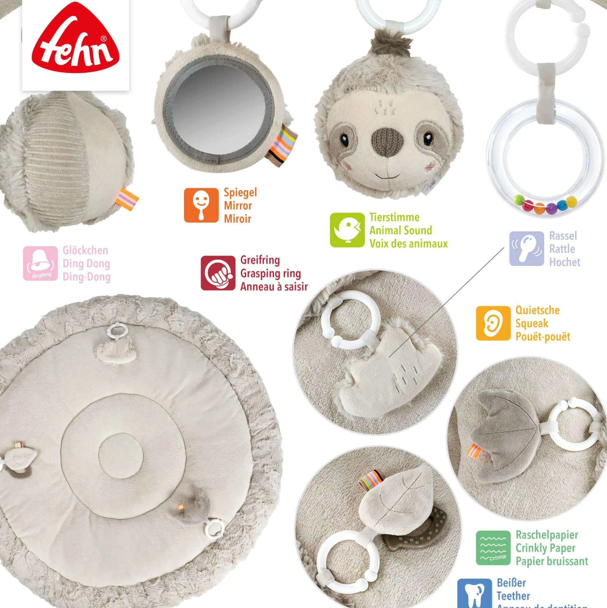 Die 3D Activity Decke Faultier von fehn bietet deinem kleinen Schatz bereits ab der Geburt eine kuschelweiche, gepolsterte Liegefläche und abwechslungsreiche Spielmöglichkeiten.