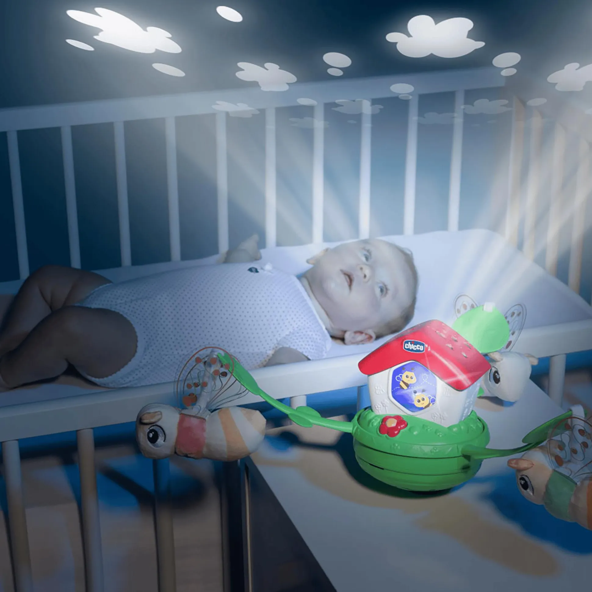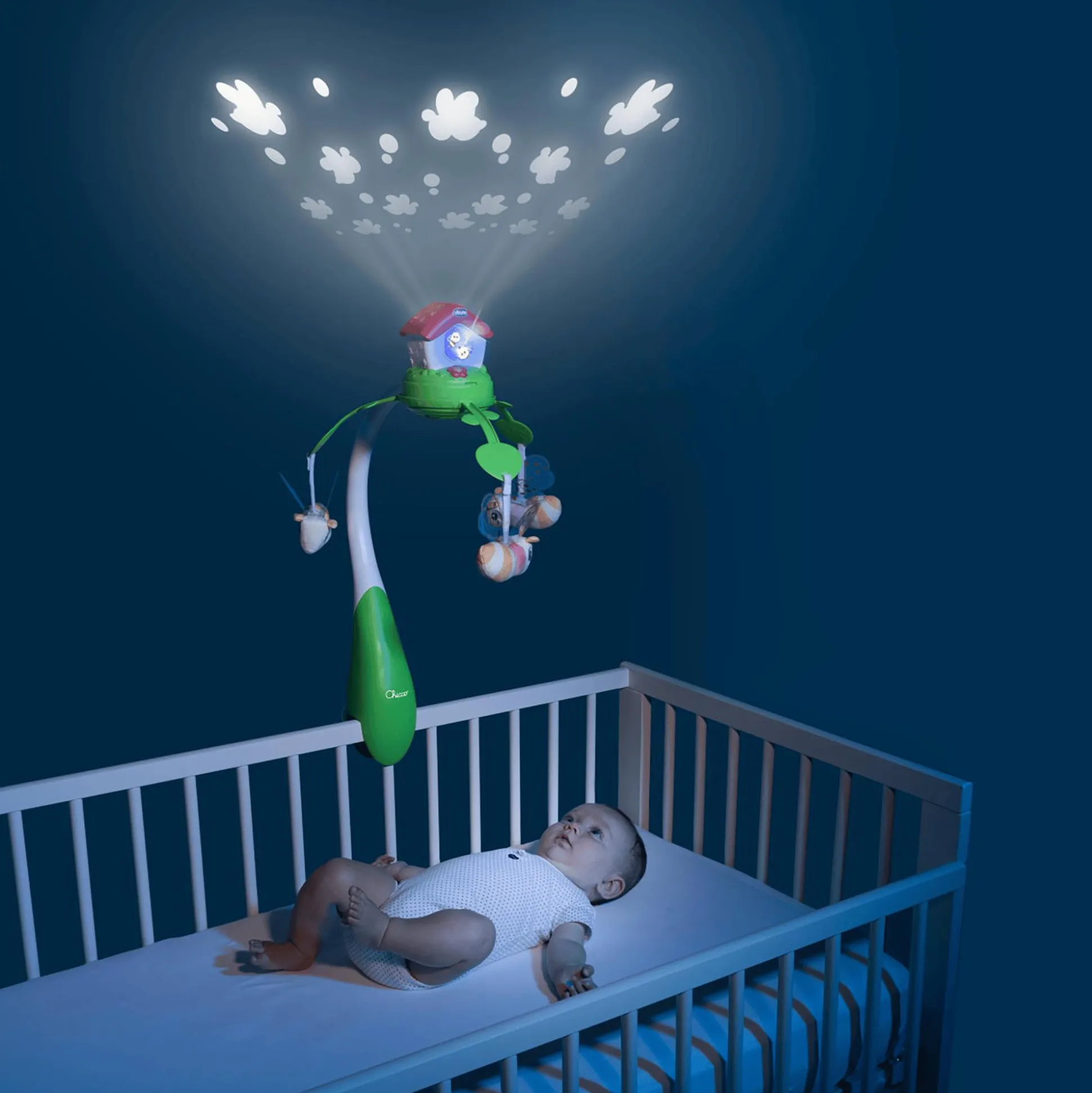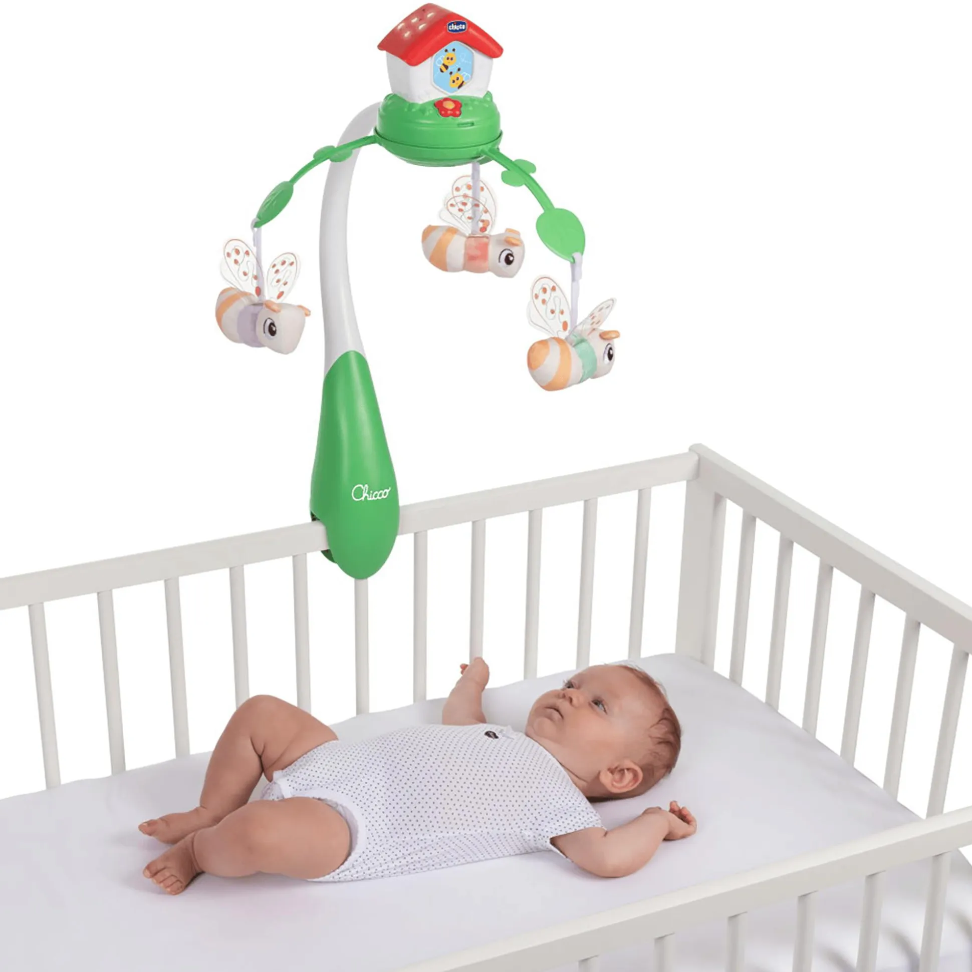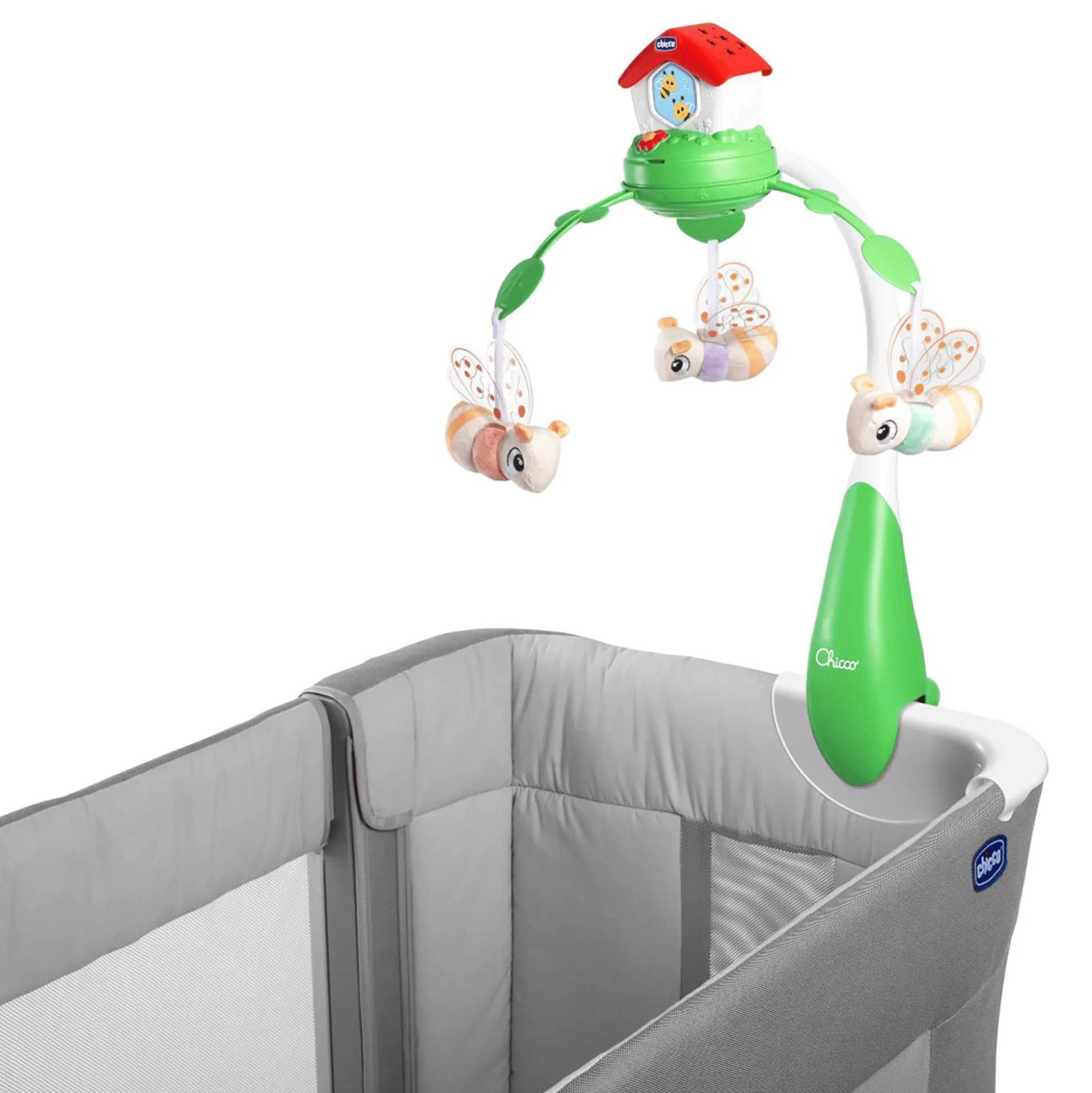 Die drei entzückende Textilbienen sind abnehmbar und sorgen für zusätzliche Spielfreude. Mit über 30 Minuten entspannender Musik kann dein Baby eine wohltuende Pause vom Alltag genießen. Und keine Sorge, wenn es mal etwas ruhiger sein soll – die Musikeffekte lassen sich nach Belieben ausschalten, sodass sich dein Liebling ganz auf die beruhigenden Lichteffekte konzentrieren kann.Das modulare Befestigungssystem dieses Mobiles macht es passend für die meisten Kinderbetten aus Holz, während die mitgelieferte Halterung es problemlos an chicco Next2me Kinderbetten anbringt.
