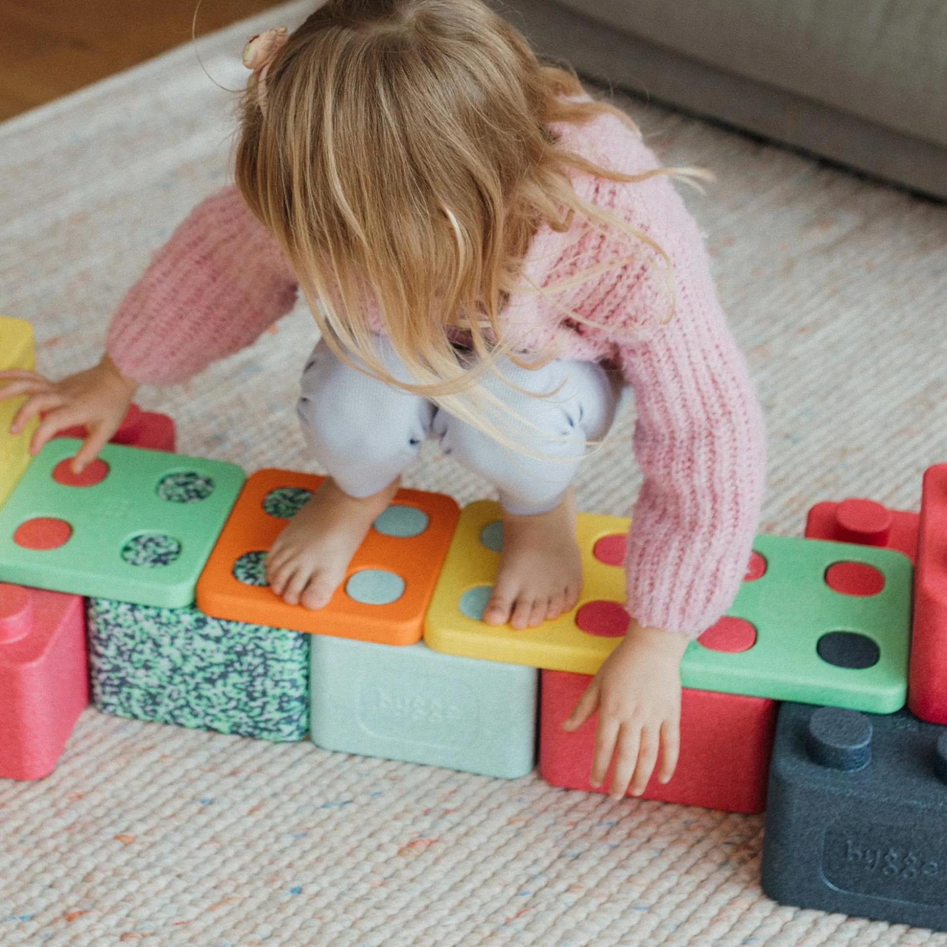 Die großen, bunten Bausteine bieten unzählige Spielmöglichkeiten und Konstruktionen sowohl drinnen im Kinderzimmer als auch draußen im Garten oder Sandkasten. Dabei fördern sie besonders die Motorik, Kreativität und Selbstvertrauen durch aktives, selbstständiges Spiel.
