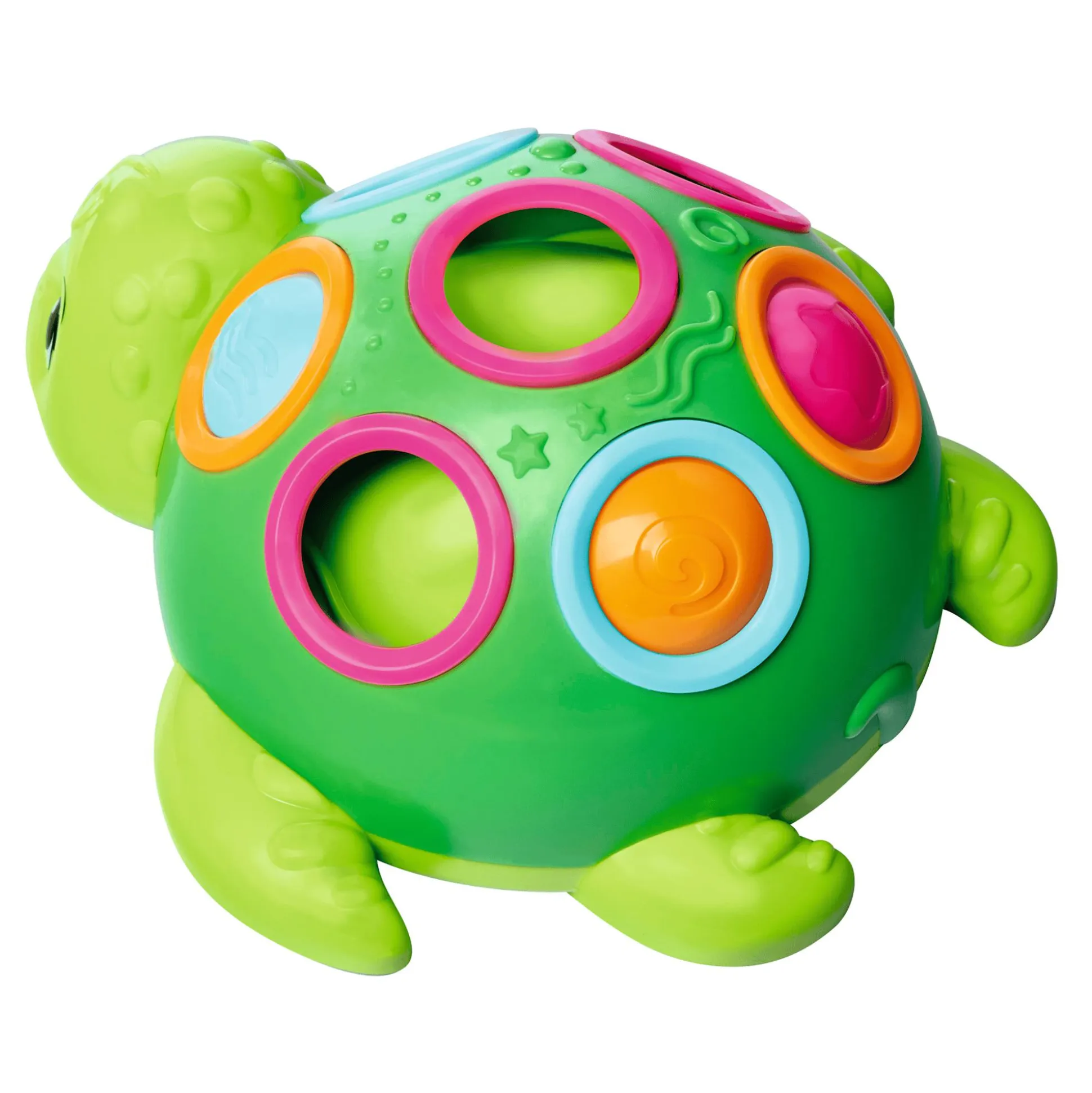 Mit ABC spielerisch die Welt entdecken! ABC weckt mit altersgerechten Produkten die Neugierde von Babys und Kleinkindern von 0-36 Monaten und unterstützt dabei die Entwicklung in den ersten Lebensjahren. Spielerisch werden erste Lernziele erreicht, Formen und Strukturen entdeckt sowie Koordinationsmuster geschult. Auf dem Panzer der süßen Slide and Match Schildkröte gibt es für die Kids so einiges zu entdecken. Darauf befinden sich verschiedene bunte Elemente, die sich entweder Ploppen oder von einem Loch zum nächsten schieben lassen. Außerdem können die Elemente auch noch nach Farbe sortiert werden. Dabei wird nicht nur die Motorik der Kleinen trainiert, das macht auch noch jede Menge Spaß. Die ABC Schildkröte ist für Kinder ab ca. einem Jahr geeignet.