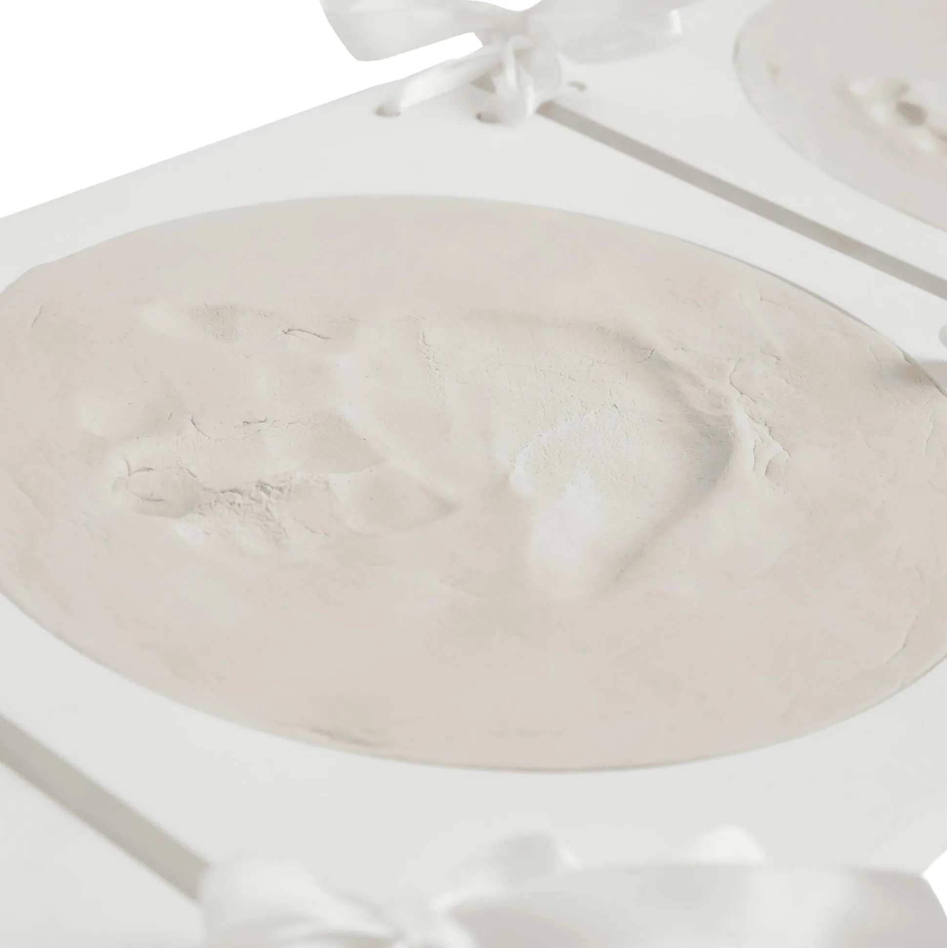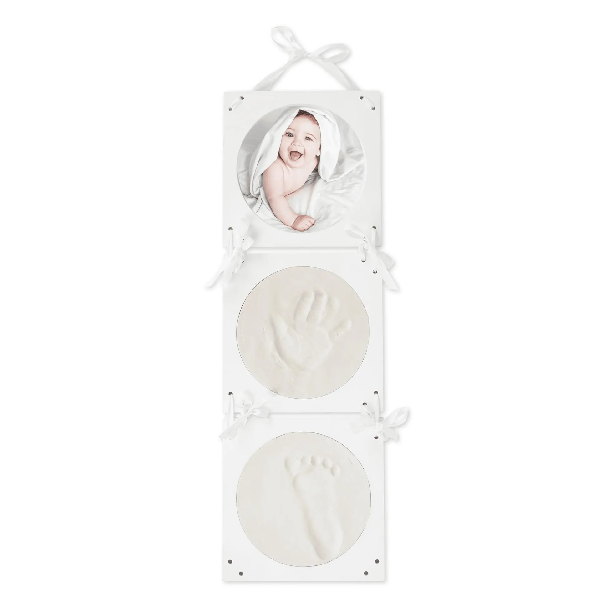 Mit dem Abdruckset mit Hängebilderrahmen von bieco kannst du spielend einfach wundervolle Erinnerungen an deinen kleinen Schatz festhalten. In diesem Set, bestehend aus weißen runden Bilderrahmen mit drei Fenstern, liegt alles bereit, um zauberhafte Gipsabdrücke der kleinen Füßchen und Händchen anzufertigen. Die Menge der Modelliermasse ist perfekt dosiert, um zwei Rahmen vollständig zu gestalten. Neben den Gipsabdrücken bietet der Rahmen Platz für ein Bild deines kleinen Lieblings oder deiner ganzen Familie.