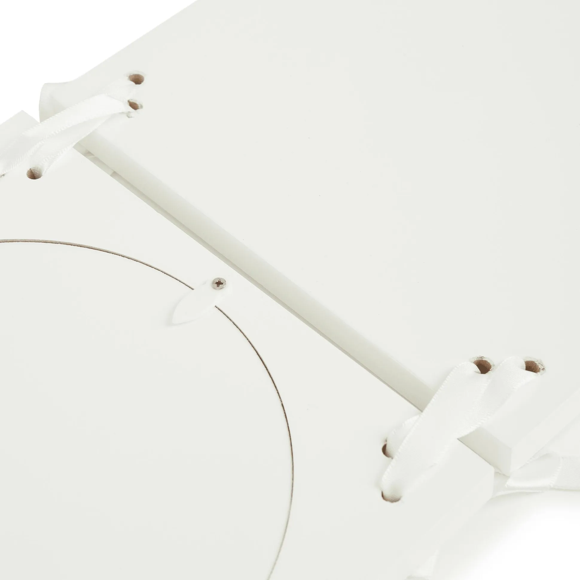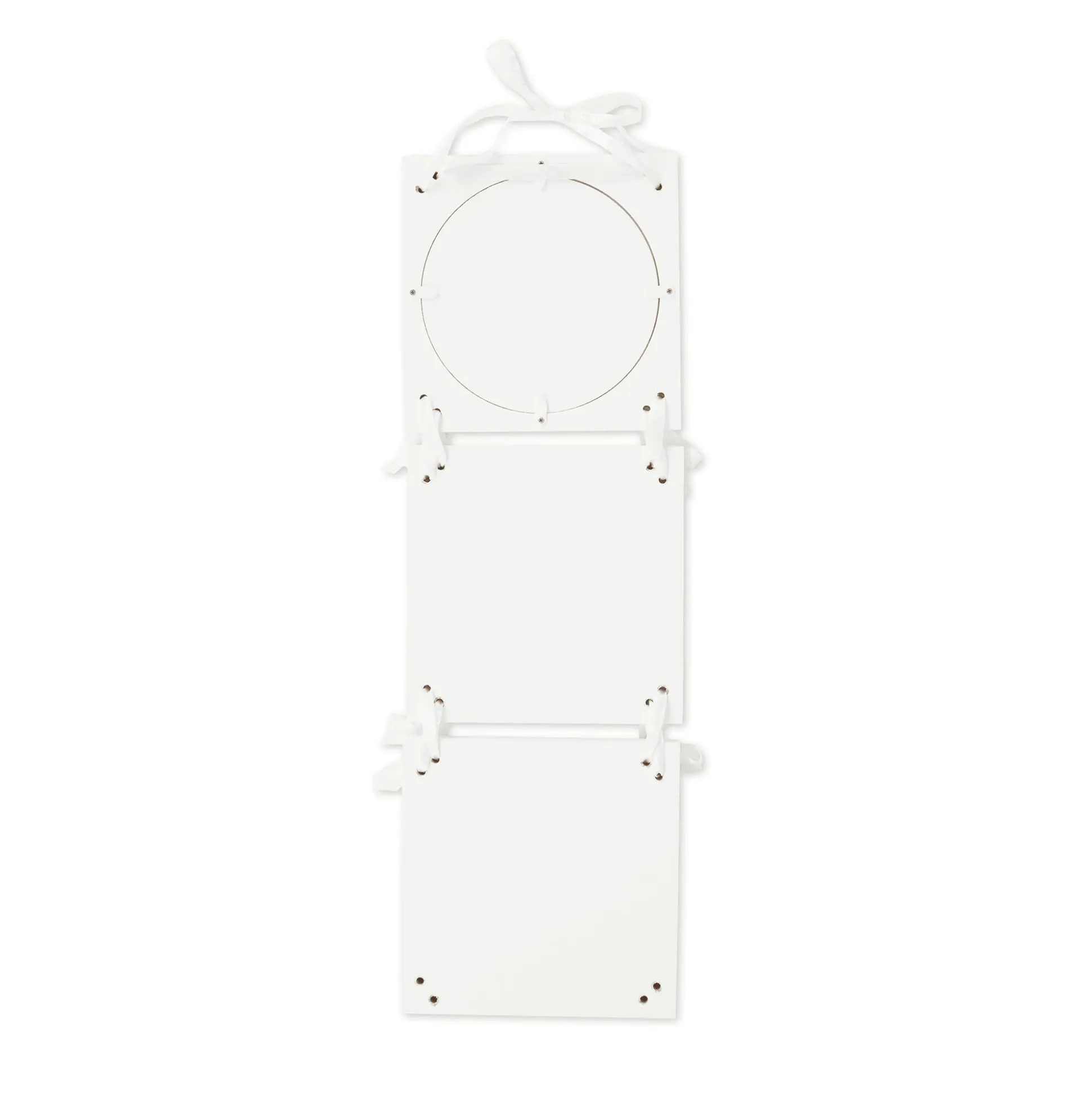 Mit einer Gesamtlänge von etwa 55 cm eignet sich der Bilderrahmen perfekt zum Aufhängen und seine hochwertige Holzkonstruktion in strahlendem Weiß verleiht ihm einen zeitlosen Charme. Die einzelnen Rahmenelemente sind mit hübschen Schleifenbändern verbunden.