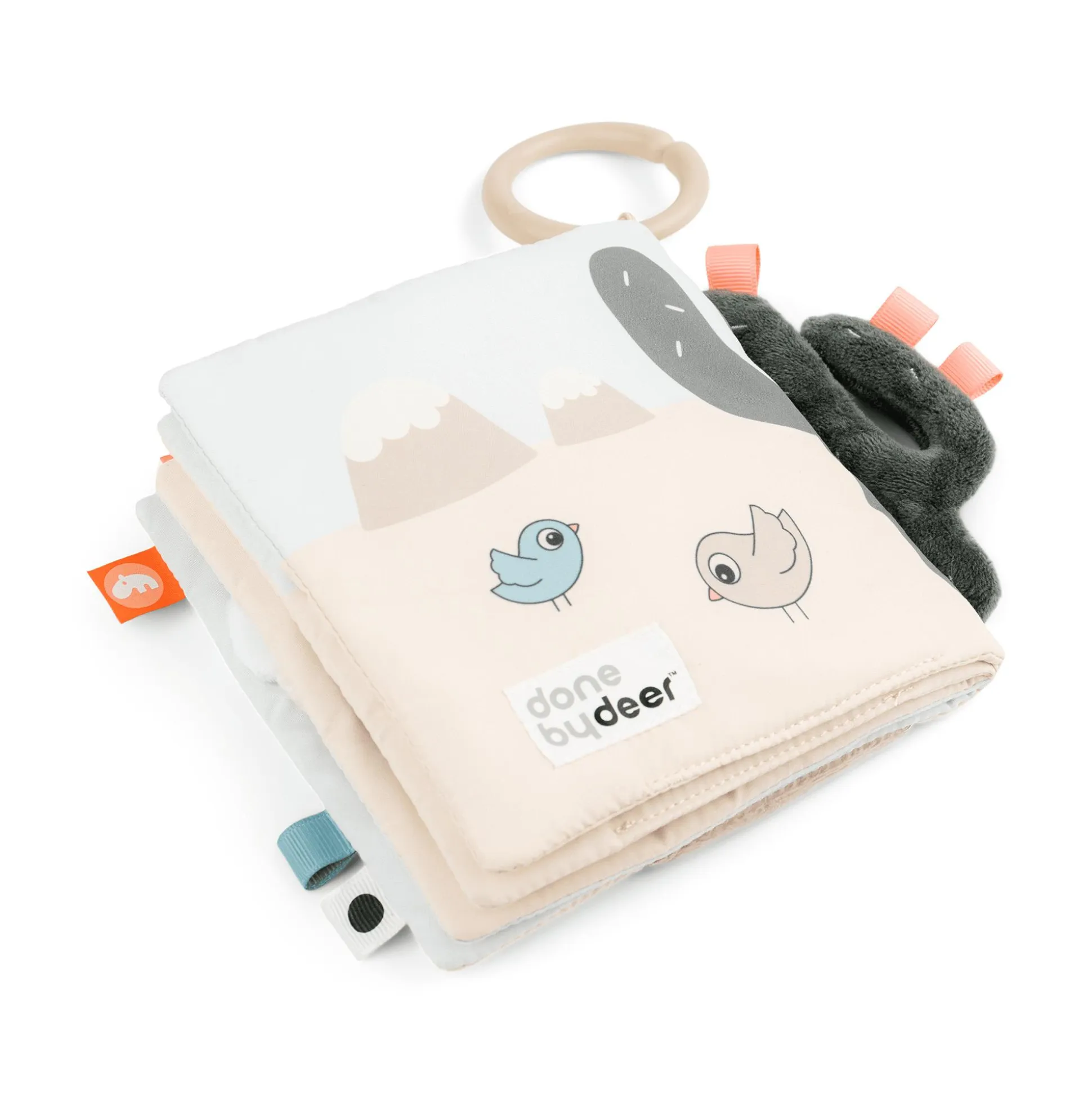 Ruhige, sandige Farben werden mit Kaktusgrün und einem Spritzer frischem Korallenrot kombiniert. Mit dem Ring kann das Activity Buch beispielsweise an einem Spielzeughalter, einem Kinderwagen, einer Babyschale oder einem Autositz befestigt werden.