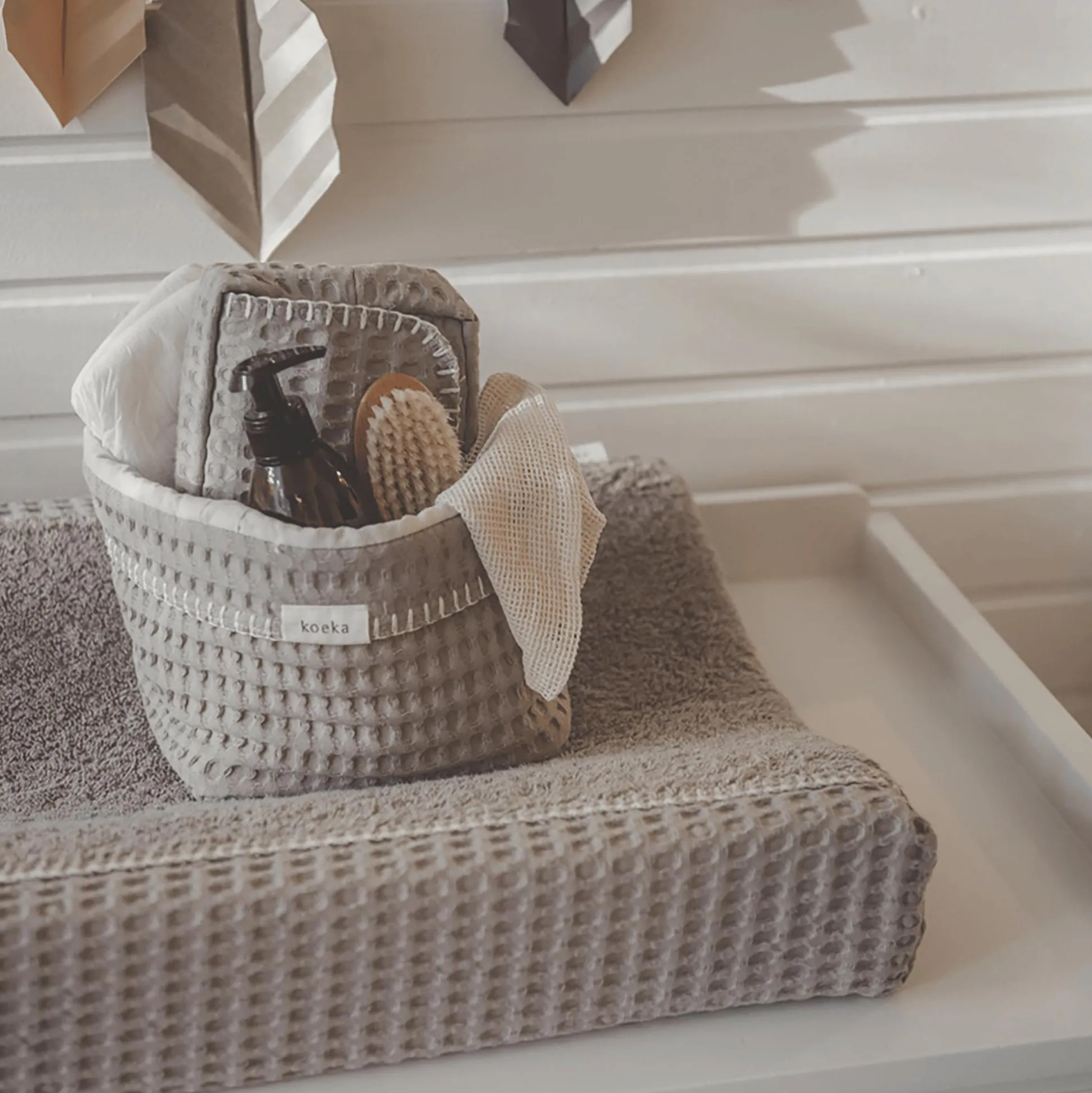 Der kleine Aufbewahrungskorb Antwerp clay von koeka in grau ist auf dem Wickeltisch oder im Kinderzimmer ein toller Hingucker und eignet sich außerdem auch als optimaler Dekoartikel zur Aufbewahrung von Kleinteilen und Zubehör.