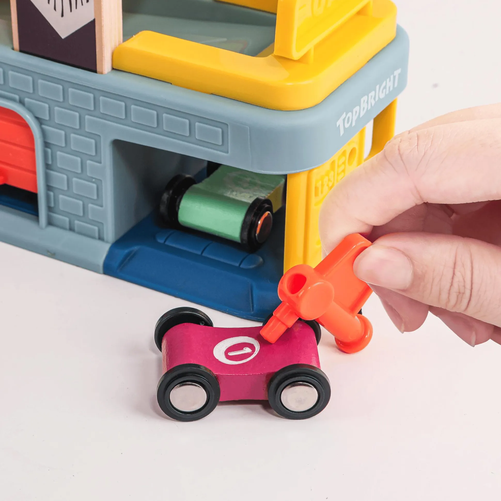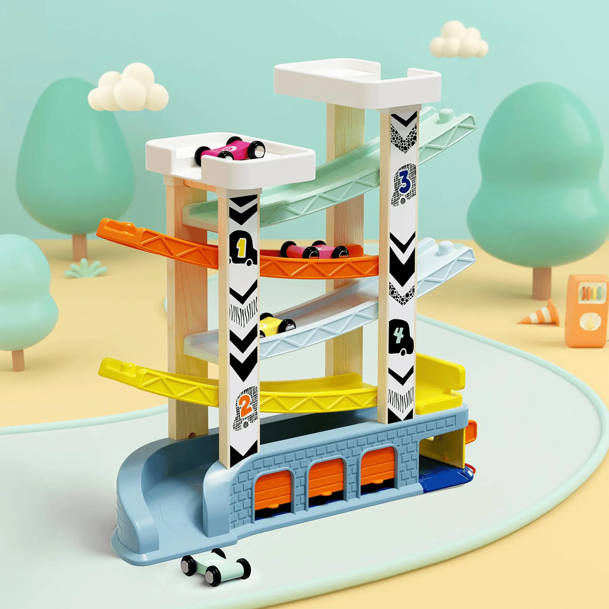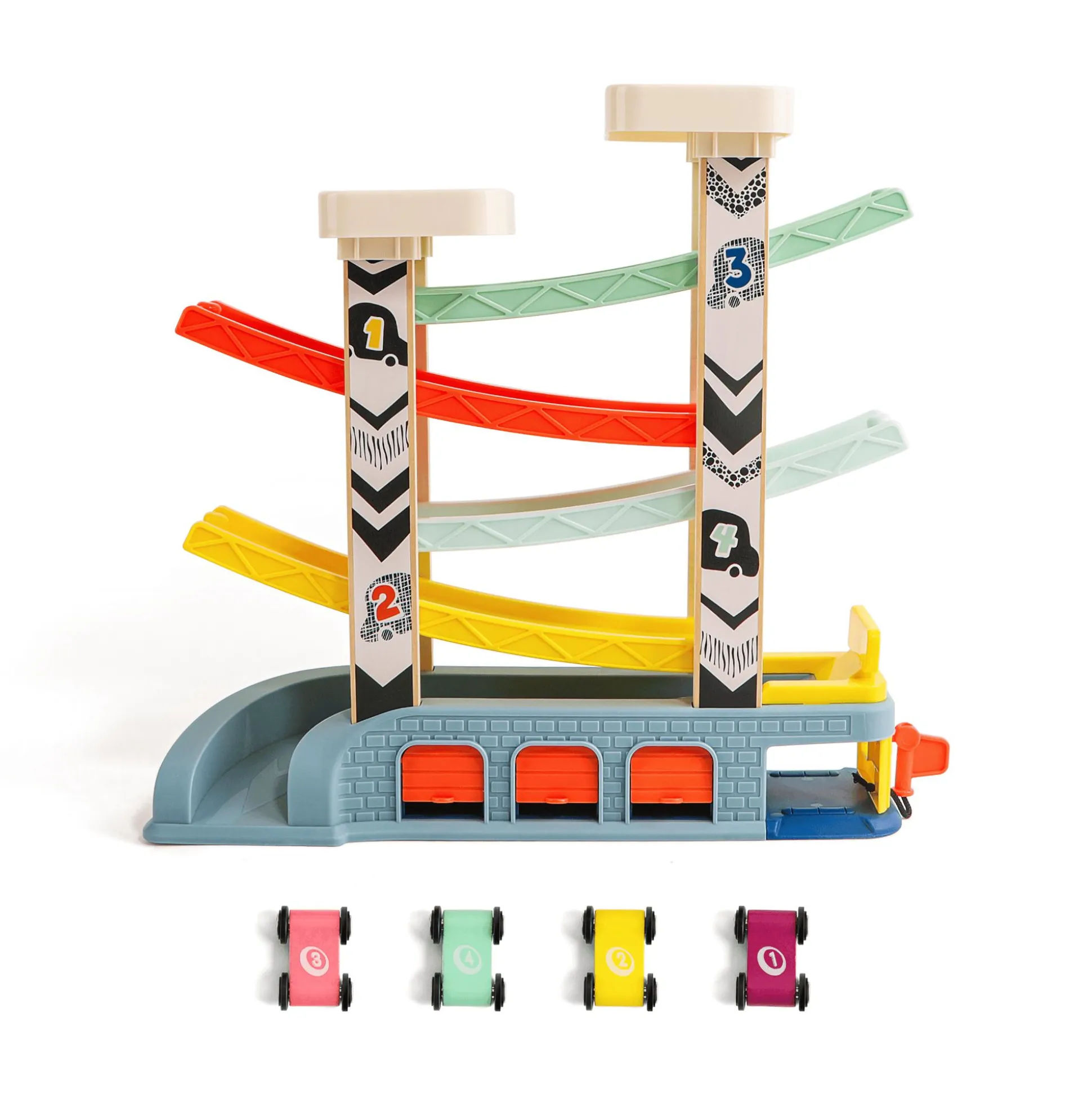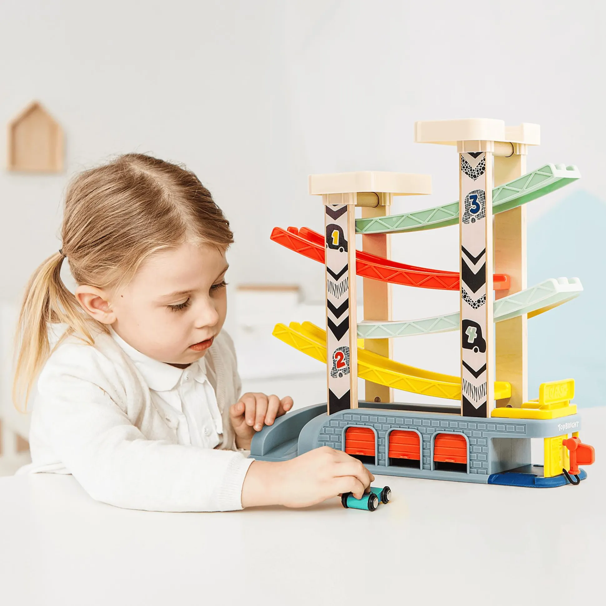 Die TOPBRIGHT Autorennbahn bietet Kindern ab etwa 18 Monaten spannende Rennabenteuer mit vier robusten Holzautos. Die farbenfrohe und stabile Rennbahn ist leicht zu handhaben und voller aufregender Details: Vier rasante Flitzer sausen über vier schnelle Rampen, während drei Garagen, zwei Parkdecks und eine Werkstatt mit Tankstelle für zusätzlichen Spielspaß sorgen. Nach dem Rennen finden die kleinen Autos sicher auf den beiden Parkdecks ihren Platz.