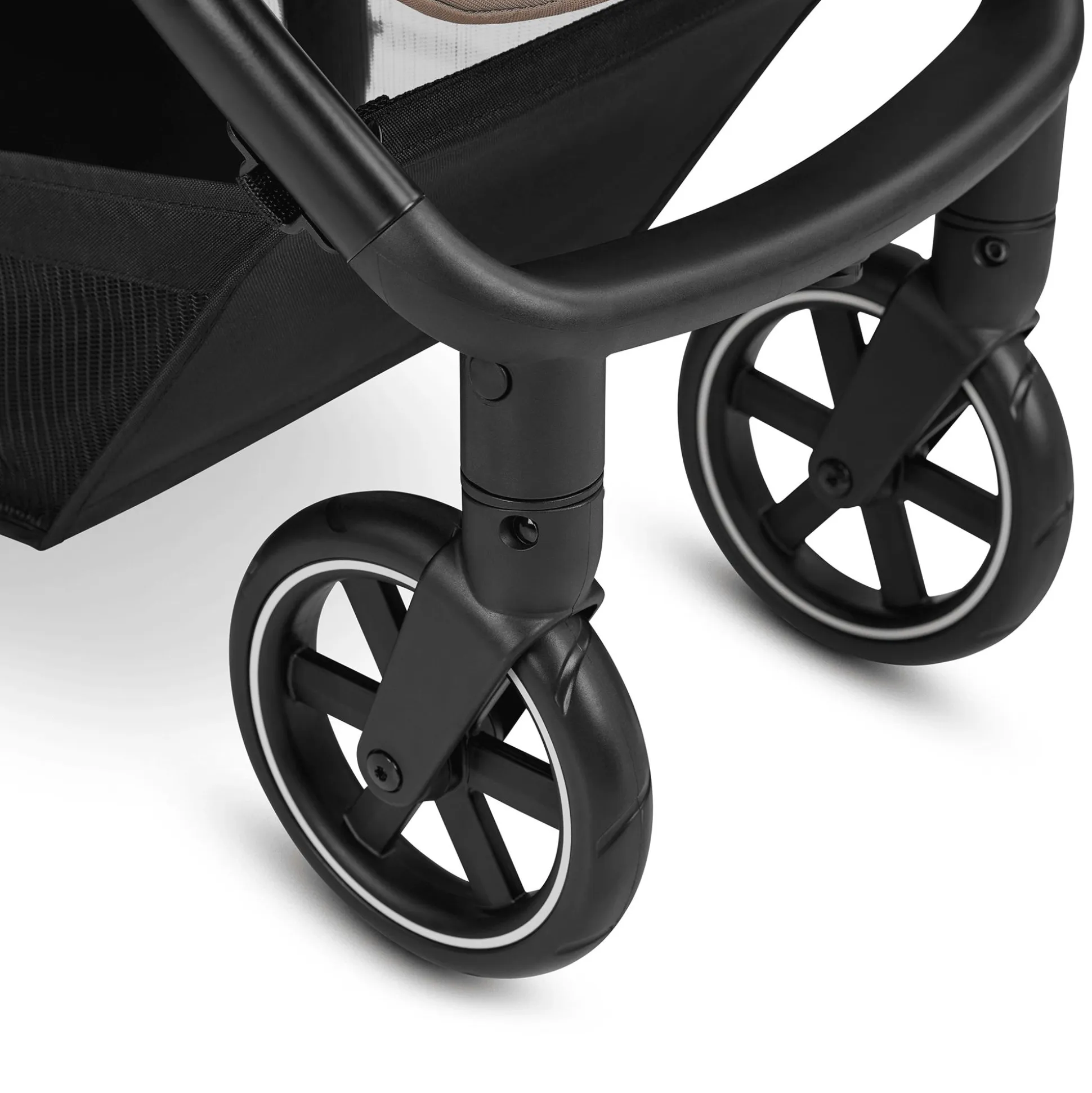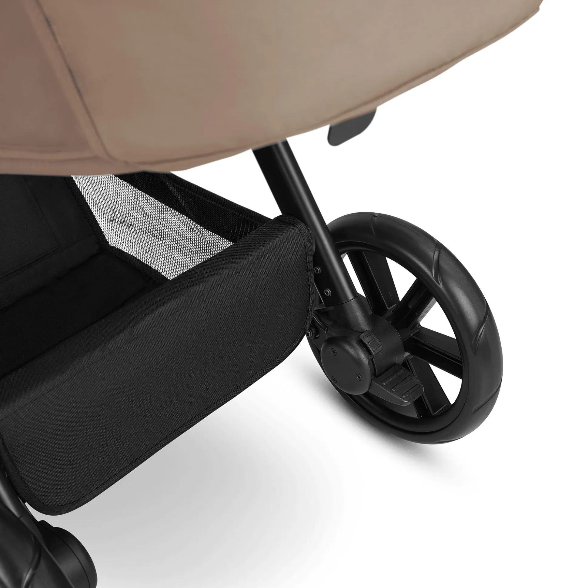 - Feststellbremse am rechten Hinterrad: ohne Hinterachse bietet der Buggy mehr Beinfreiheit beim Schieben