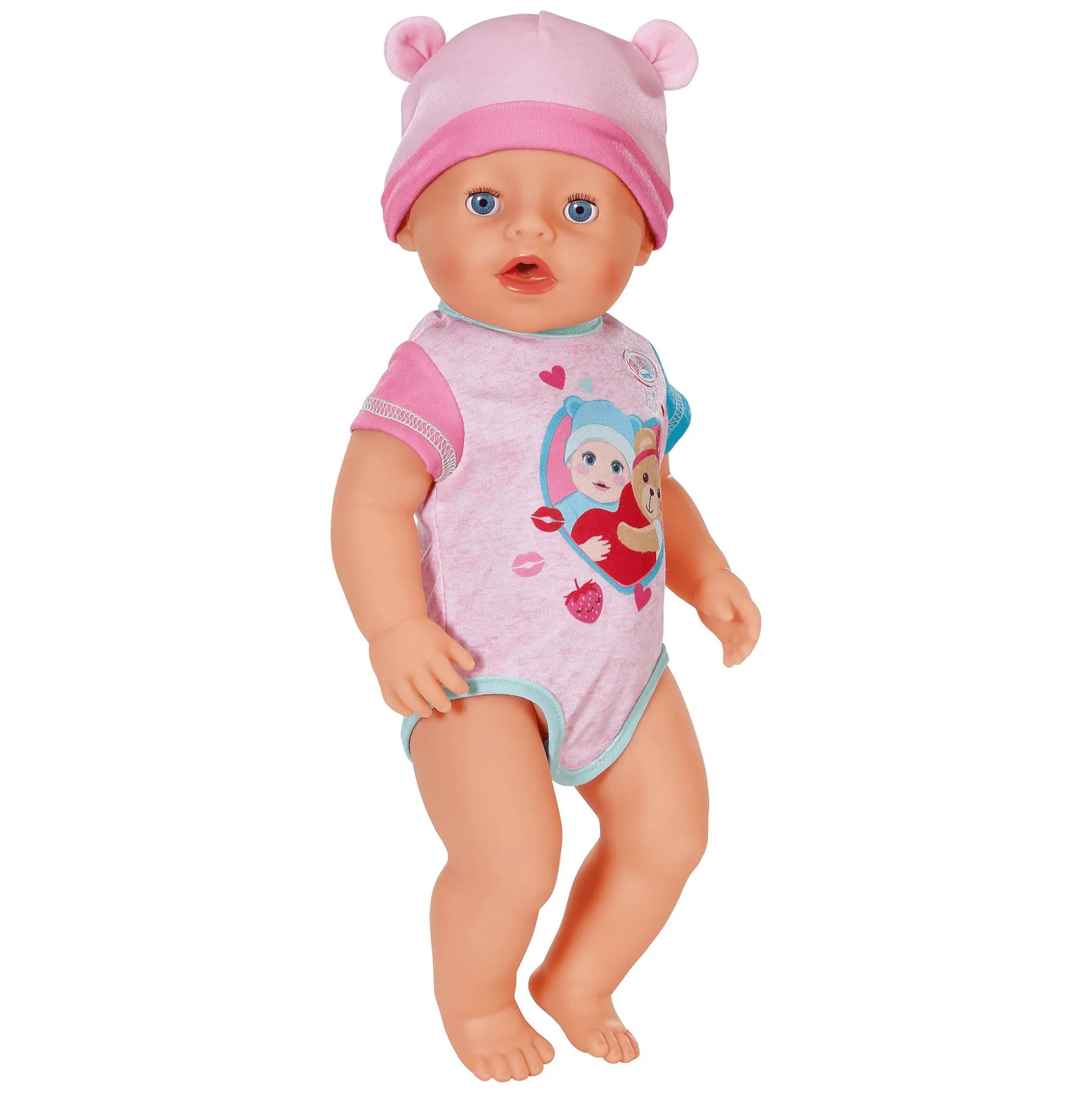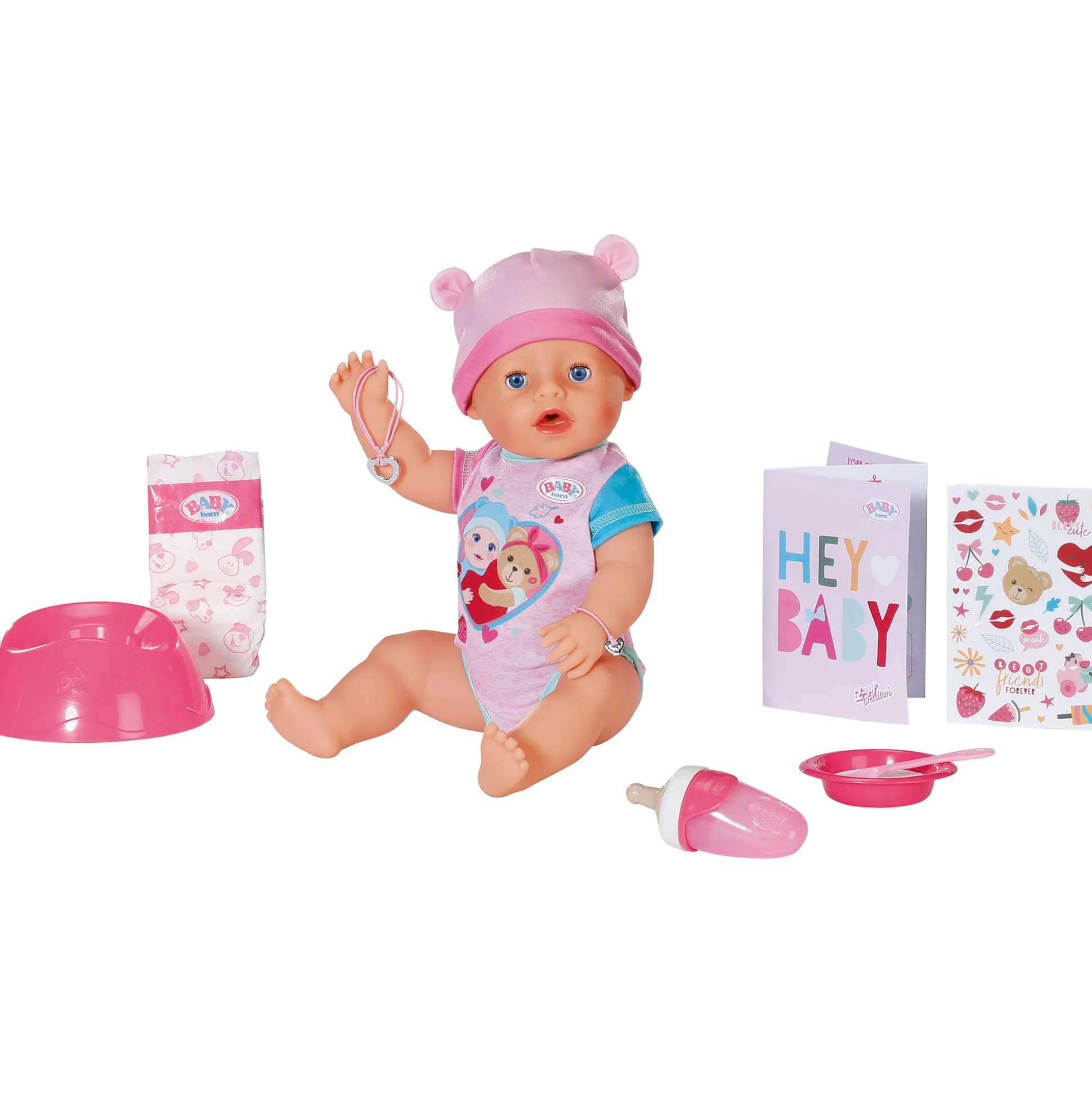 - mit 10 lebensechten Spielfunktionen und Accessoires: ein Fläschchen, Schnuller, Teller, Löffelchen, Mahlzeiten, Töpfchen, Geburtspass, eine Windel und zwei Freundschaftsarmbändchen