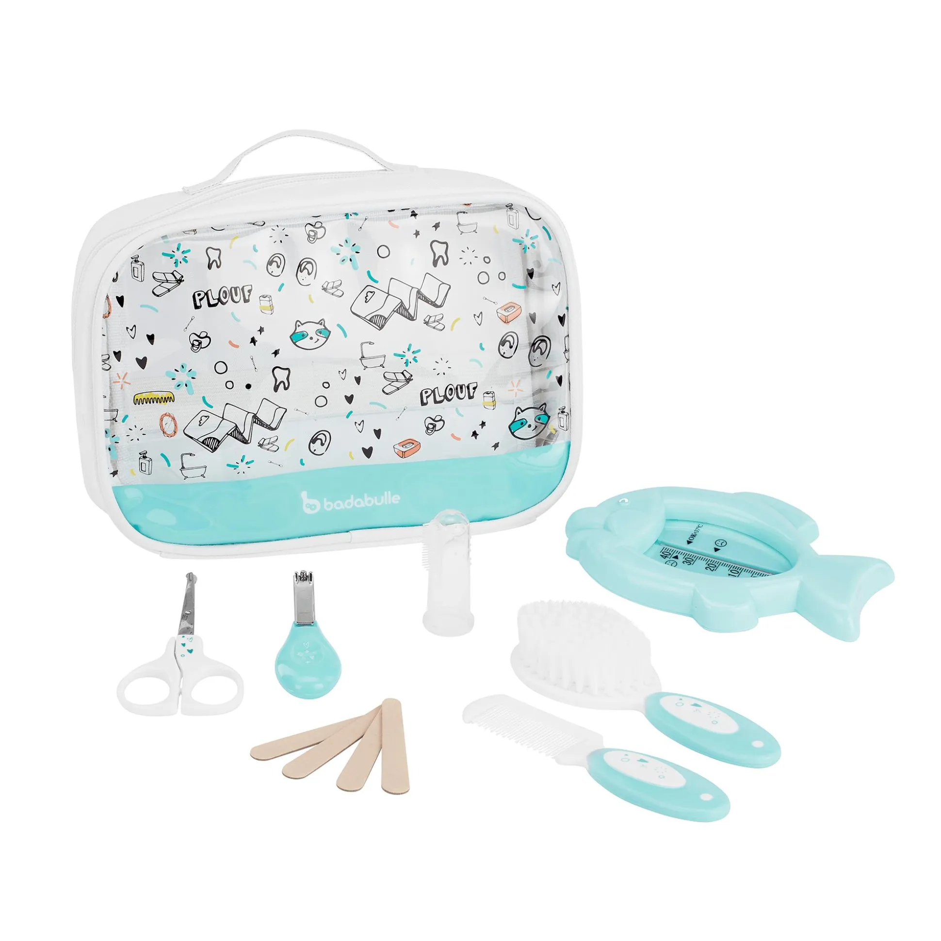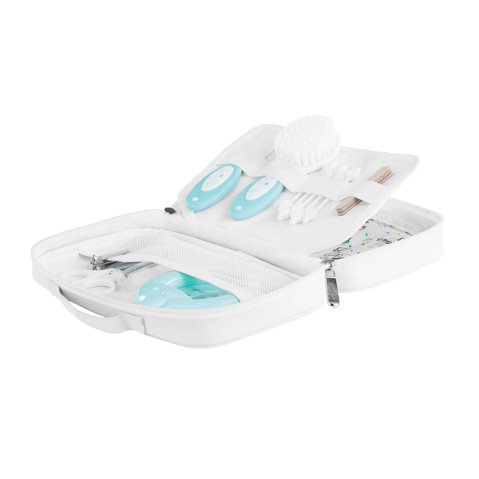 - 7 Zubehörteile: Bürste, Kamm, Schere, Nagelknipser, 4 Nagelfeilen, Silikon-Mundpflege-Fingerling und Badethermometer