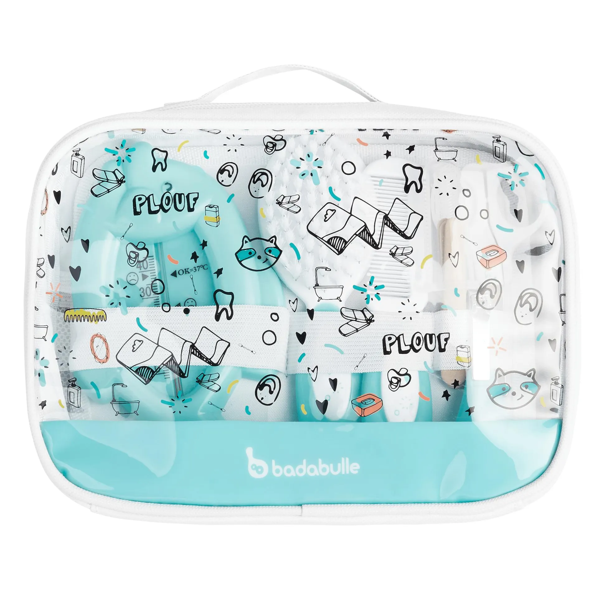 Die Pflege des Babys ist geprägt von Momenten großer Zärtlichkeit und Vertrautheit. Das Pflegeset Splash bietet dir alles, was du für die Babypflege brauchst. Und dank der transparenten Vorderseite hast du alles auf einen Blick: Badethermometer, Bürste und Kamm, Nagelfeile und Nagelknipser, Schere mit abgerundeter Spitze und ein Beißring aus Silikon. Neben den 7 enthaltenen Accessoires bietet der Baby-Kulturbeutel Splash ausreichend Platz, um individuell weiteres Zubehör, wie Feuchttücher, Cremes oder Medikamente, hinzuzufügen. Die separaten Fächer sowie die elastischen Gummibänder sorgen für Ordnung im Innenbereich des Pflegesets. So kann sich dein Frechdachs stets rundum wohl und sauber fühlen.