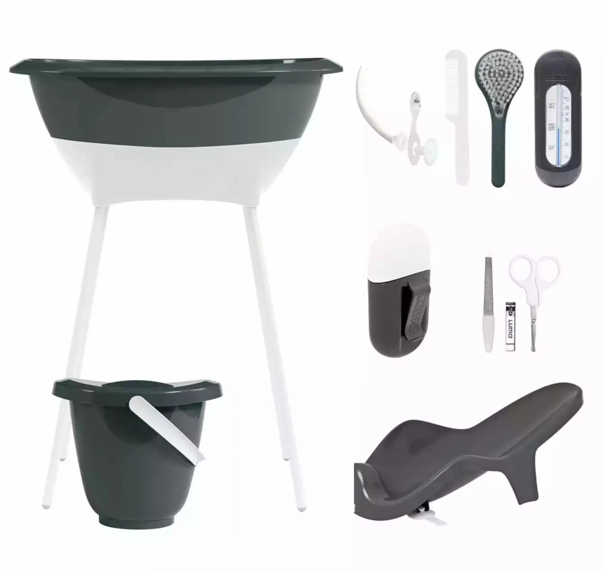Das Set beinhaltet eine Babybadewanne plus Badewannenständer, einen Windeleimer, einen Badewannensitz, ein Maniküreset, einen Kamm, eine Bürste, ein Badethermometer sowie einen Abflussschlauch – kurzum, eure vollständige Pflege- und Badeausstattung!