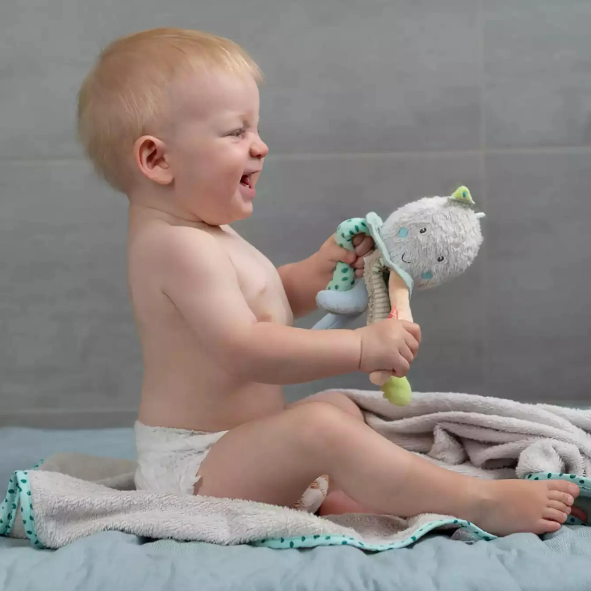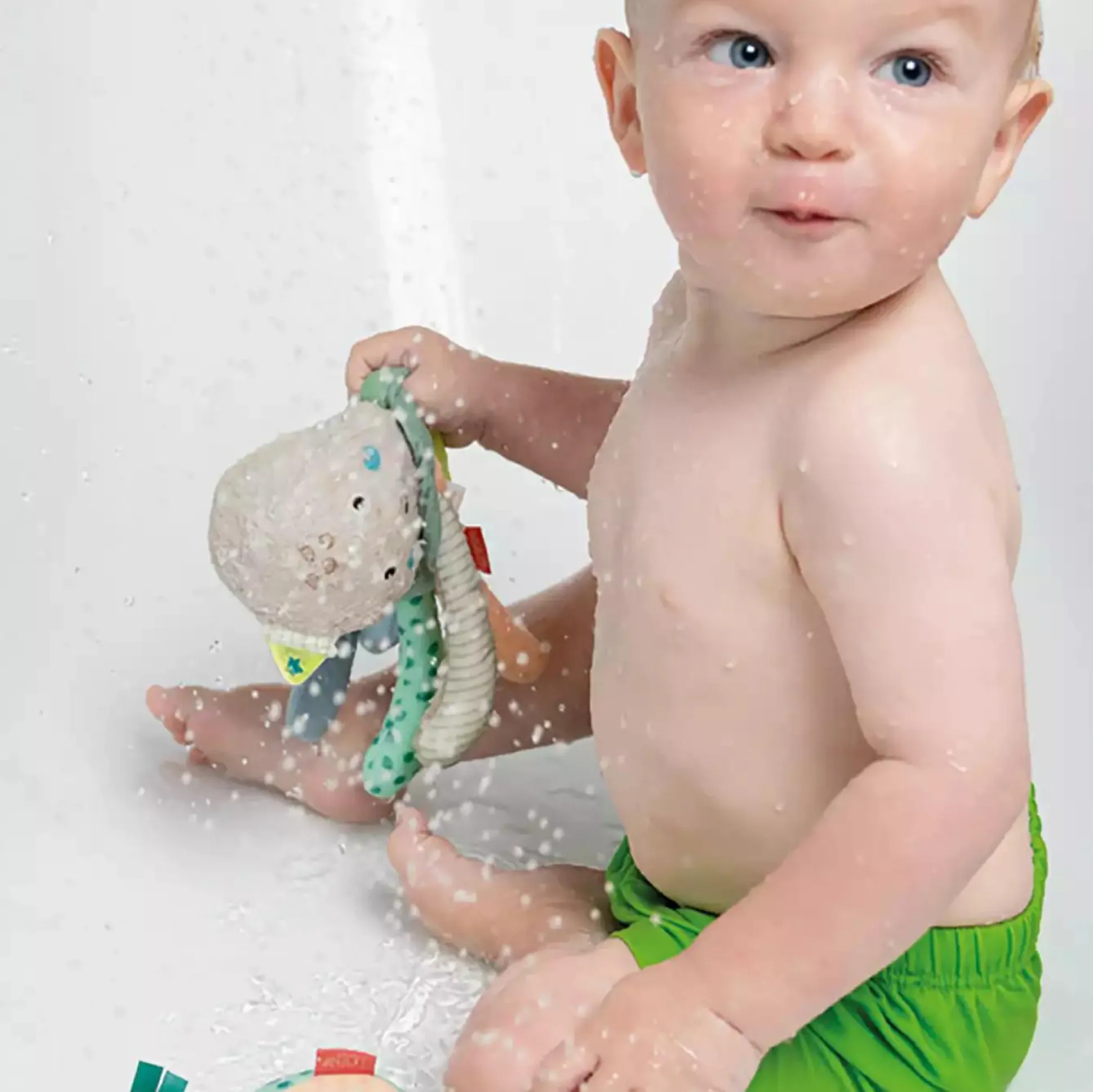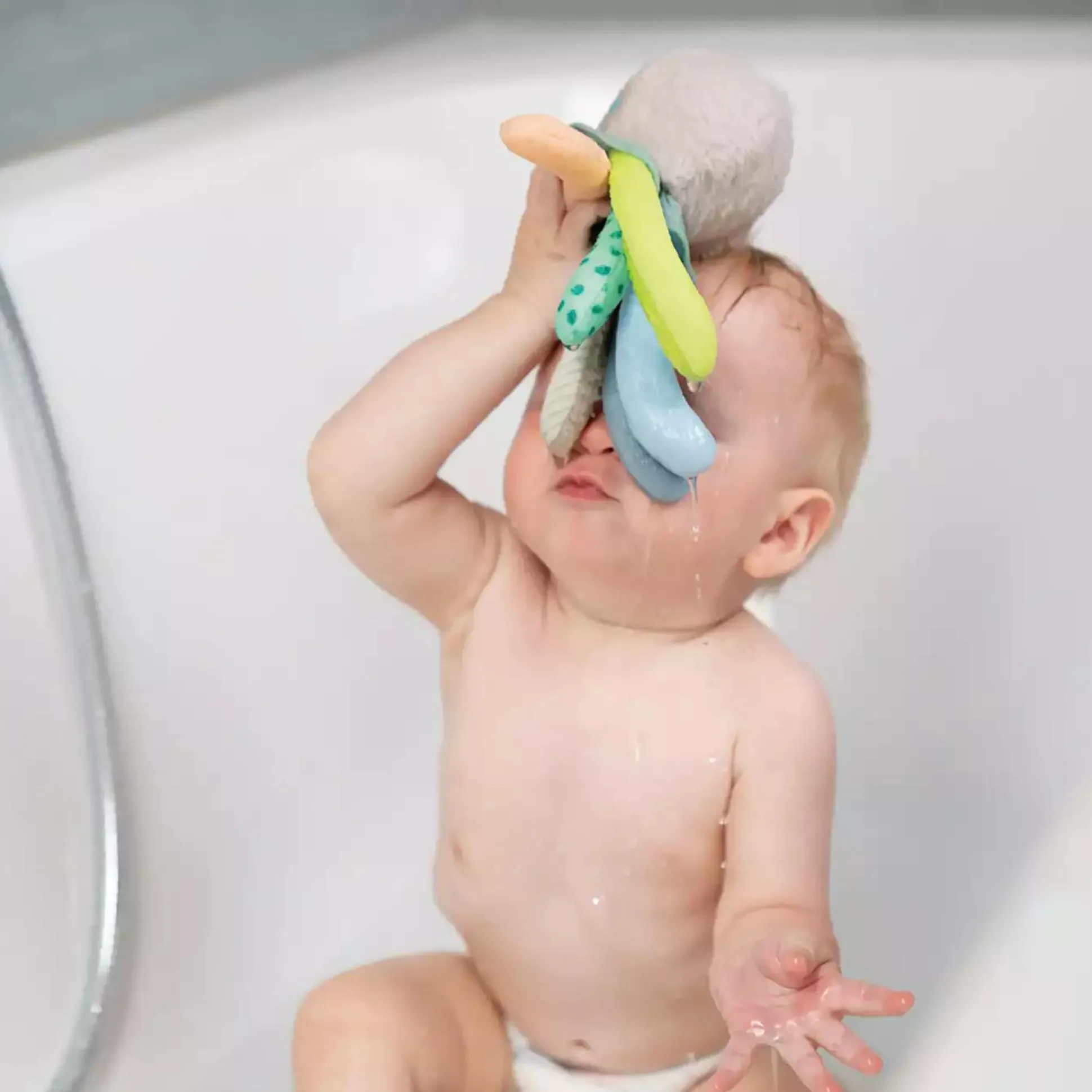 Die sanften Farben und kuscheligen Materialien des Badetieres sind besonders weich zur Haut deines Babys und laden zum Greifen, Fühlen und Spielen ein. Der kleine Oktopus fühlt sich im Badezimmer zuhause – mit dem Meeresbewohner wird das Baden zum Vergnügen für jedes Baby.