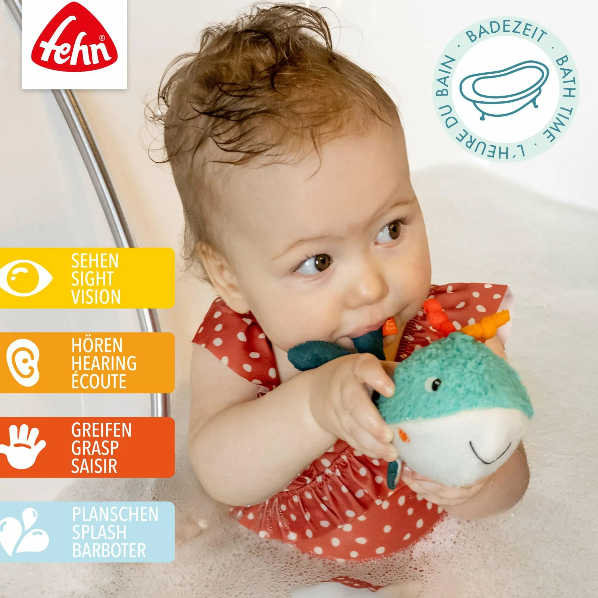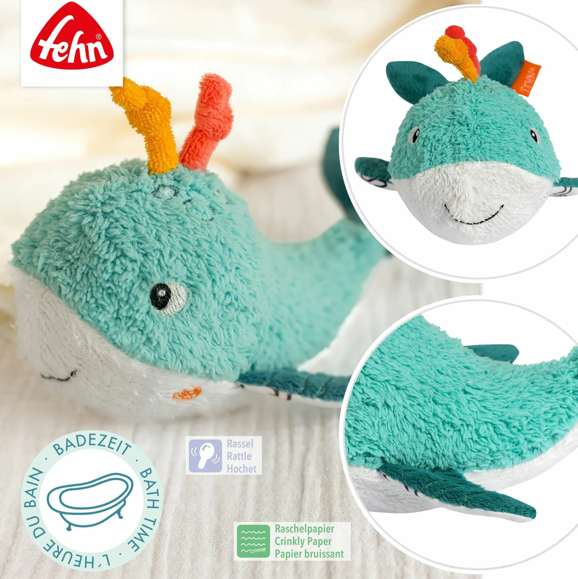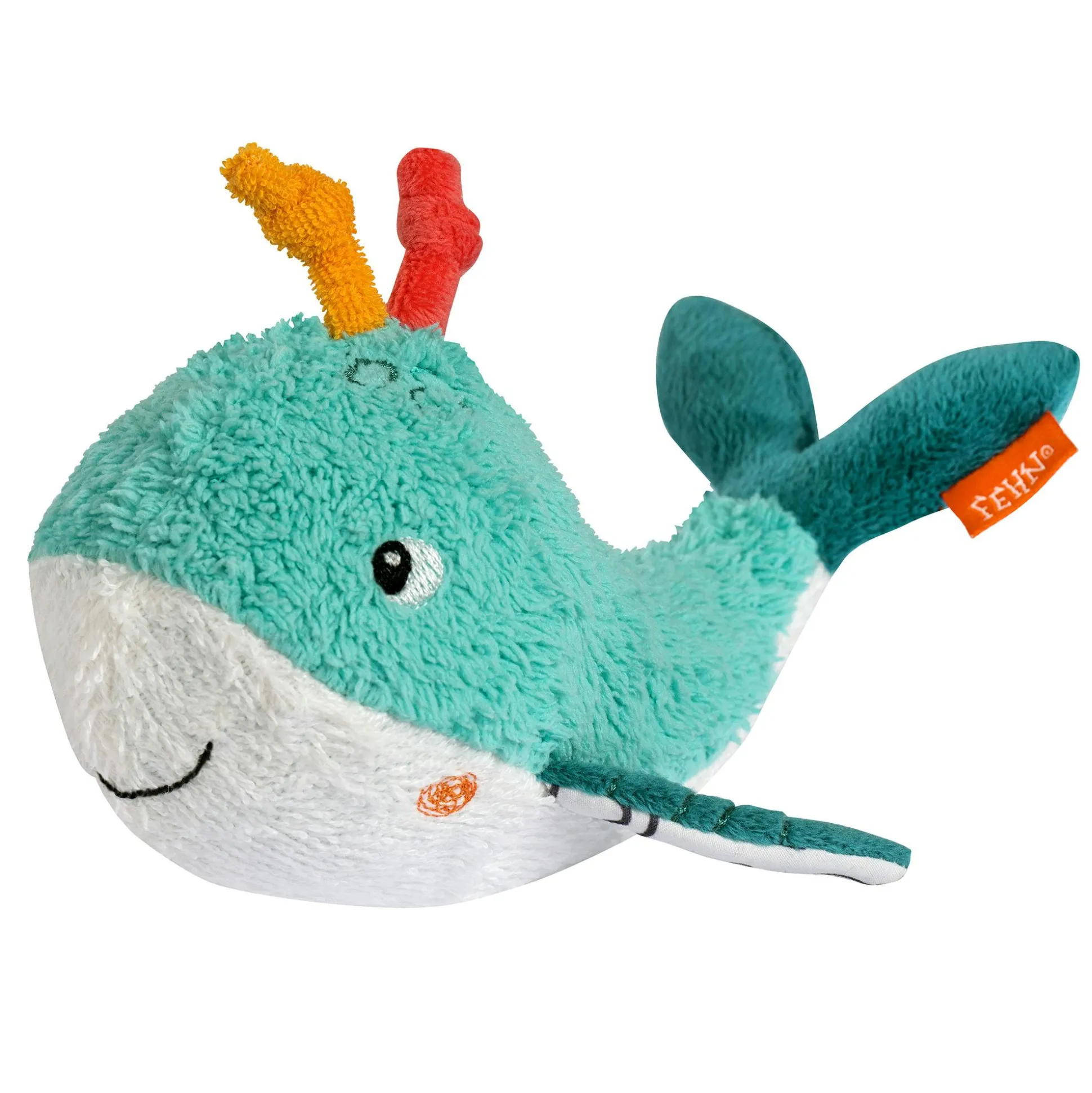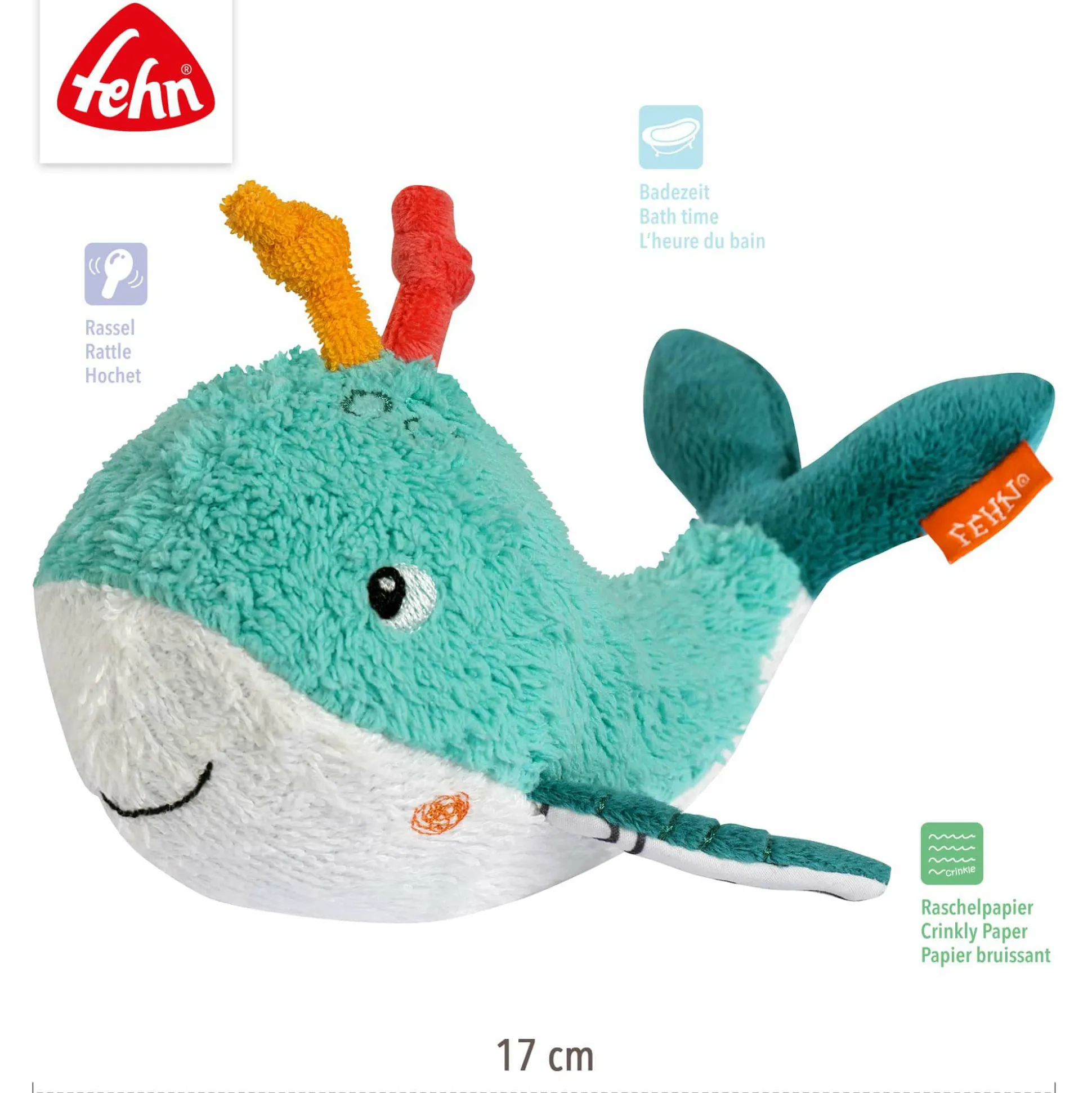 Das Badetier Wal von fehn bringt Spielspaß in die Badewanne und sorgt für fröhliche Abwechslung beim Baden. Dank eines eingearbeiteten Balls schwimmt das niedliche Stoffspielzeug sicher an der Wasseroberfläche und lädt dein Baby ab der Geburt zum Greifen und Spielen ein. Der weiche Materialmix ist sanft zur empfindlichen Babyhaut und fördert gleichzeitig die Sinne auf spielerische Weise.