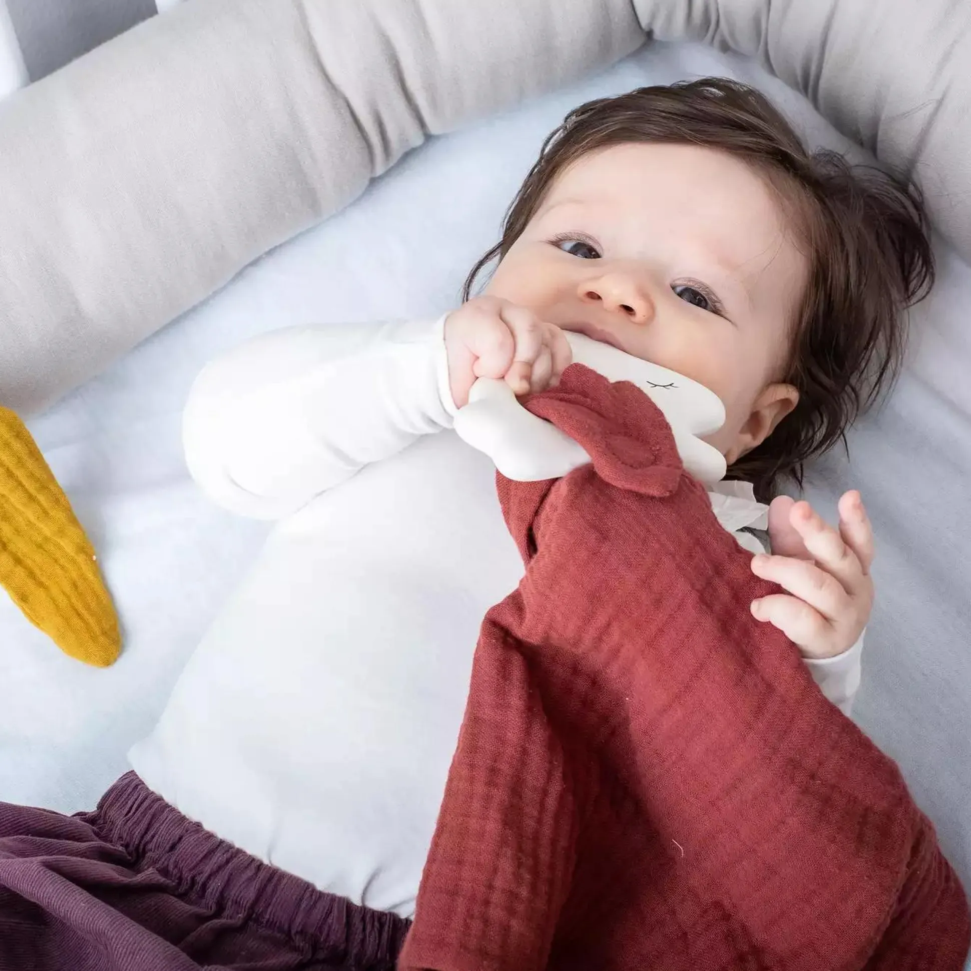 Der Hasen Beißring von kikadu, aus Naturkautschuk mit Musselin Tuch, hilft beim Zahnen. Das Tuch ist zudem auch das perfekte Spielzeug für dein Baby. Durch das geringe Gewicht kann der Beißring ganz einfach von den kleinen Händchen gehalten werden.