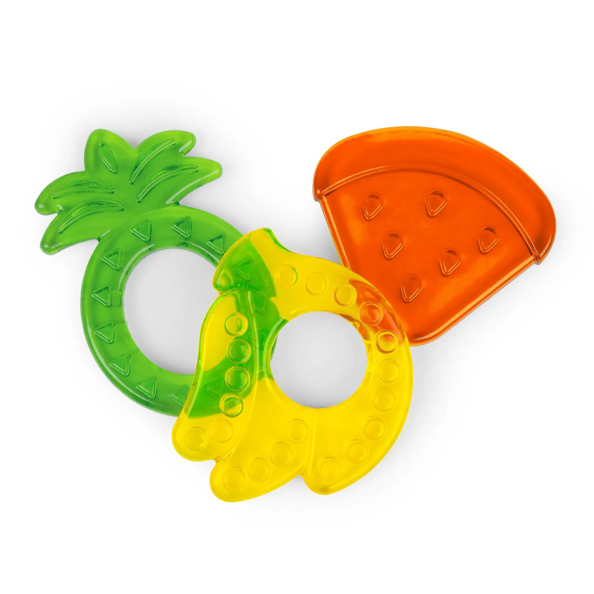- 3 farbenfrohe, unterschiedlich strukturierte Beißhelfer: Ananas, Banane und Wassermelone