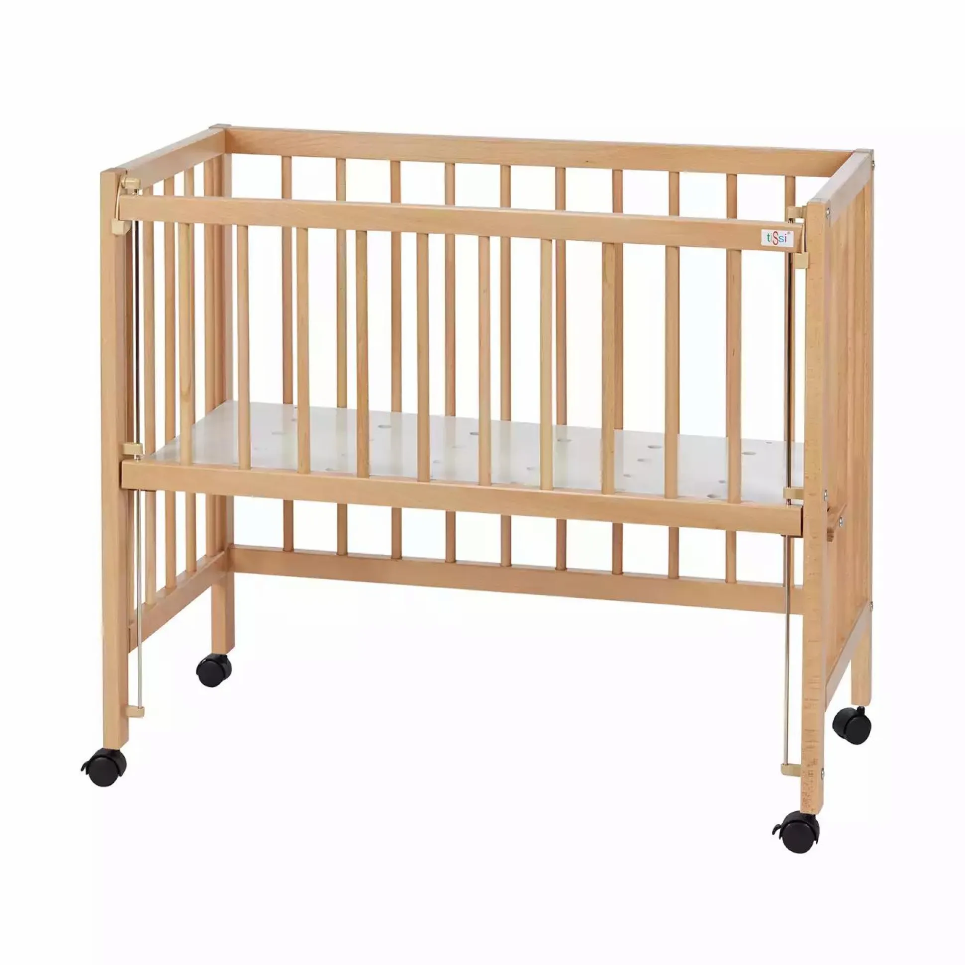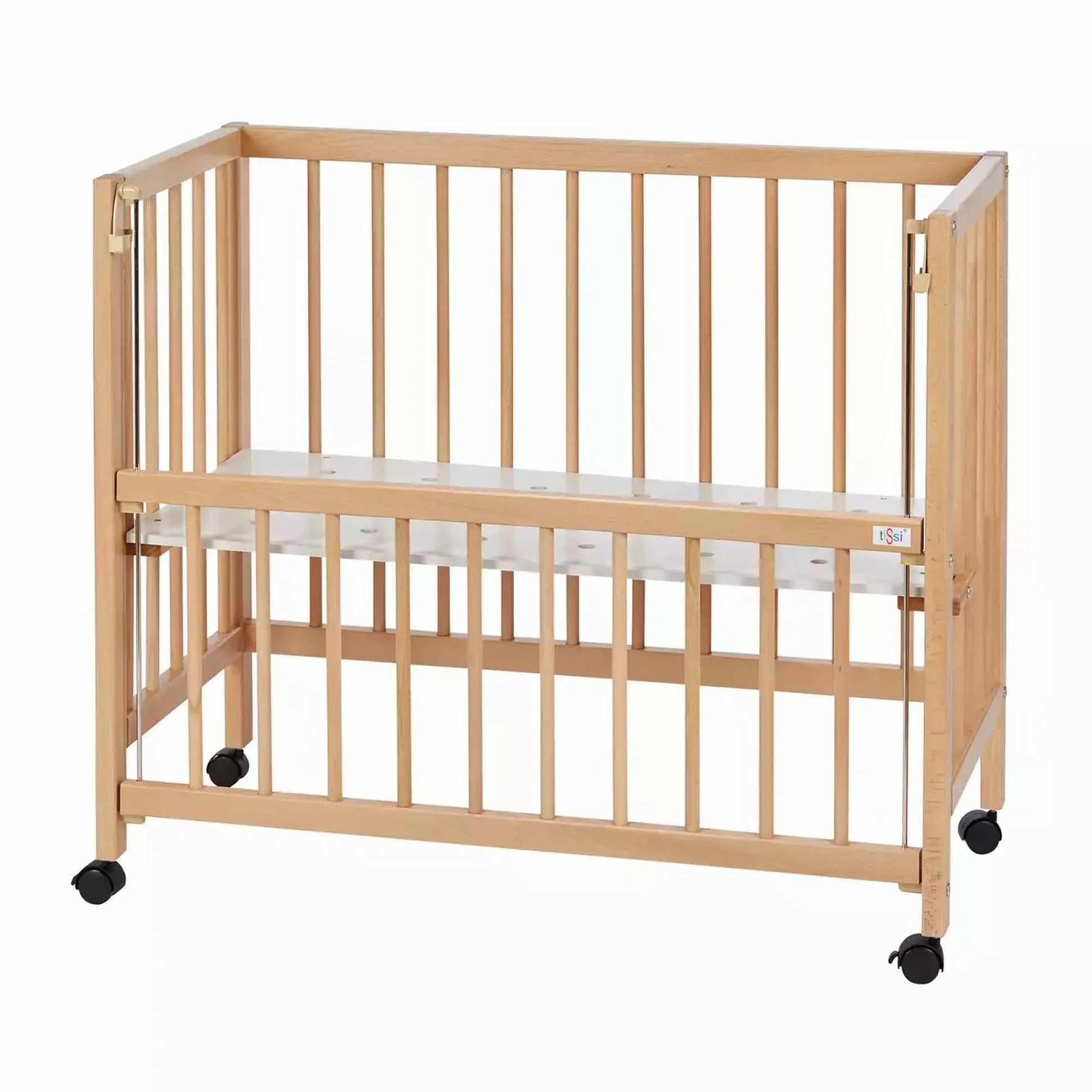 Aus massiven Buchenholz gefertigt ist das tiSsi® Beistellbett Sophie besonders stabil. Durch das mitgelieferte Verschlussgitter kann es in wenigen Handgriffen zum Stubenwagen umgebaut werden. Rollen mit Festellbremse machen das Beistellbett mobil und kann so bequem in jedem Zimmer genutzt werden.