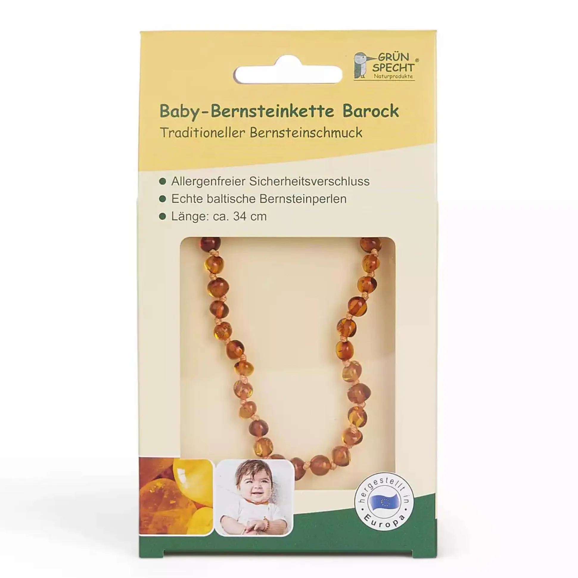 Die Baby-Bernsteinkette von Grünspecht sind handgefertigte Einzelstücke aus baltischem Naturbernstein, der vor ca. 40-70 Mio. Jahren aus dem Harz der Bernsteinkiefer entstand. Farb- oder Formunterschiede sind normal. Im Gegensatz zu herkömmlichen Sollbruchstellen, die bei entsprechender Zugkraft zerstört werden, können Grünspechts selbst entwickelten und von einem zertifizierten Labor geprüften allergenfreien Sicherheitsverschlüsse immer wieder verwendet werden. Alle Ketten werden in liebevoller Handarbeit zu geknüpften Einzelstücken. Jeder Stein wird per Hand einzeln verknotet und jede einzelne Kette wird nochmals geprüft. Zudem zählt er in der Esoterik zu den traditionellen Schutzsteinen, die Ängste nehmen und Lebensfreude schenken sollen.