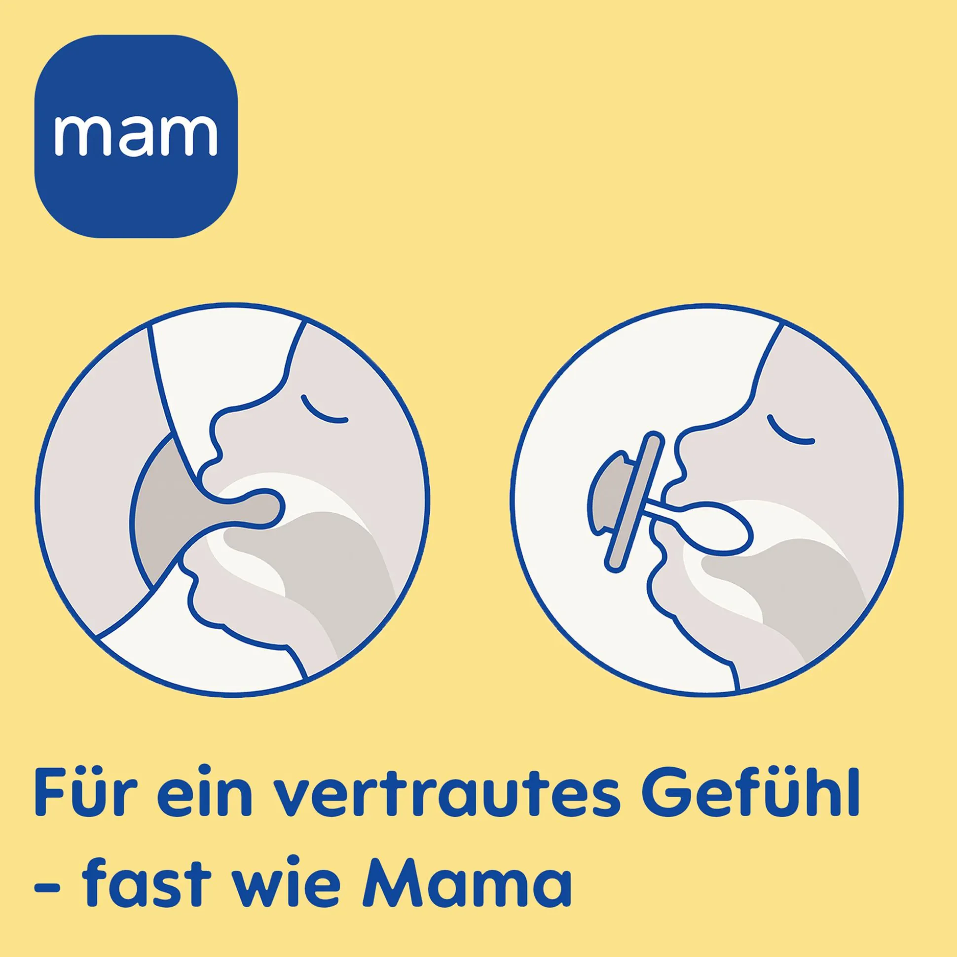 Die MAM Schnuller werden mit Zahnmediziner*innen entwickelt und sind dank ihres symmetrischen, flachen Saugteils besonders zahn- und kieferfreundlich. und hilft so, Zahnfehlstellungen vorzubeugen. Außerdem besteht das Saugteil aus speziellem SkinSoft-Silikon, welches sich vertraut anfühlt.Sowohl Saugteil als auch Schnullerschild haben eine symmetrische Form, weshalb der Schnuller immer richtig herum im Mund liegt. Ein Schnullerband lässt sich am Greifknopf einfach befestigen. Da der Schnullerknopf im Dunkeln leuchtet, können ihn Eltern und Babys nachts leicht wiederfinden – für weniger Stress und ruhigere Nächte.