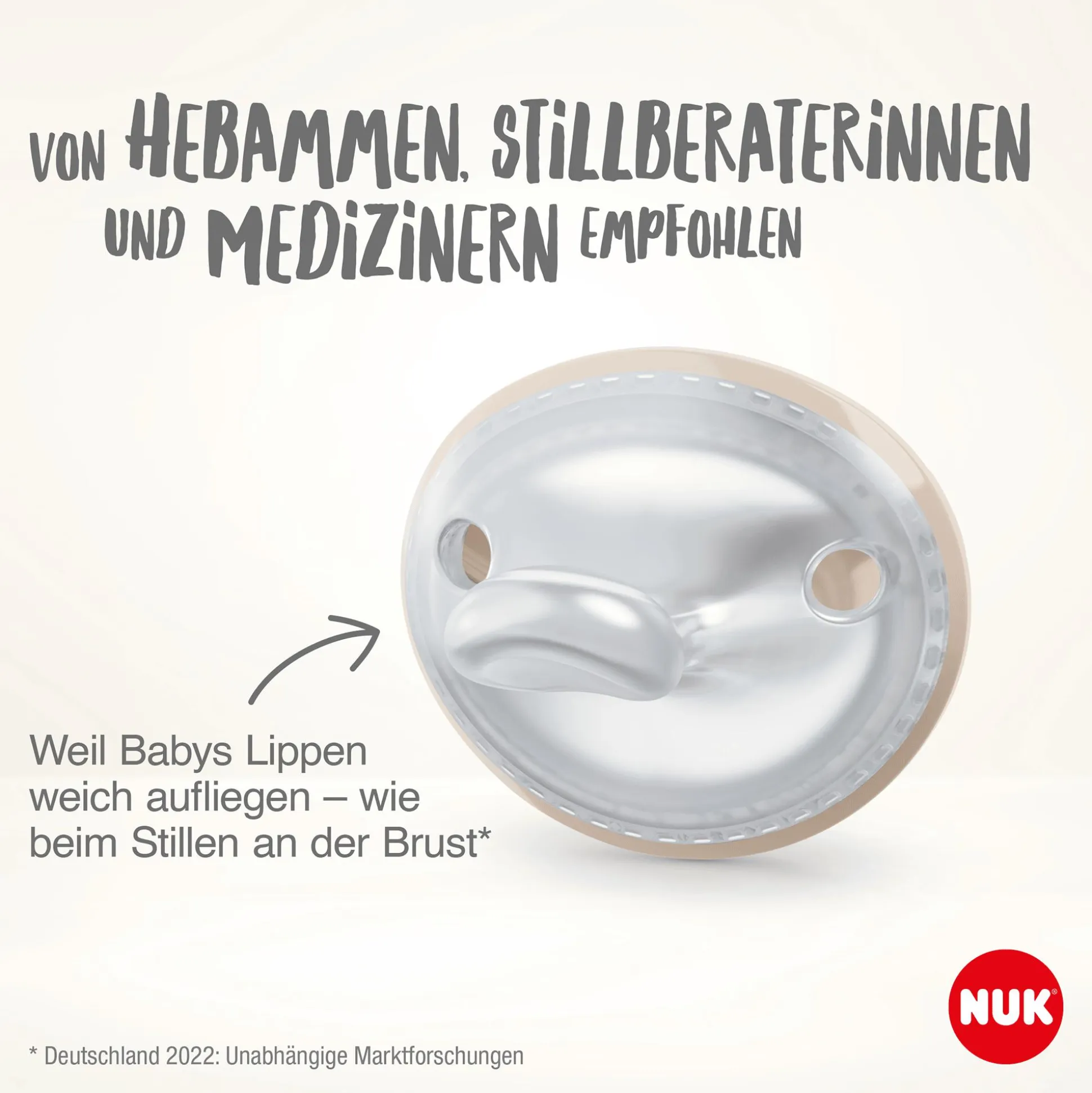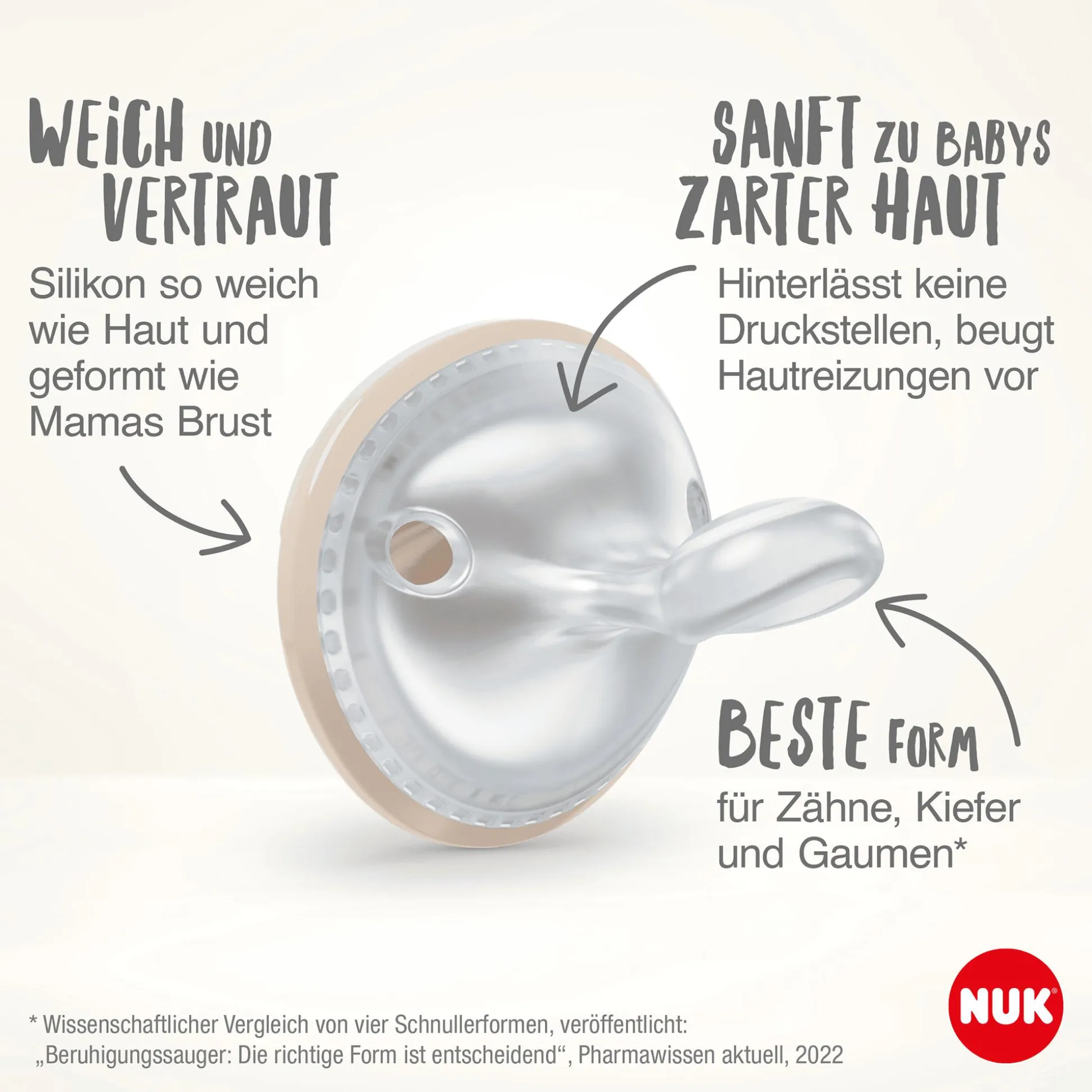 Der MommyFeel Beruhigungssauger von NUK im praktischen Doppelpack bietet einen hohen Komfort und ist aus hochwertigem, weichem Silikon gefertigt. Das Material ist besonders zart zur empfindlichen Haut deines Babys und sorgt für ein angenehmes Gefühl beim Nuckeln. Du kannst dich darauf verlassen, dass dein kleiner Liebling sanft und sicher beruhigt wird.Der Silikon-Schnuller zeichnet sich durch sein einzigartiges Design aus, das der weiblichen Brust nachempfunden und das auf die natürliche Entwicklung des Kiefers und des Gaumens abgestimmt ist. So kannst du sicher sein, dass du deinem Baby das Beste für seine Entwicklung bietest.