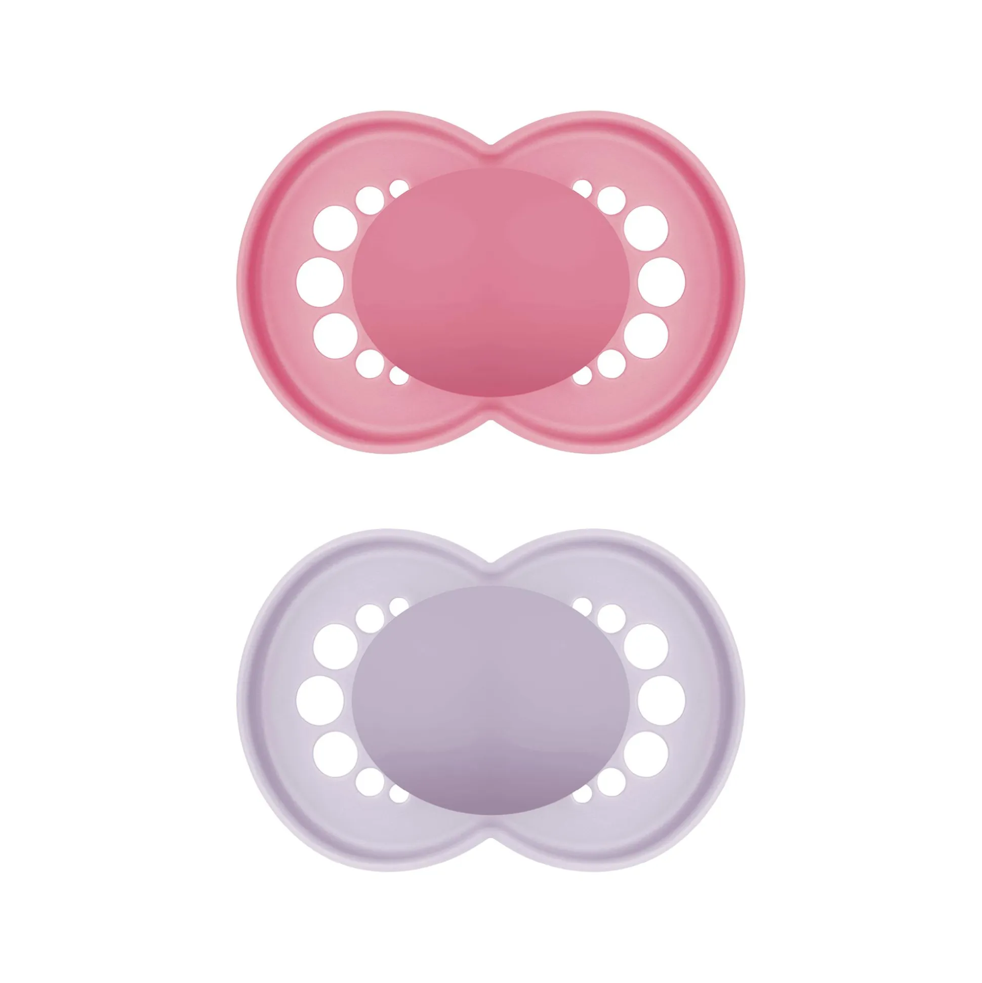 Dieses 2er-Set Beruhigungssauger Original Silikon 6-16 Monate von MAM besteht aus einem pinken Schnuller und einem lila Schnuller.
