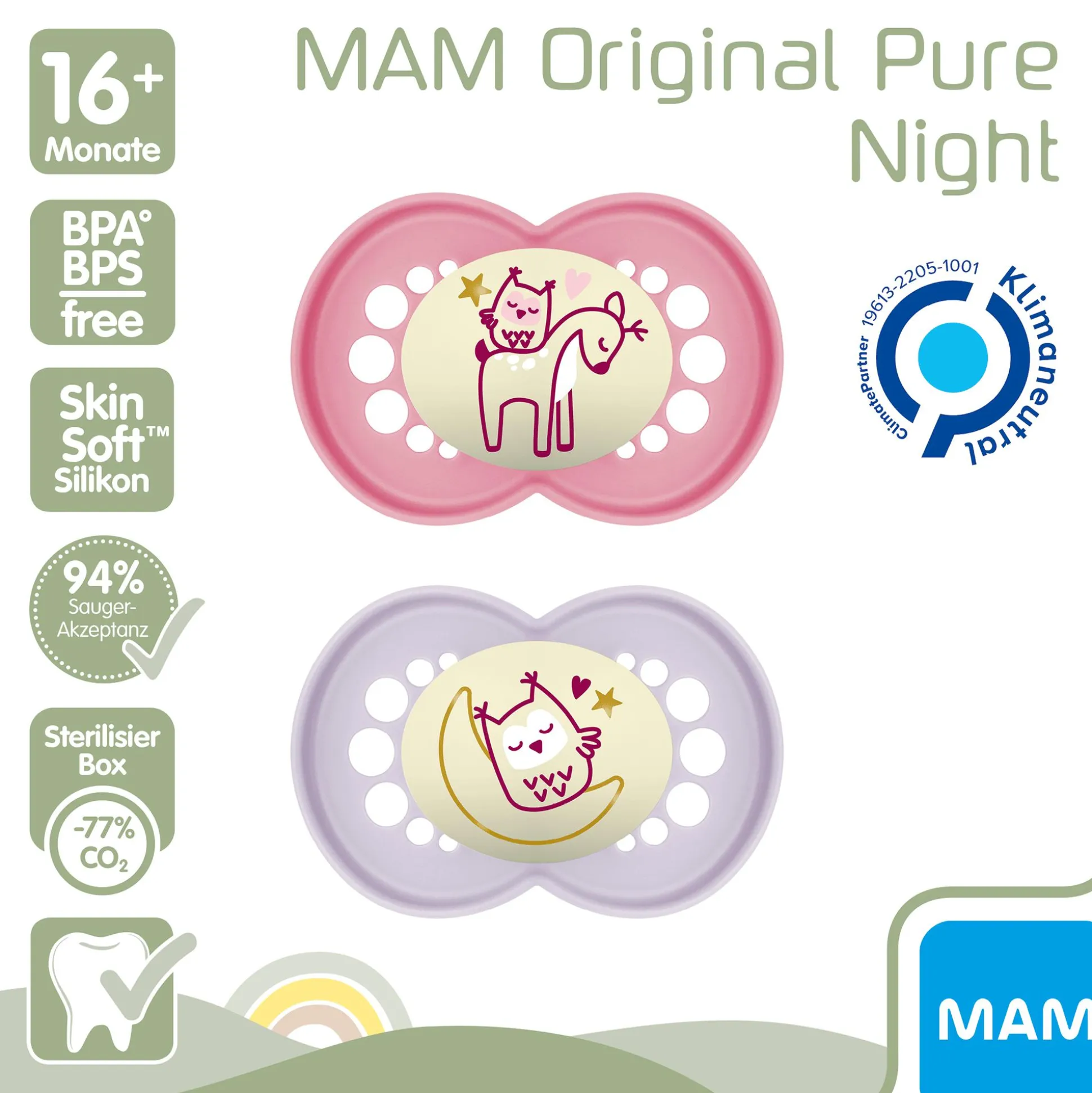 Der Sauger besteht aus speziellem SkinSoft Silikon, das sich besonders weich und vertraut anfühlt und so von 94% der Kinder instinktiv akzeptiert wird. MAM Schnuller werden gemeinsam mit Zahnmediziner*innen und Kieferorthopäd*innen entwickelt und sind dank ihres symmetrischen, flachen Saugteils besonders zahn- und kieferfreundlich. Zusammen mit dem symmetrisch geformten Schnullerschild liegt der Schnuller immer richtig herum in Babys Mund. Das Schild ist besonders sanft zu Babys empfindlicher Haut dank großzügiger Luftlöcher, der abgerundeten Form und der Noppen auf der Innenseite. Der Schnullerknopf ist für die kleinen Babyhände einfach zu greifen, aber gleichzeitig so flach, dass der Schnuller für deinen Liebling in jeder Lage bequem ist. Der praktische MAM Original Night Schnuller leuchtet im Dunkeln. So kann er von dir und deinem Kind einfach wiedergefunden werden und beschert ruhigere Nächte.