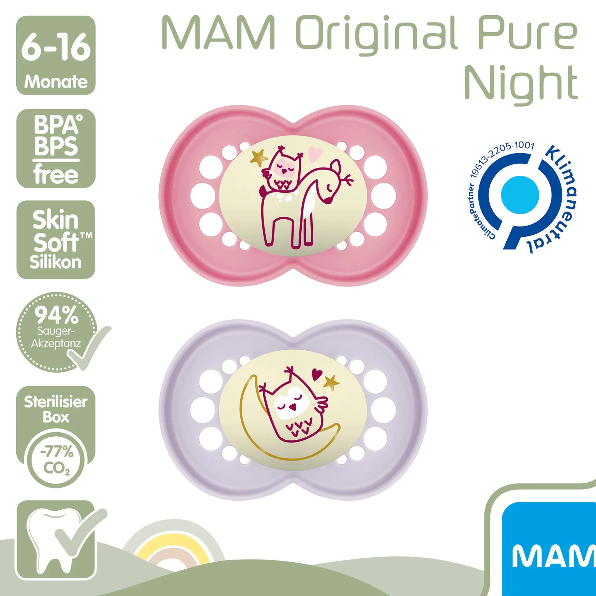 Der MAM Original Night Silikon ist der erste klimaneutrale MAM Schnuller. Schild und Knopf bestehen aus einem nachhaltigen, bio-erneuerbaren Material, um einen möglichst geringen CO2-Fußabdruck zu erzeugen. Der Rest wird durch MAM in Zusammenarbeit mit Climate Partner kompensiert.