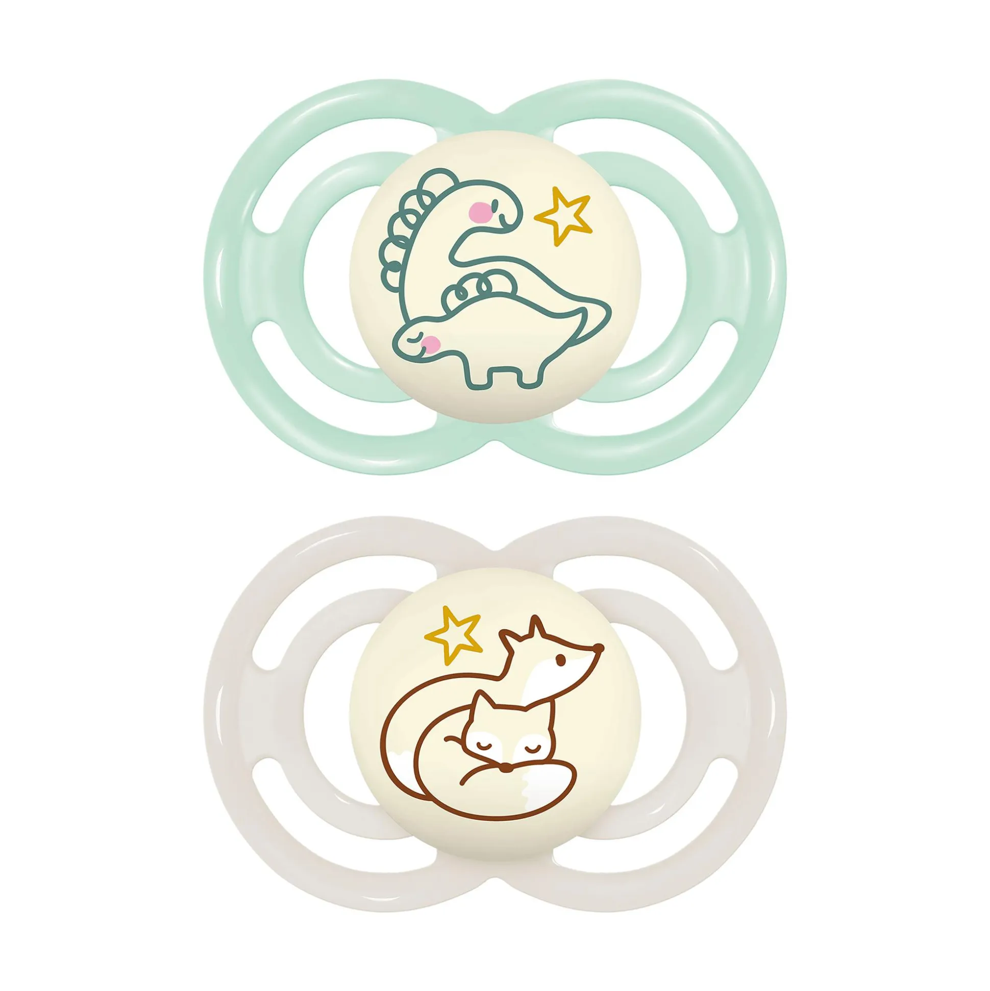 Die Beruhigungssauger „Perfekt Night Silikon 6 – 16 Monate“ von Mam sind der beste Freund für deinen kleinen Träumer! Das 2er-Set, bestehend aus einem grünen Schnuller mit zwei Dinos und einem beigen Sauger mit zwei Füchsen, leuchtet im Dunkeln. Das sorgt nicht nur für eine magische Stimmung, sondern hilft dir dabei, den Schnuller auch bei Nacht schnell wiederzufinden.