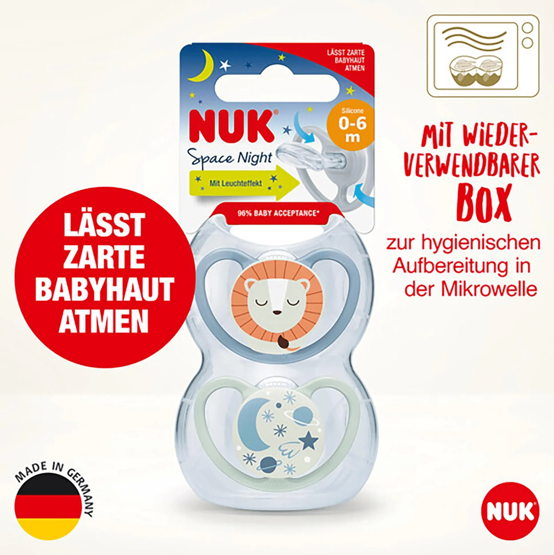 Diese Beruhigungssauger Space Night von NUK kommen in einem praktischen 2er-Pack und einer wiederverwendbaren Schnullerbox zu dir nach Hause! Der eine Schnuller hat ein niedliches Löwen-Motiv und der andere ein tolles Weltall-Motiv.