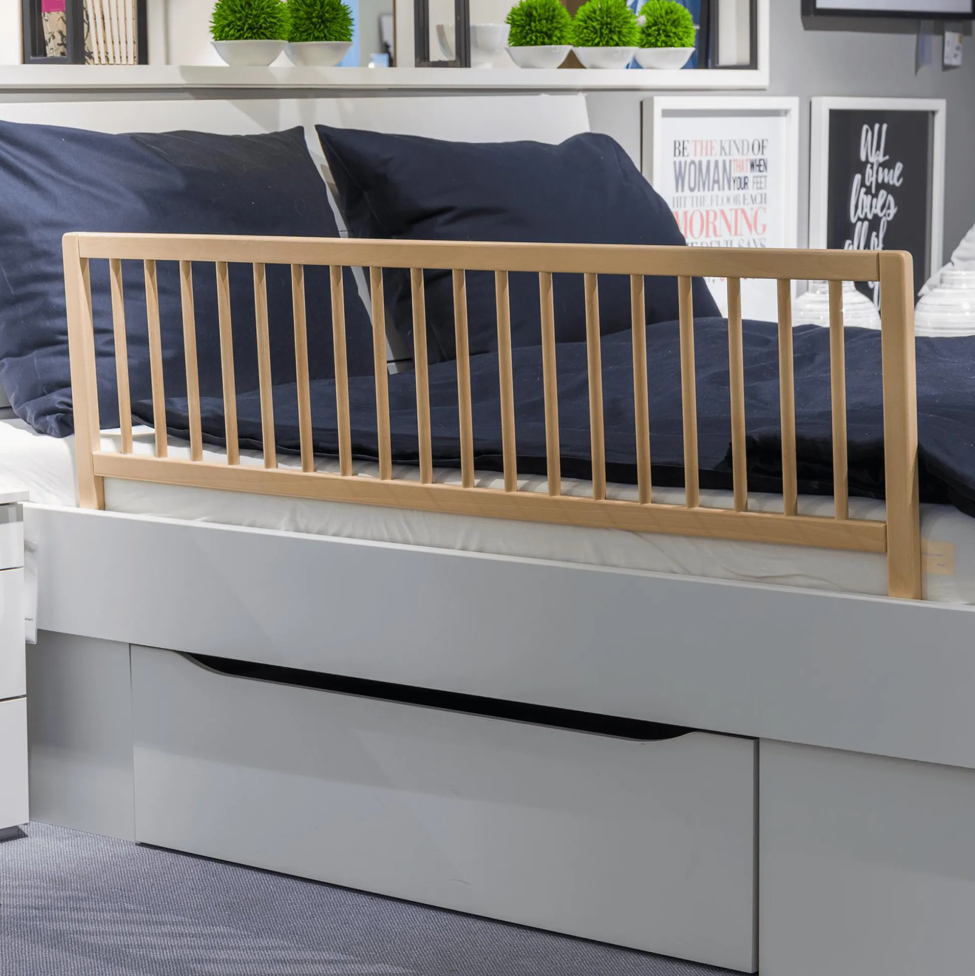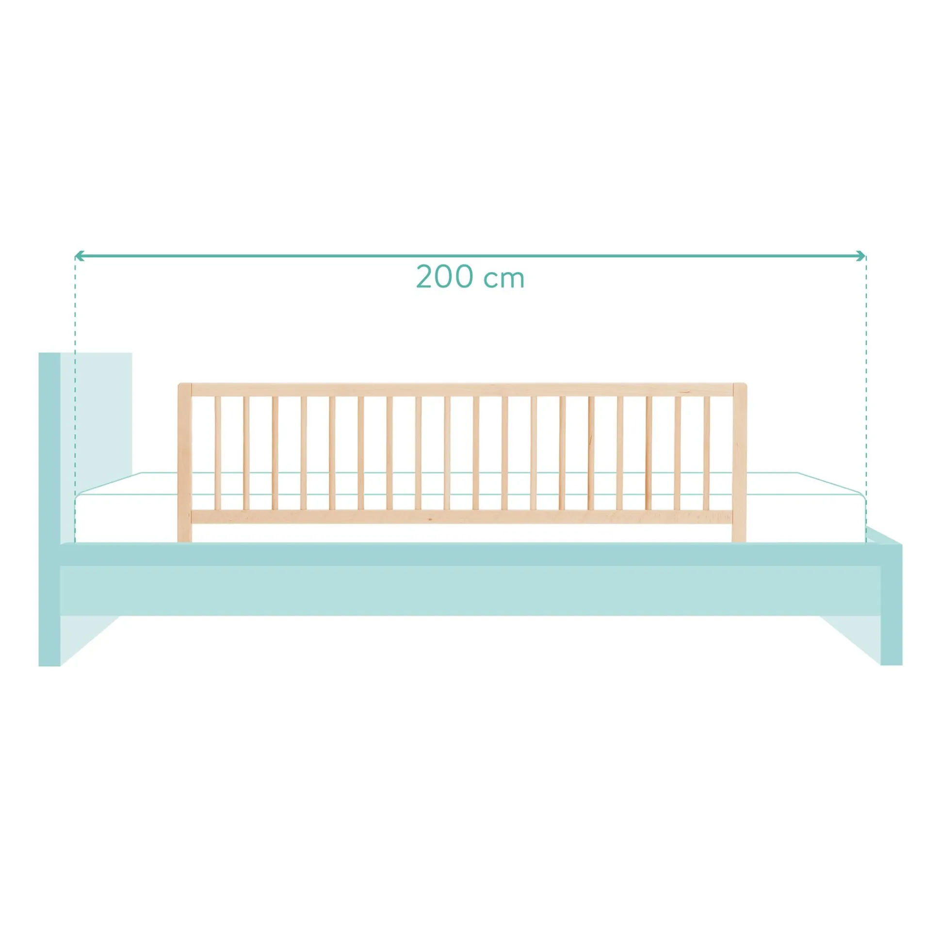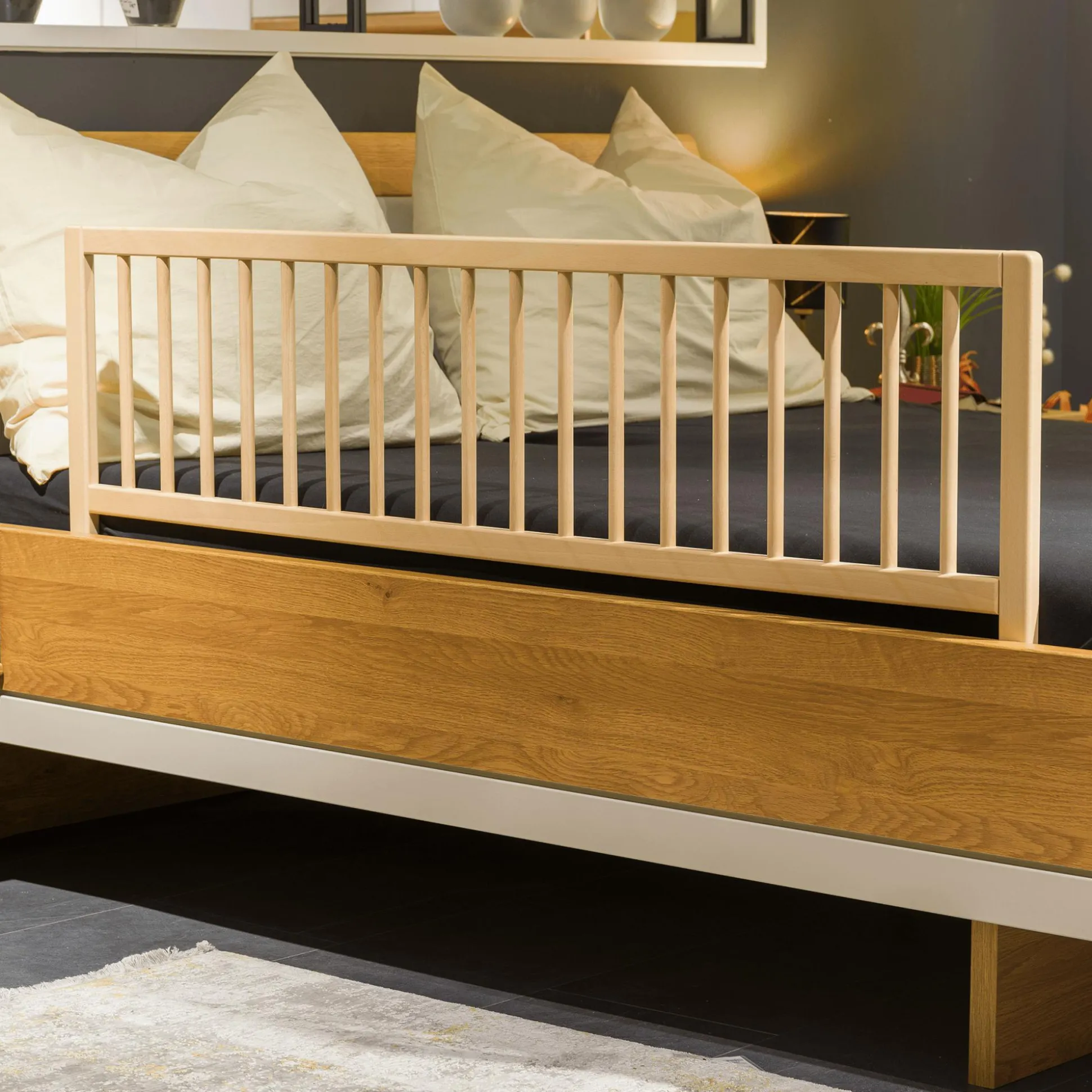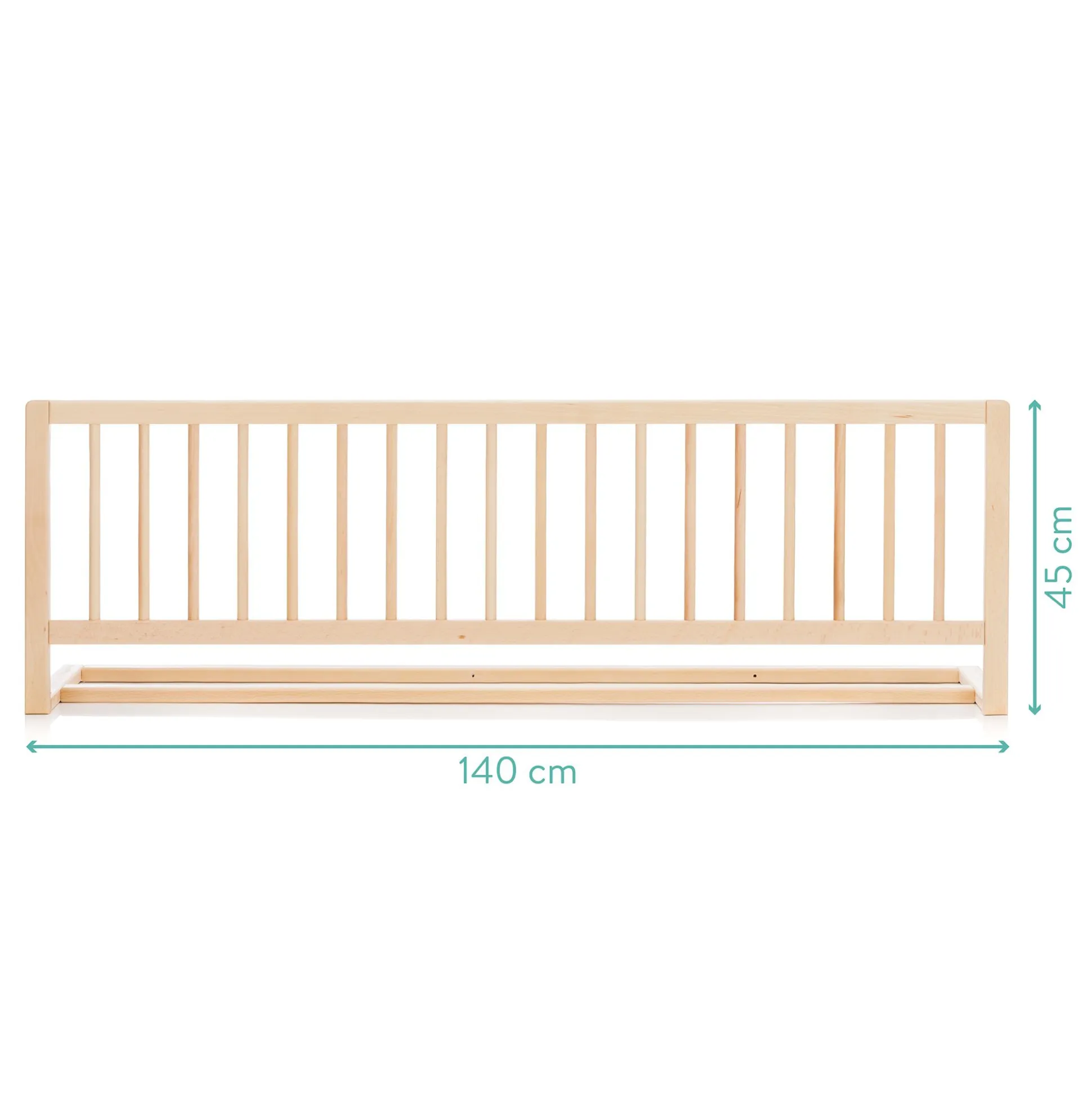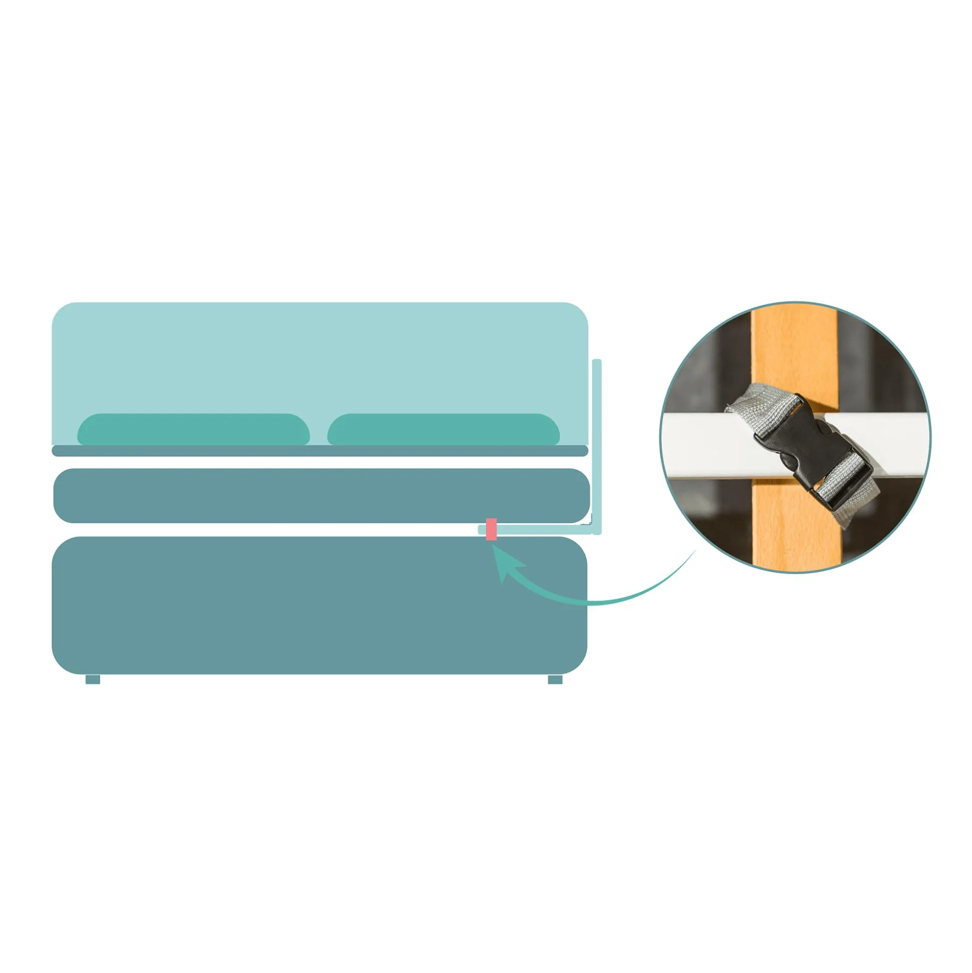 Es schütz dein Kind durch seine Größe und stabile Bauweise sicher und zuverlässig vor dem Herausfallen. Mit den inkludierten Befestigungsgurten lässt sich das naturfarbene Bettgitter sicher am Lattenrost fixieren.