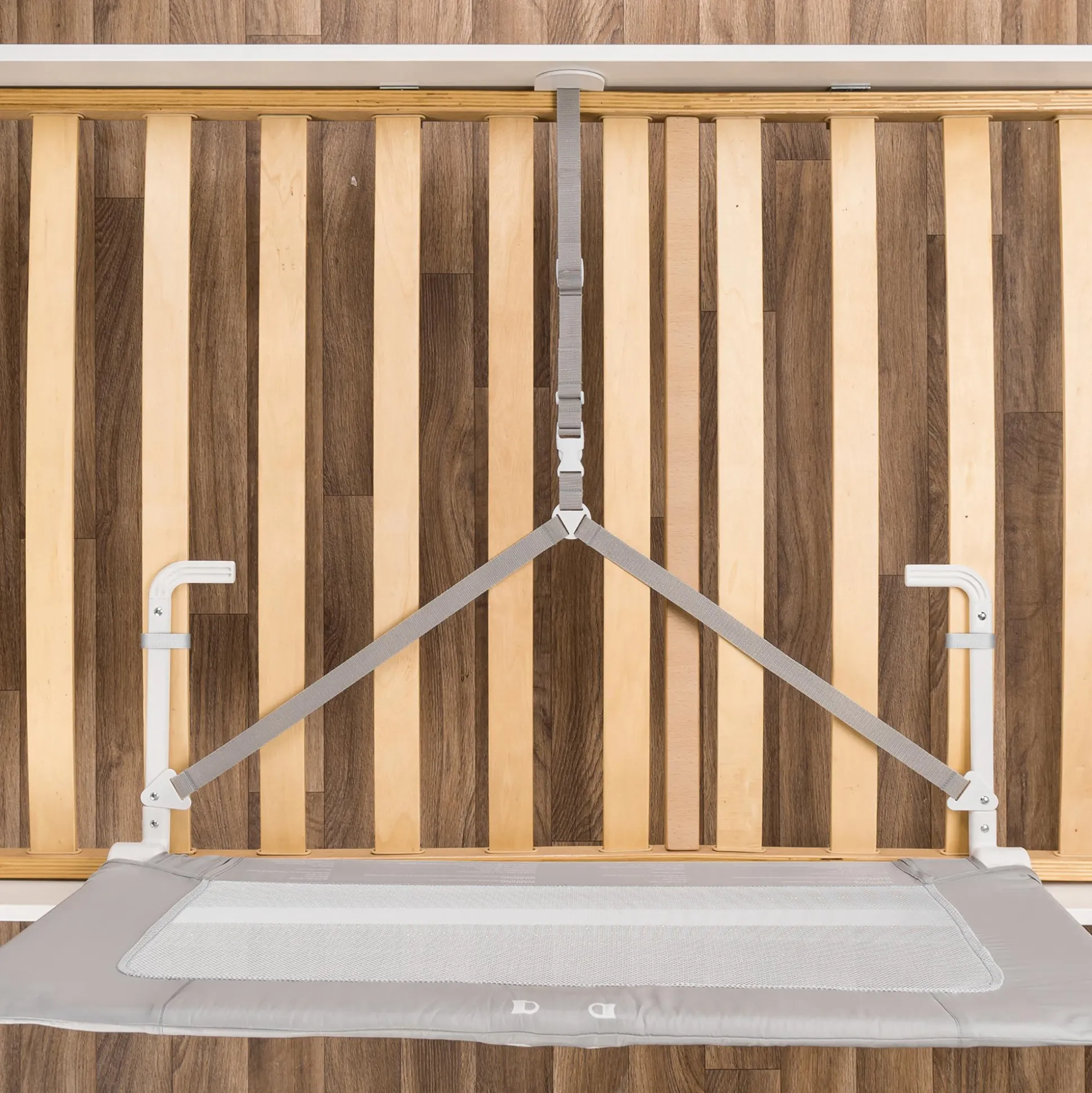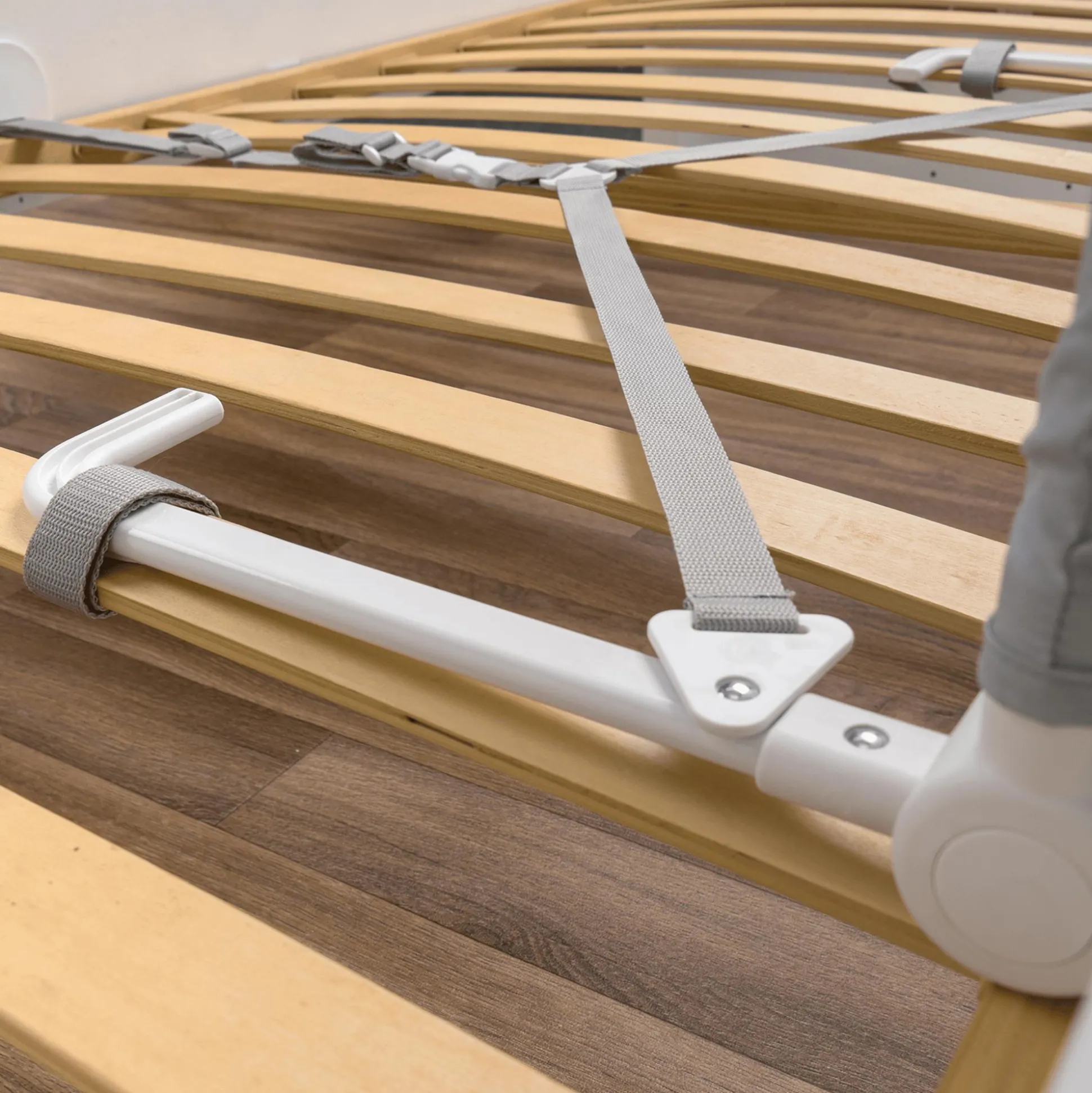 Dank dem beiliegendem Gurtsystem kannst du das Bettgitter schnell und sicher am Lattenrost befestigen. Das variabel verstellbare Sicherheitsband wird mit dem Bettgitter und einer Fixierplatte an der Gegenseite verbunden und verhindert so zuverlässig das Verrutschen oder Herausfallen des Bettgitters.