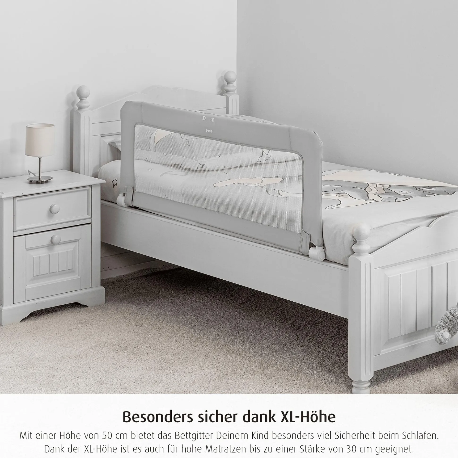 Mit der XL-Größe ist das Bettgitter auch für hohe Matratzen bis zu einer Stärke von ca. 30 cm geeignet. Die extra weiche und knisterfreie Nylonbespannung fühlt sich besonders angenehm an und sorgt nicht nur für Geborgenheit, sondern bietet auch Schutz vor schmerzhaften Stößen an dem Bettgitter.