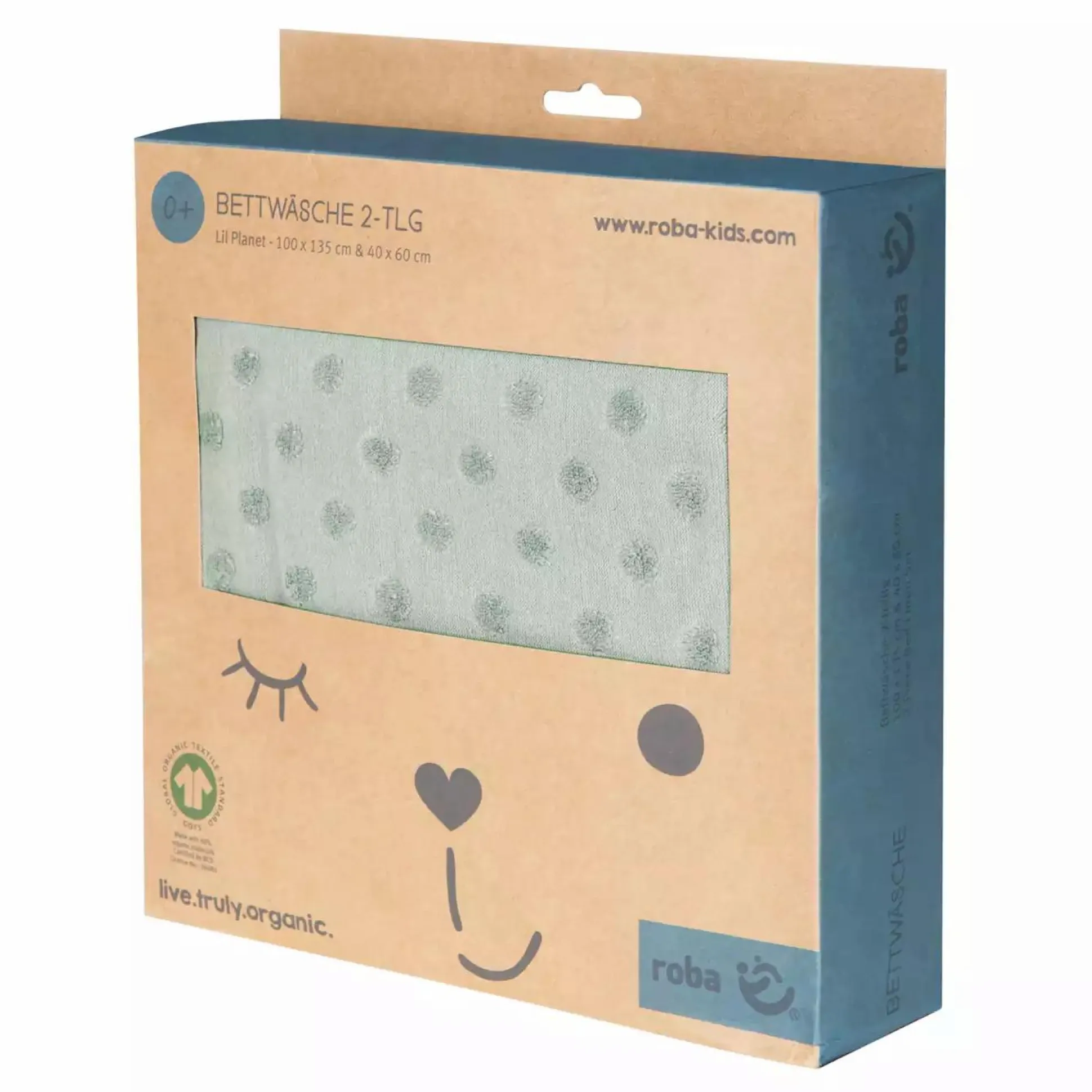 Die kuschelige Bettwäsche von Roba aus der „Lil Planet“ Kollektion sorgt mit ihrem hautfreundlichen, schadstofffreien, wasseraufnehmenden und extraweichen Jersey aus Bio-Baumwolle für ein kuscheliges und trockenes Gefühl im Babybett. Im niedlichen Design Frosty Green bietet sie deinem Baby höchsten Schlafkomfort.
