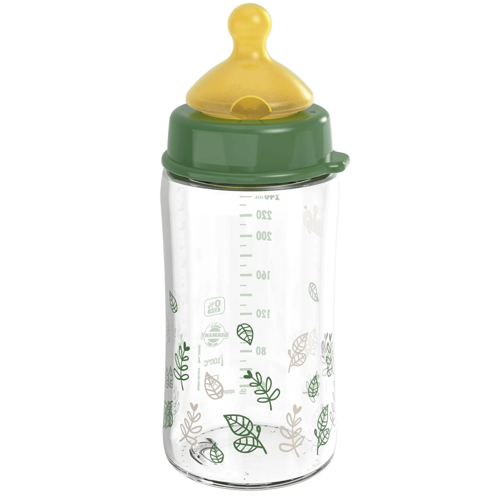 Die Weithalsflasche Cherry® Green aus Glas von nip® besitzt einen runden Weithalssauger aus weichem Natur-Latex mit Anti-Colic Ventil. Die runde Form des Weithalssaugers ist der Mutterbrust nachempfunden und sorgt so für ein natürliches Trinkgefühl – ideal in Kombination mit dem Stillen.