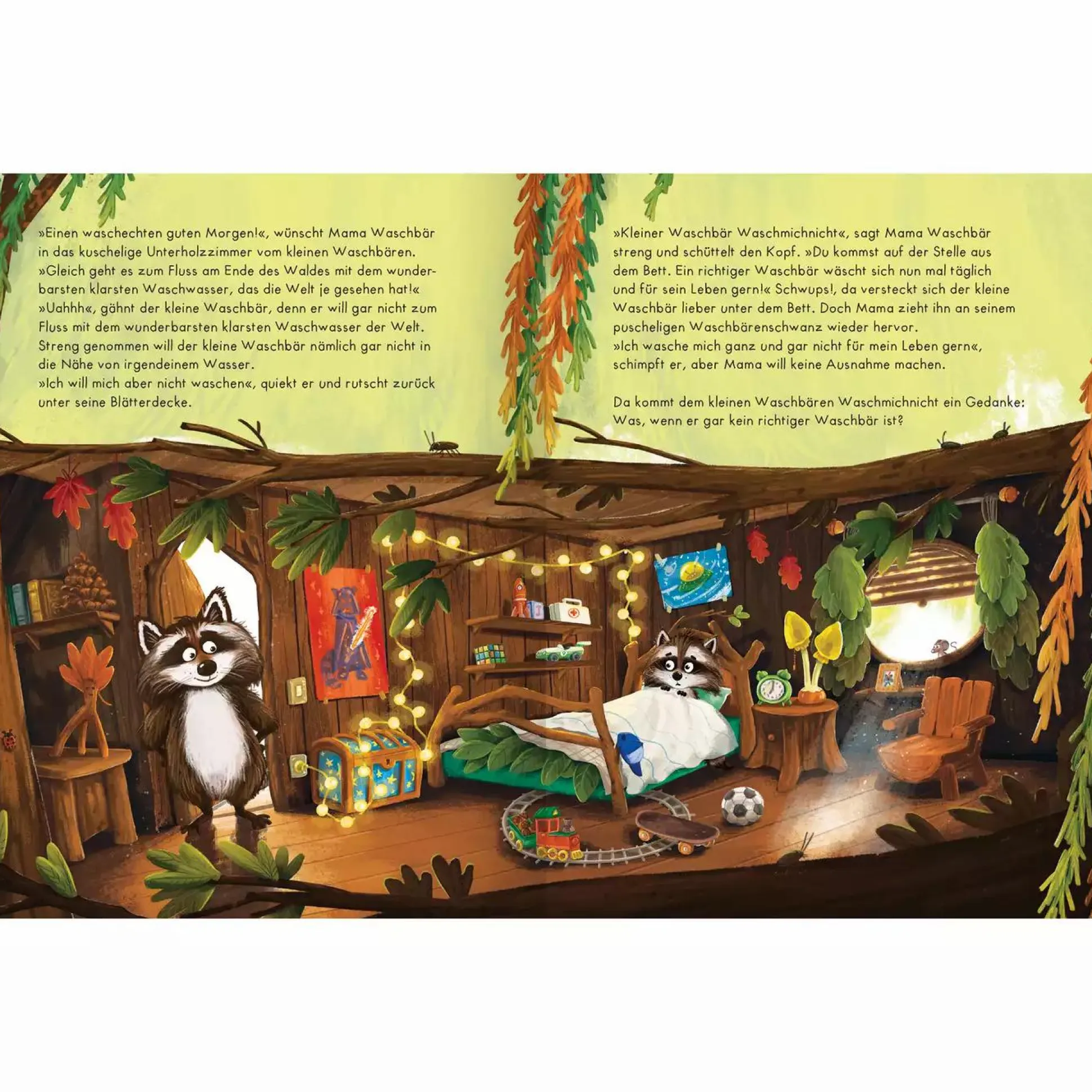 In dem Kinderbuch „Der kleine Waschbär Waschmichnicht“ geht es um den kleinen Waschbär Waschmichicht, der sich unter keinen Umständen waschen möchte. Er versteckt sich lieber unter seinem Bett, im tiefen Matsch bei den Schweinen oder in einer der Mülltonnen hinterm Wald. Zudem erklärt das Buch deinem kleinen Schatz spielerisch, wie wichtig es ist, sich zu waschen. Sieht auch der kleine Waschbär das am Ende ein und sollte er das mit dem Waschen doch einmal probieren?