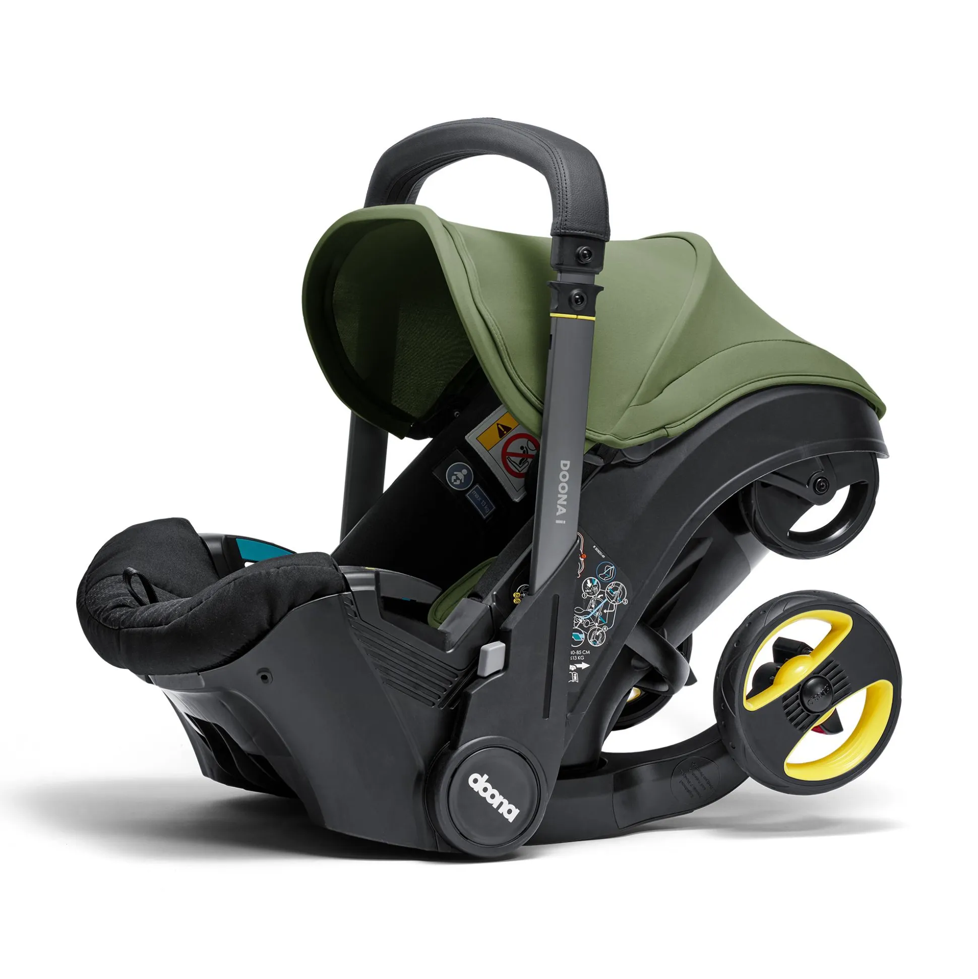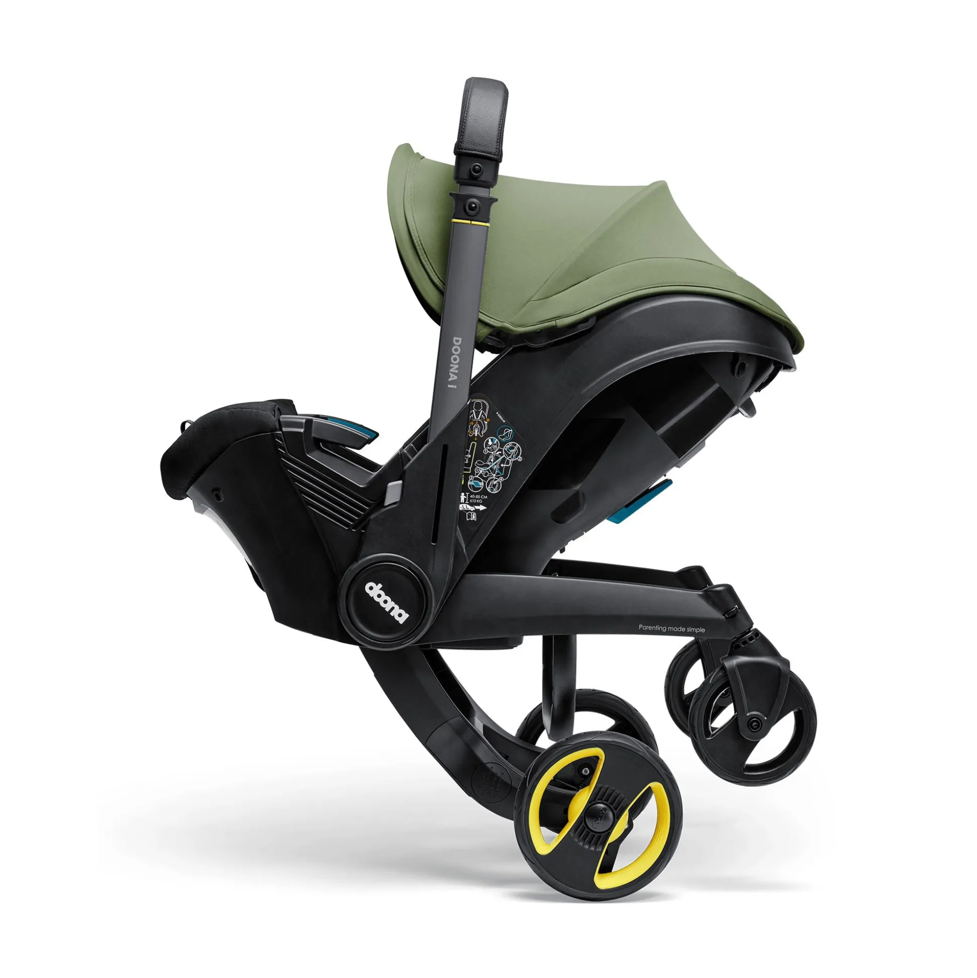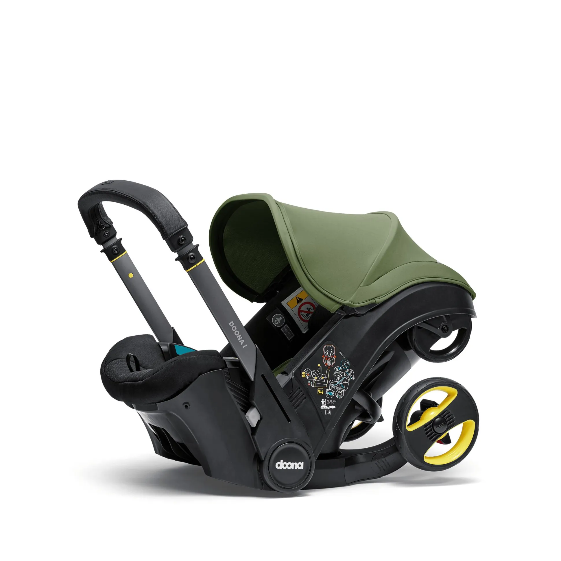 Ebenso komfortabel ist die Ausstattung. Von der herausnehmbaren Neugeborenen-Einlage über die verstellbare Kopfstütze mit mitwachsendem 5-Punkt-Gurtsystem bis zum Tragegriff mit edlem Kunstlederbezug, der beim Autofahren als Rückprallschutz fungiert und bei der Nutzung als Kinderwagen zum ausziehbaren Schiebebügel wird: Bei der Entwicklung des Doona i wurde an wirklich alles gedacht.