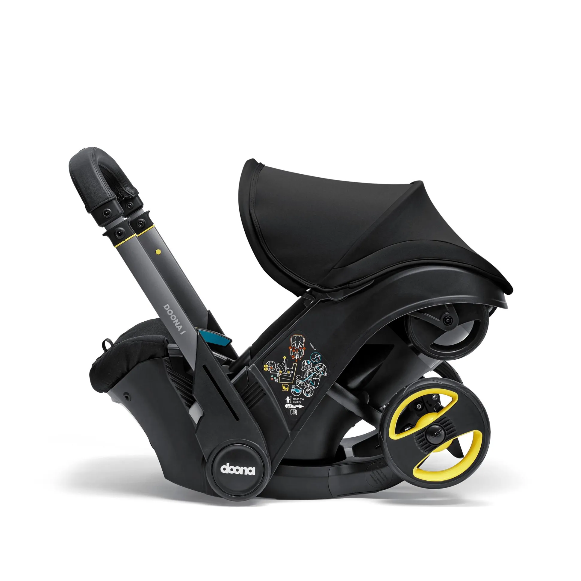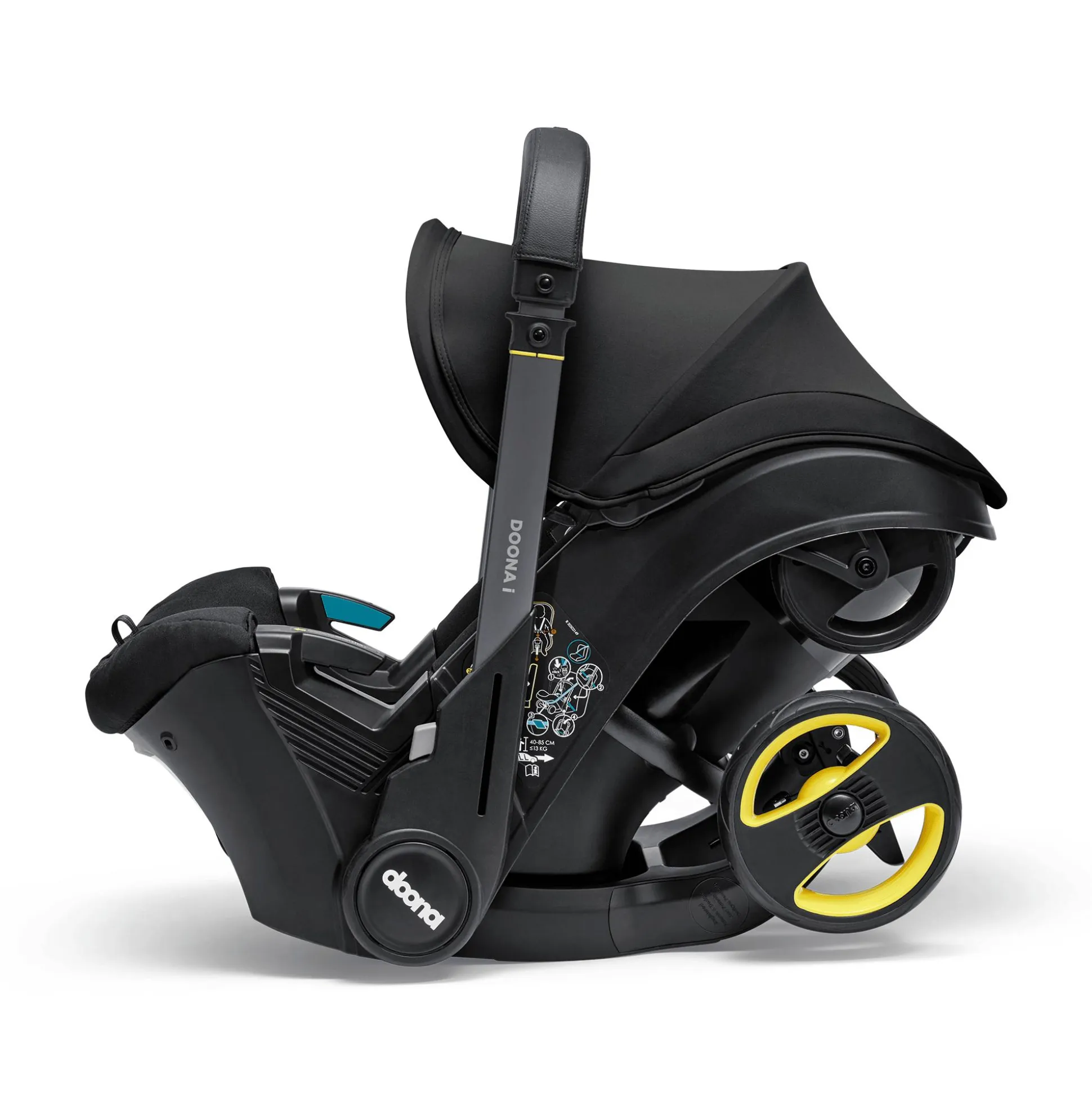 Ebenso komfortabel ist die Ausstattung. Von der herausnehmbaren Neugeborenen-Einlage über die verstellbare Kopfstütze mit mitwachsendem 5-Punkt-Gurtsystem bis zum Tragegriff mit edlem Kunstlederbezug, der beim Autofahren als Rückprallschutz fungiert und bei der Nutzung als Kinderwagen zum ausziehbaren Schiebebügel wird: Bei der Entwicklung des Doona i wurde an wirklich alles gedacht.