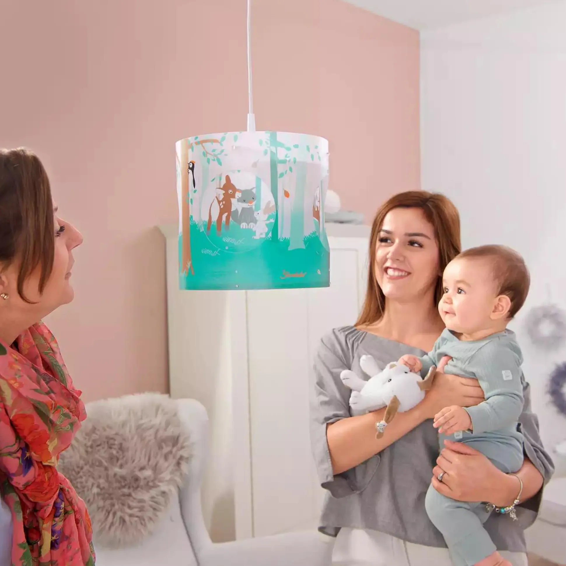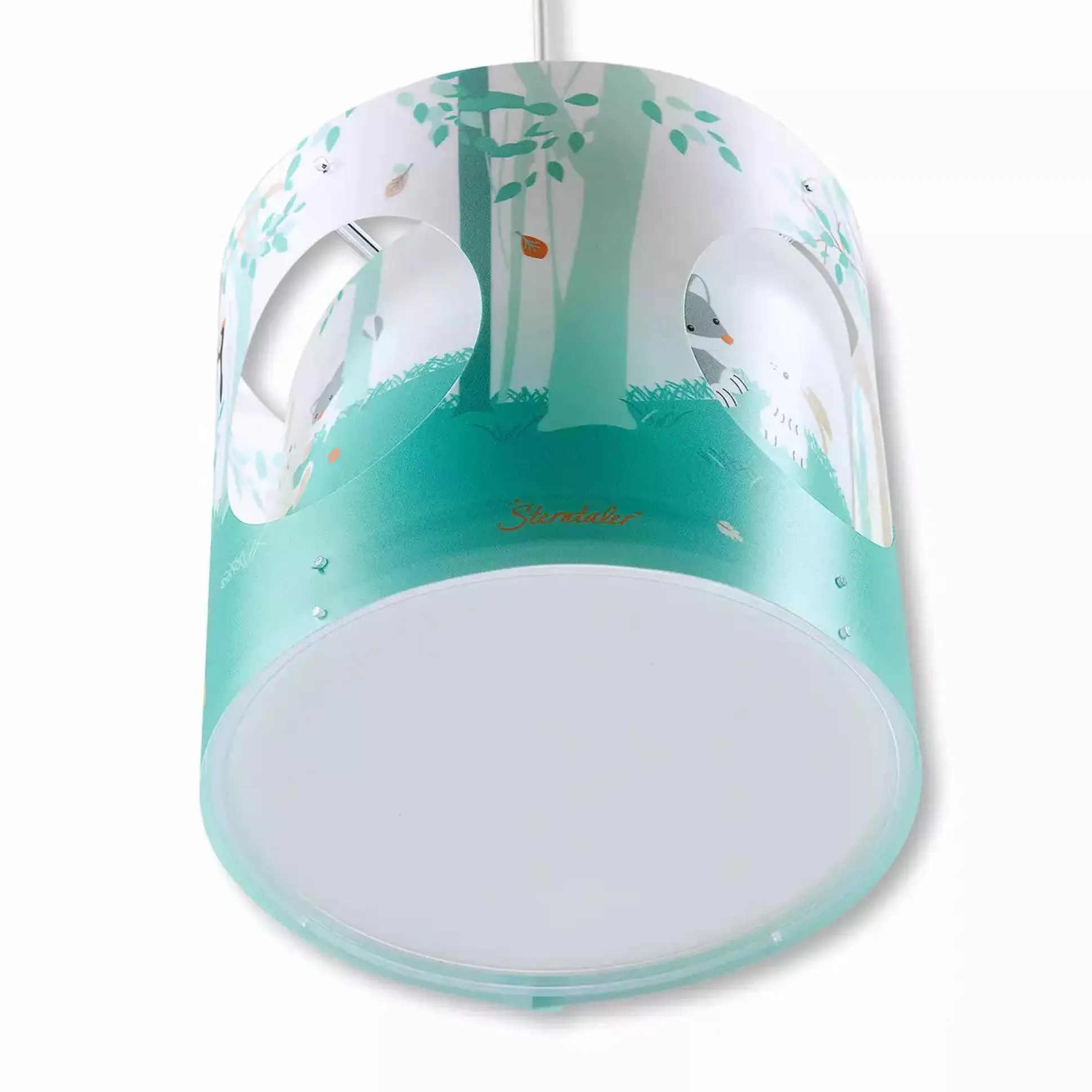 Die besten Freunde Hase Hoppel, Fuchs Filou und Reh Rosie begeben sich auf der Sterntaler Drehpendel-Lampe Waldis auf eine lustige Reise. Im Wald zwischen Bäumen und Pilzen haben die drei Freunde viel Spaß und erleben tolle Abenteuer. Diese supersüße Deckenlampe hat eine besonders zauberhafte Seite: Durch das Anschalten der Lampe beginnt sich der innere Schirm zu drehen. Im Zusammenspiel mit dem Außenschirm können Eltern ihren Babys tolle Geschichten aus dem Wald erzählen und die Kleinen bestaunen das Geschehen auf der Drehpendel-Lampe Waldis von Sterntaler.