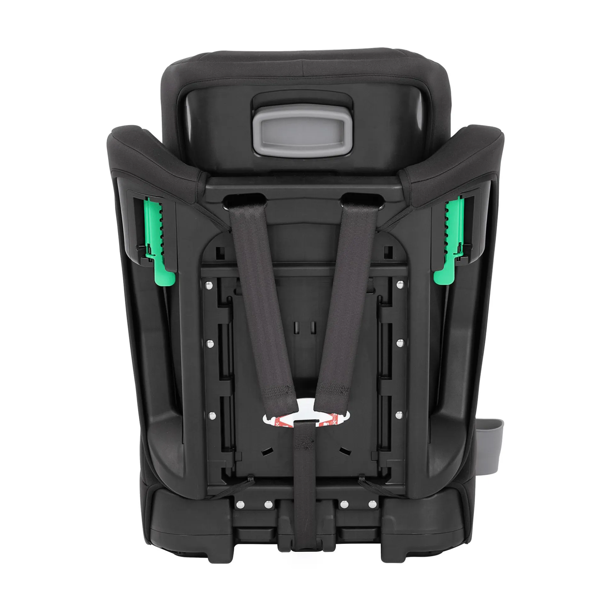- grün gekennzeichnete Gurtführungshilfen und Befestigungsclips für den Fahrzeuggurt auf der Rückseite machen das sichere Anschnallen einfach und intuitiv