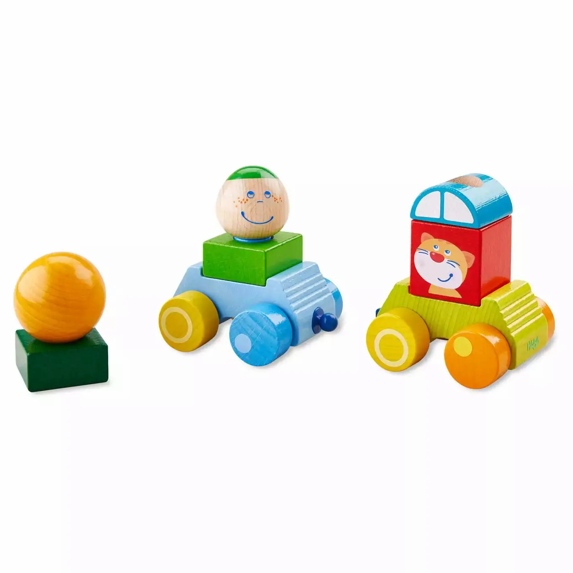 Mit dem bunten Entdeckerauto Anton von Haba können kleine Abenteurer die Welt um sich herum erkunden. Das farbenfrohe Auto mit Anhänger ist ein vielseitiges Holzspielzeug, das zum Bauen, Stecken, Fahren und Entdecken anregt. Die beiden Holzautos lassen sich dank praktischer Kupplung einfach verbinden und Steckfigur Paul aus Kugel und Rundstab kann immer wieder in seinen kleinen Wagen gesetzt oder herausgenommen werden. Dank Steckvorrichtung können auch im zweiten Wagen kleine Bausteine als wertvolle Fracht transportiert werden. Der rote Würfel mit Katzenmotiv und die kleine Holzkugel bringen zusätzlich Farbe und Spaß ins Spiel.