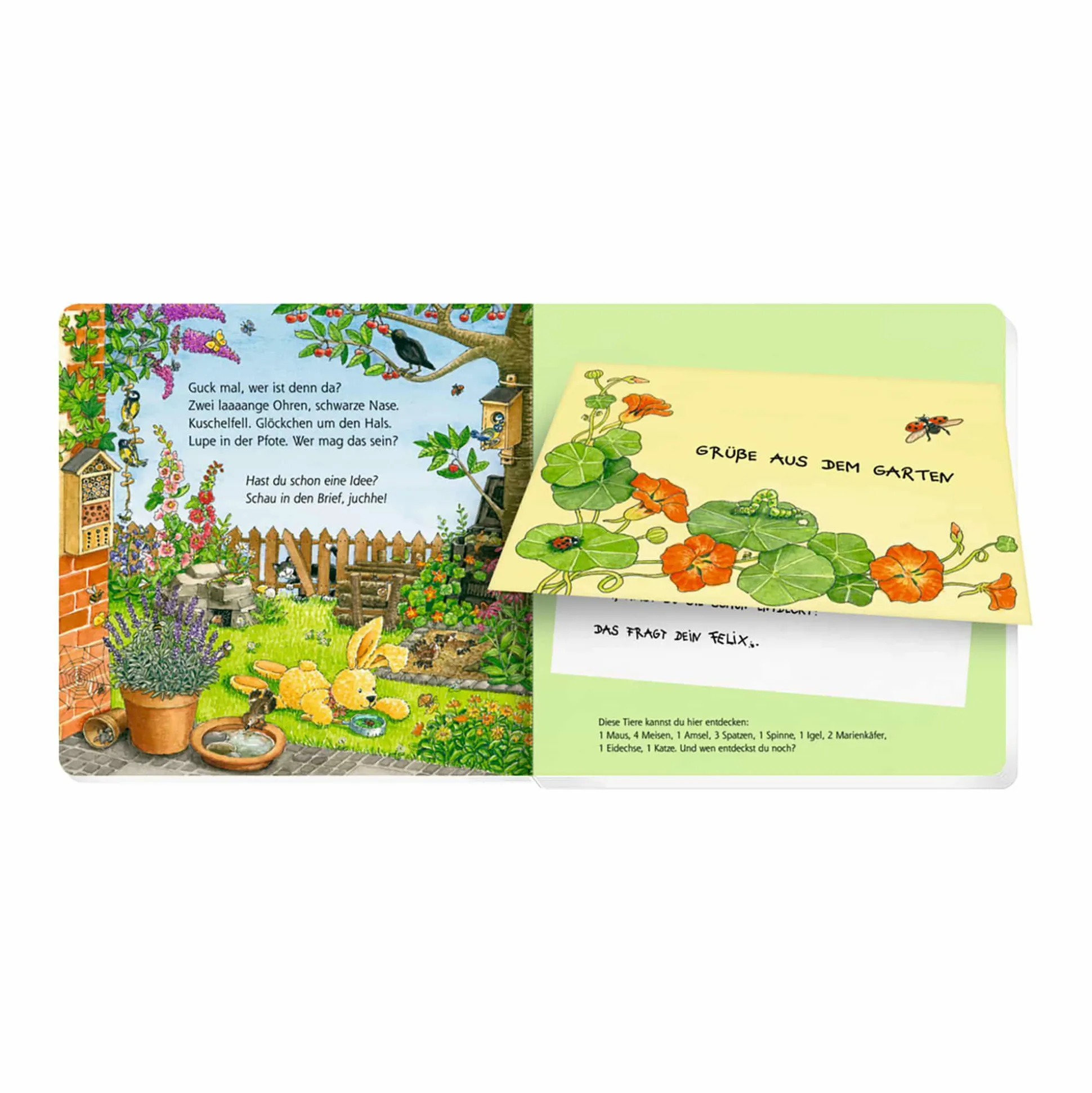 - hinter großen Klappen verbergen sich Briefe, in denen Felix von großen und kleinen Tieren in unserer Umgebung erzählt