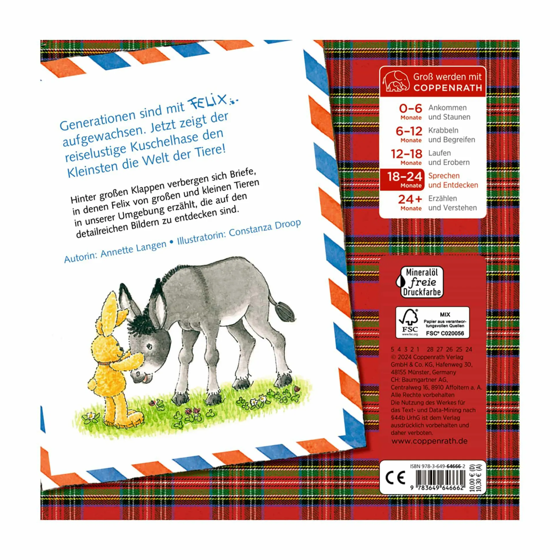 Generationen sind mit Felix aufgewachsen. Jetzt zeigt der reiselustige Kuschelhase den Kleinsten die Welt der Tiere! Hinter großen Klappen des Pappbilderbuches verbergen sich Briefe, in denen Felix von großen und kleinen Tieren in unserer Umgebung erzählt, von denen unzählige auf den wimmeligen Bildern zu entdecken sind.